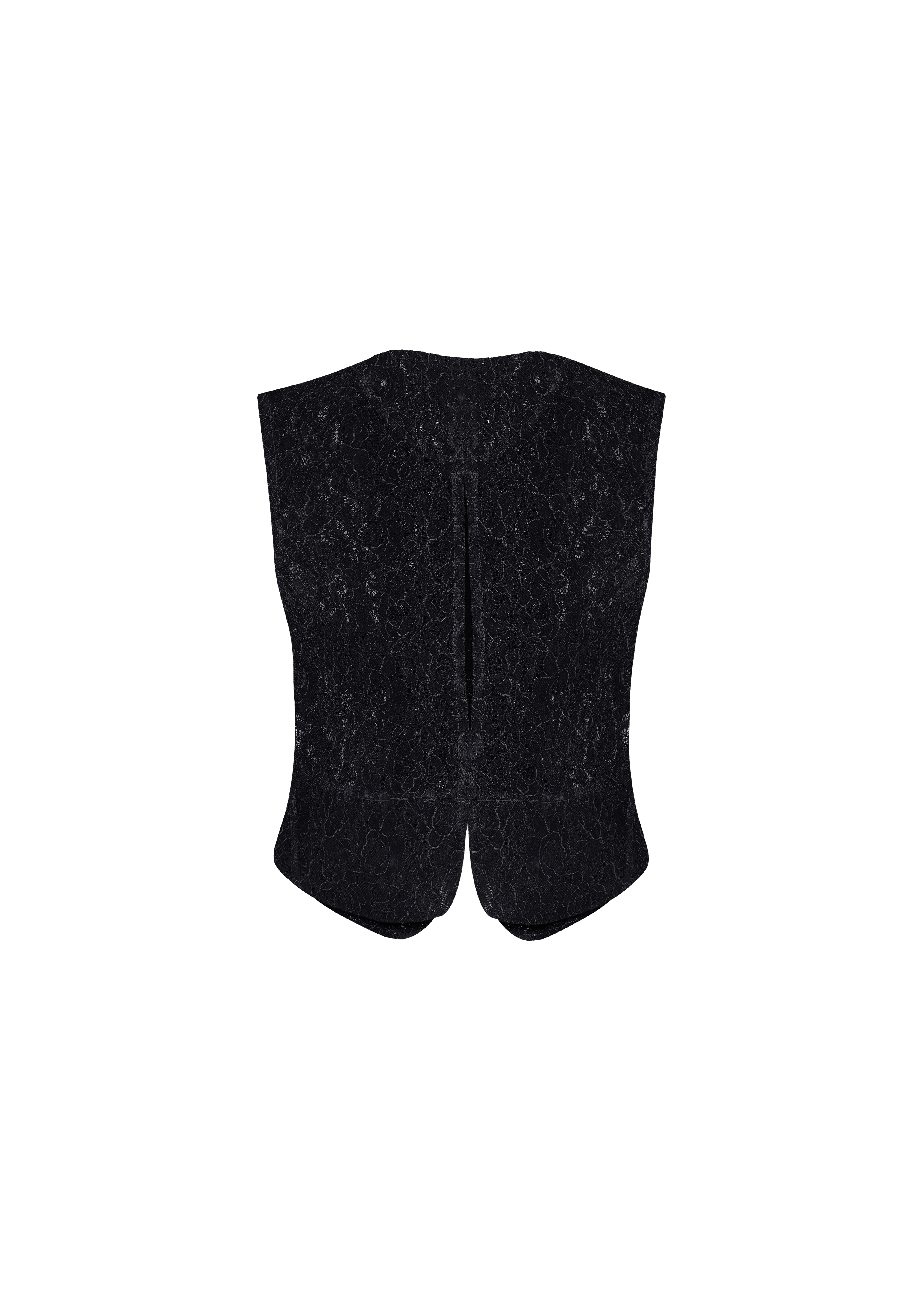 Жилет Allure, виготовлений з чорного мережива з квітами, має унікальний виріз на спині, що додає нотку інтриги загальному образу. Жилет застібається на два ґудзики, обтягнутий атласною тканиною, та має імітацію клапанів спереду.