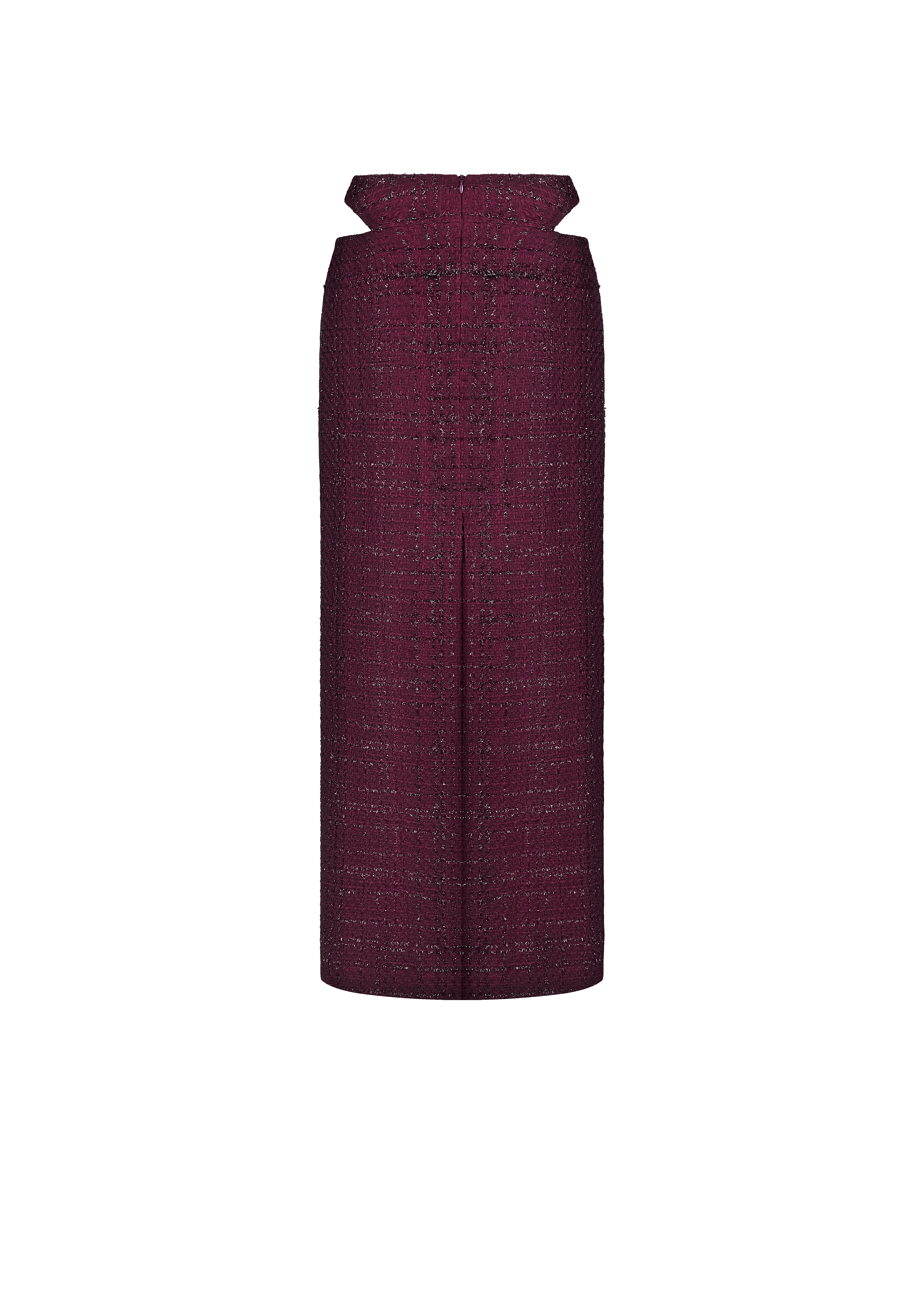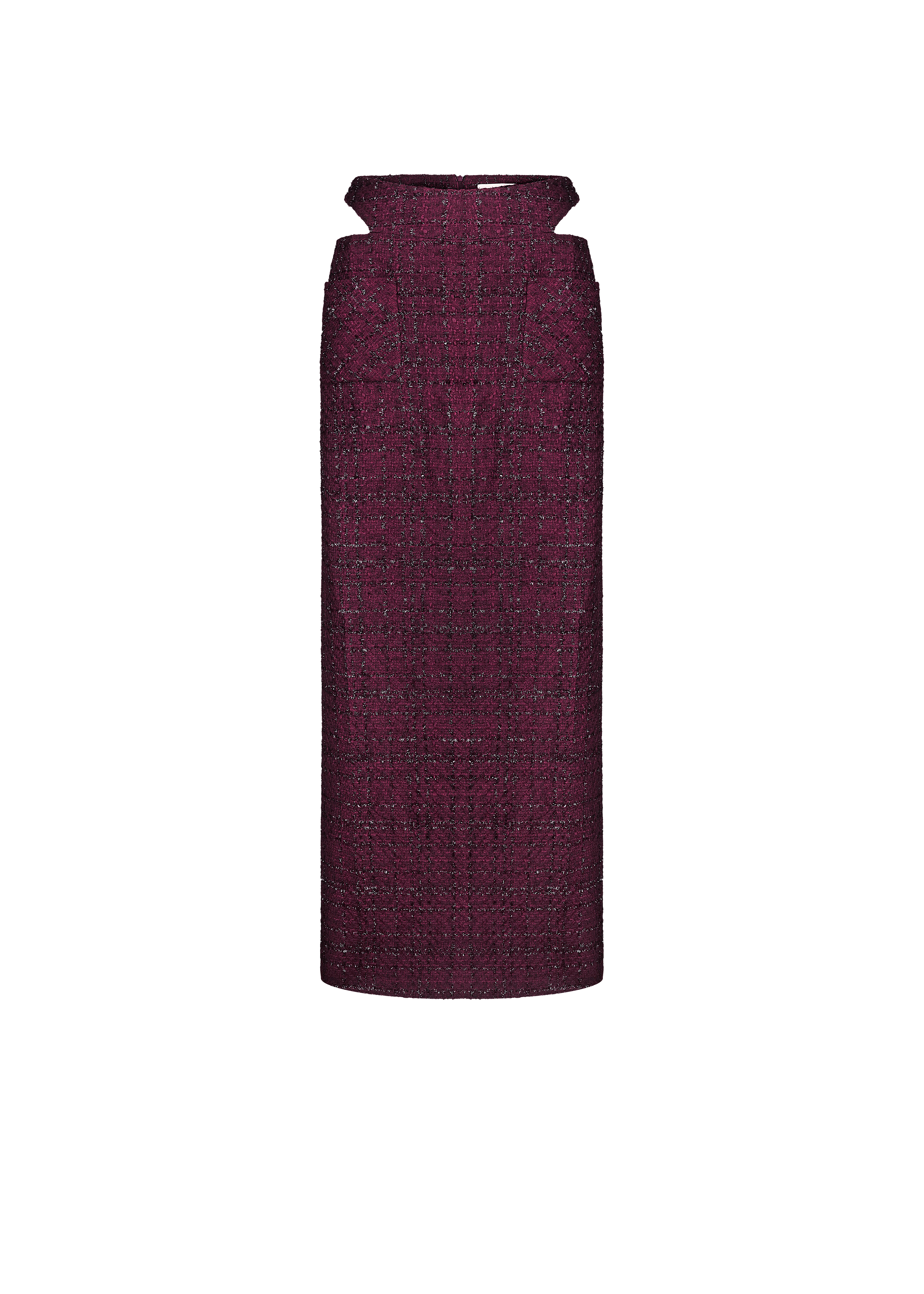 Спідниця Maddy з твіду з люрексом має елегантний прямий силует зі структурованими передніми кишенями та ефектним вигнутим поясом. Разом із жилетом Linda з тієї ж тканини вони утворюють вражаючий ансамбль, який переосмислює стиль елегантного одягу з ноткою жіночності.