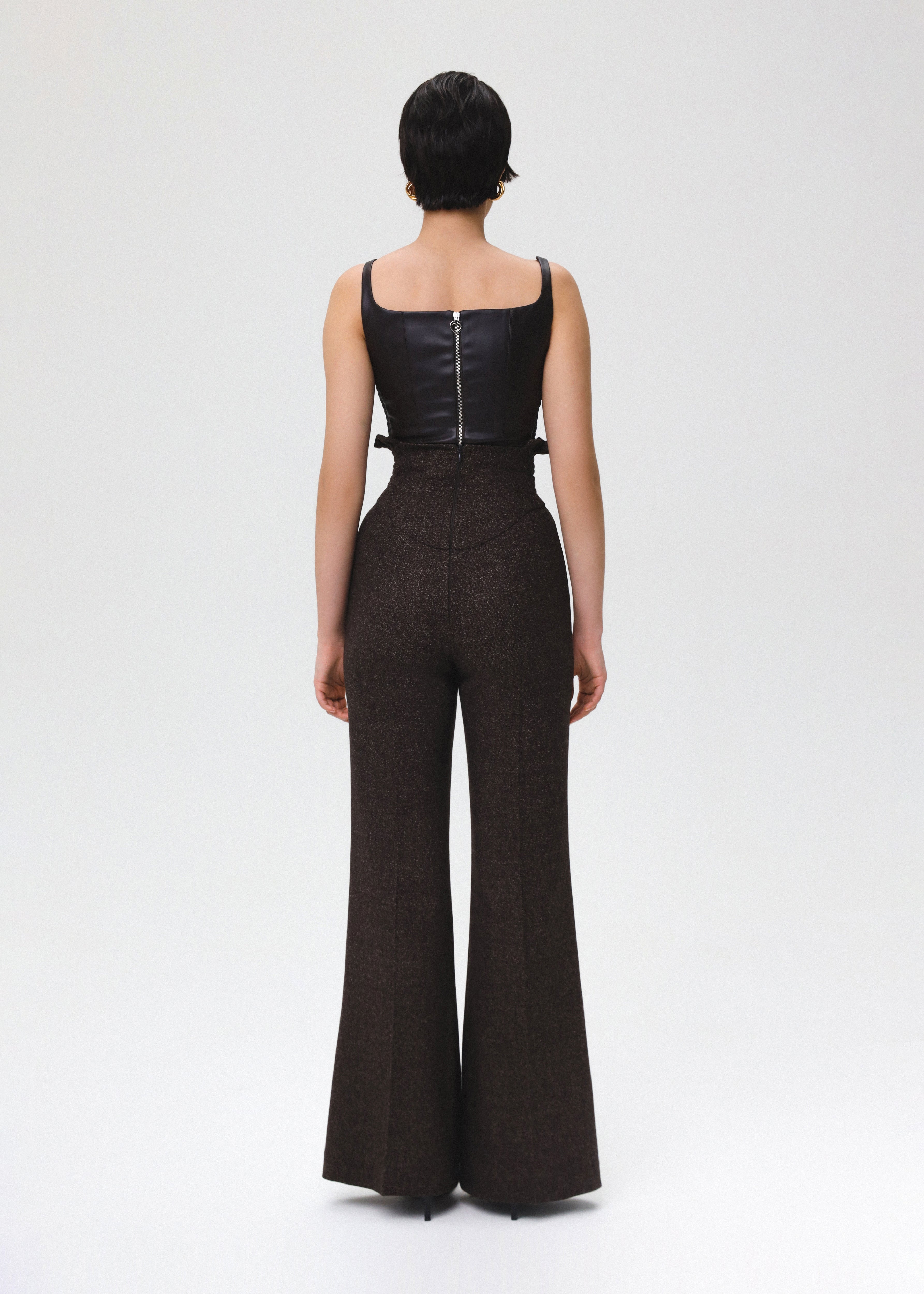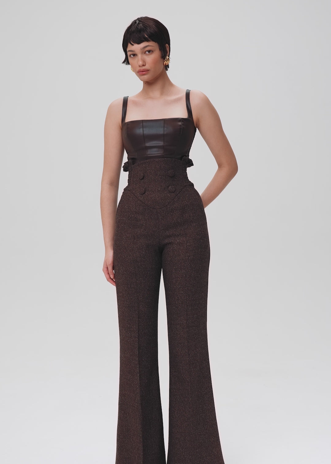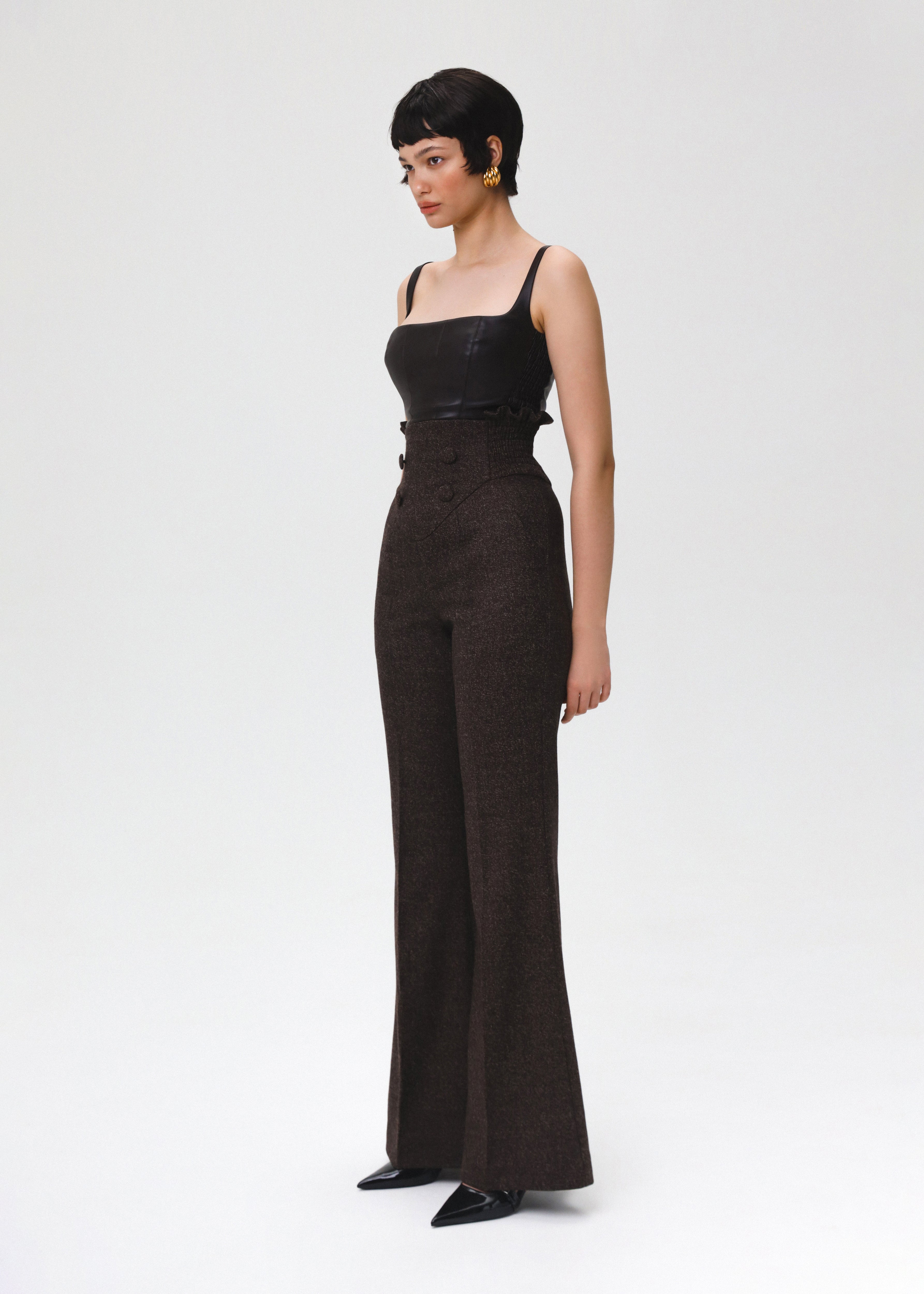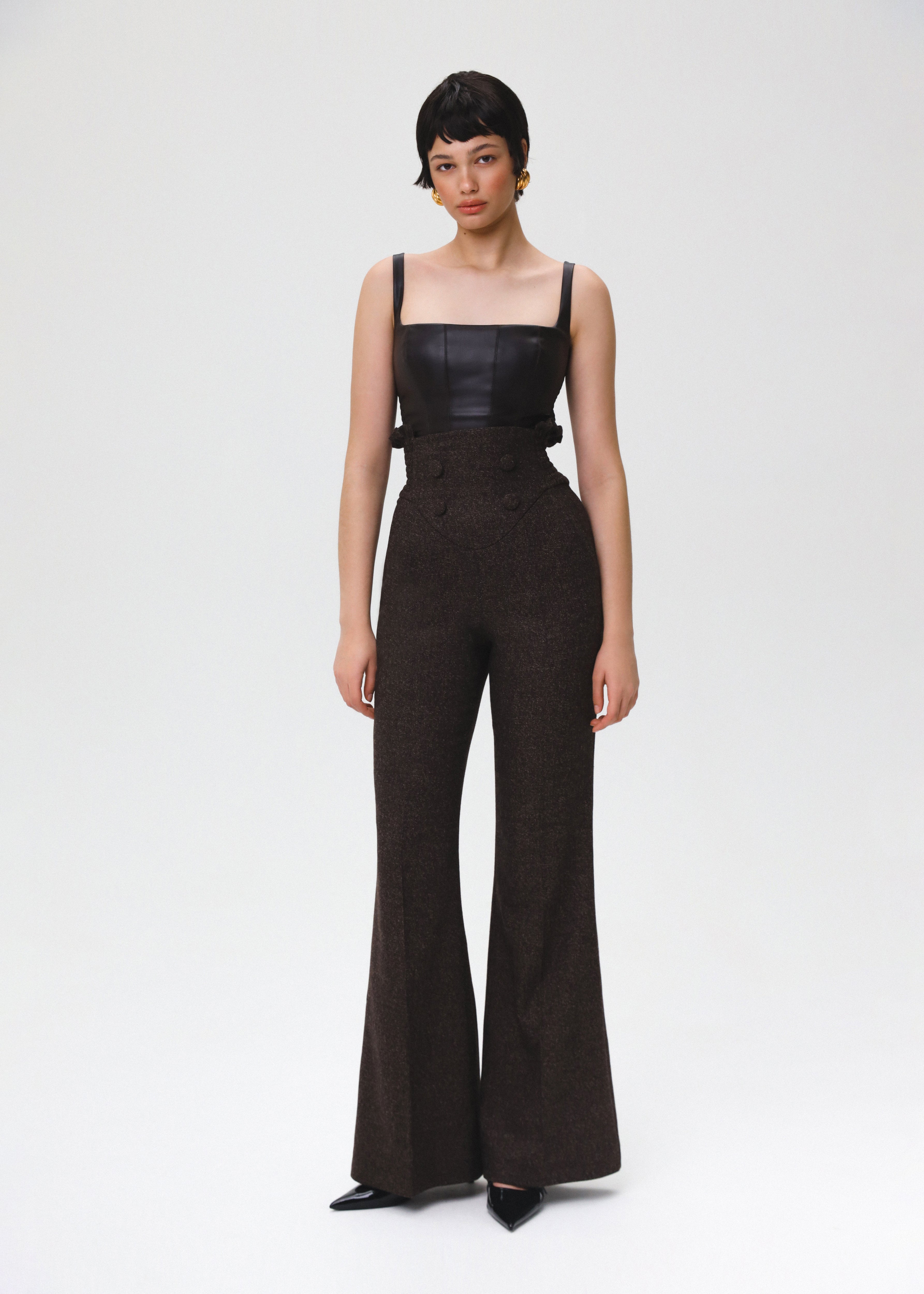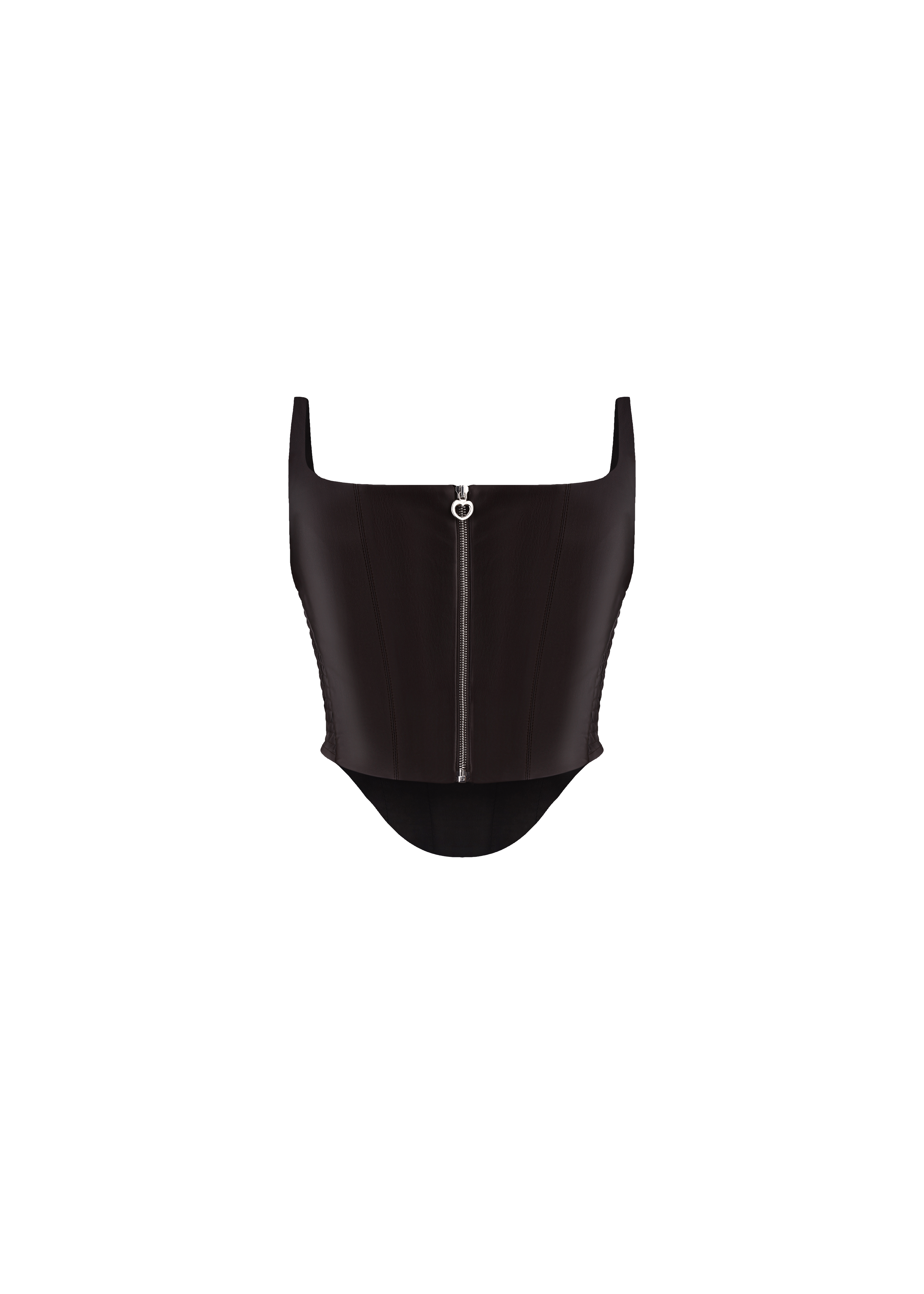 Виготовлений з темно-коричневої екошкіри, цей топ має квадратний виріз горловини та вигнутий поділ, що поєднуючись створюючи витончений силует. Розроблений з урахуванням комфорту, він має еластичні вставки з боків. Застібається на блискавку та має підкладку.