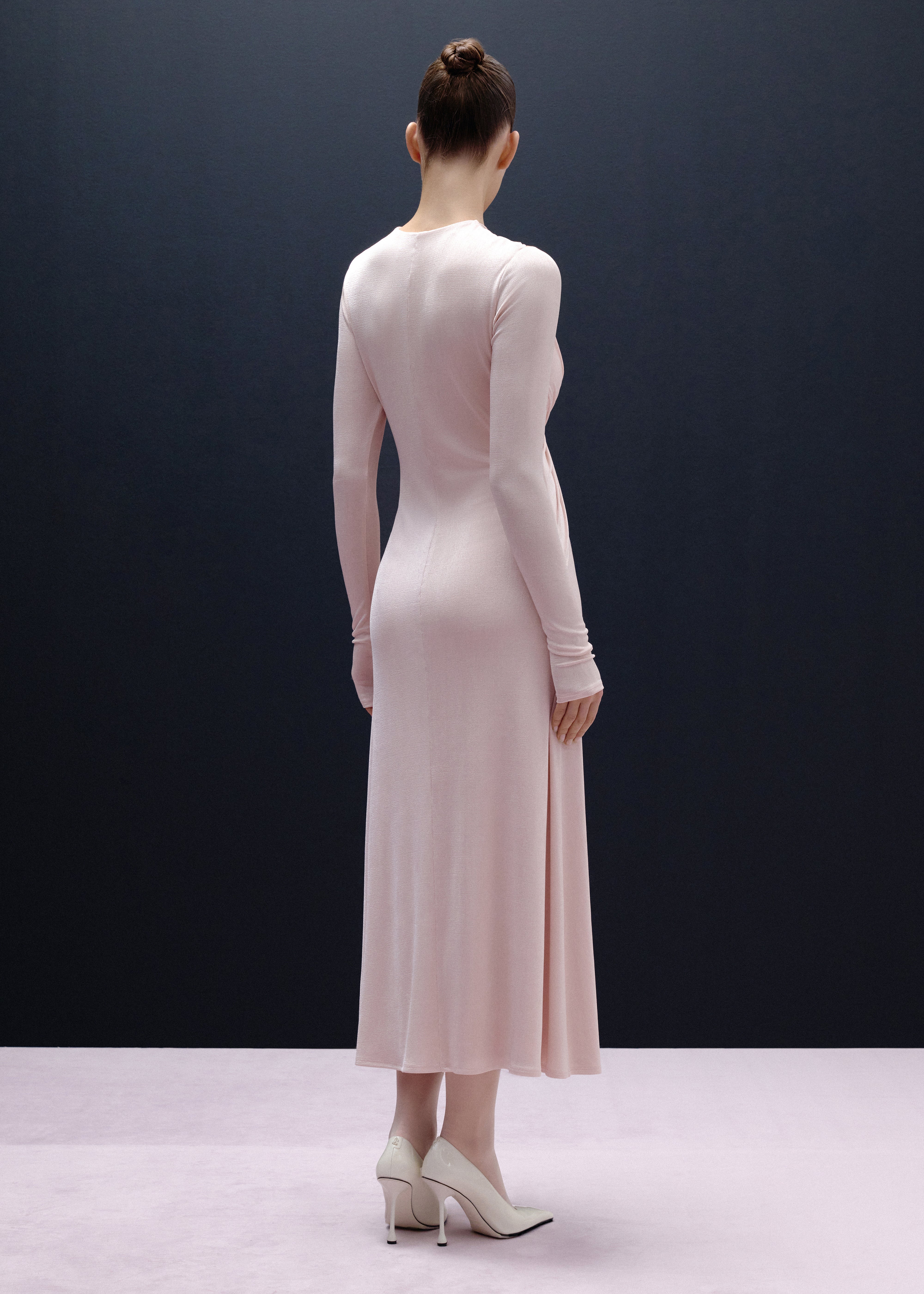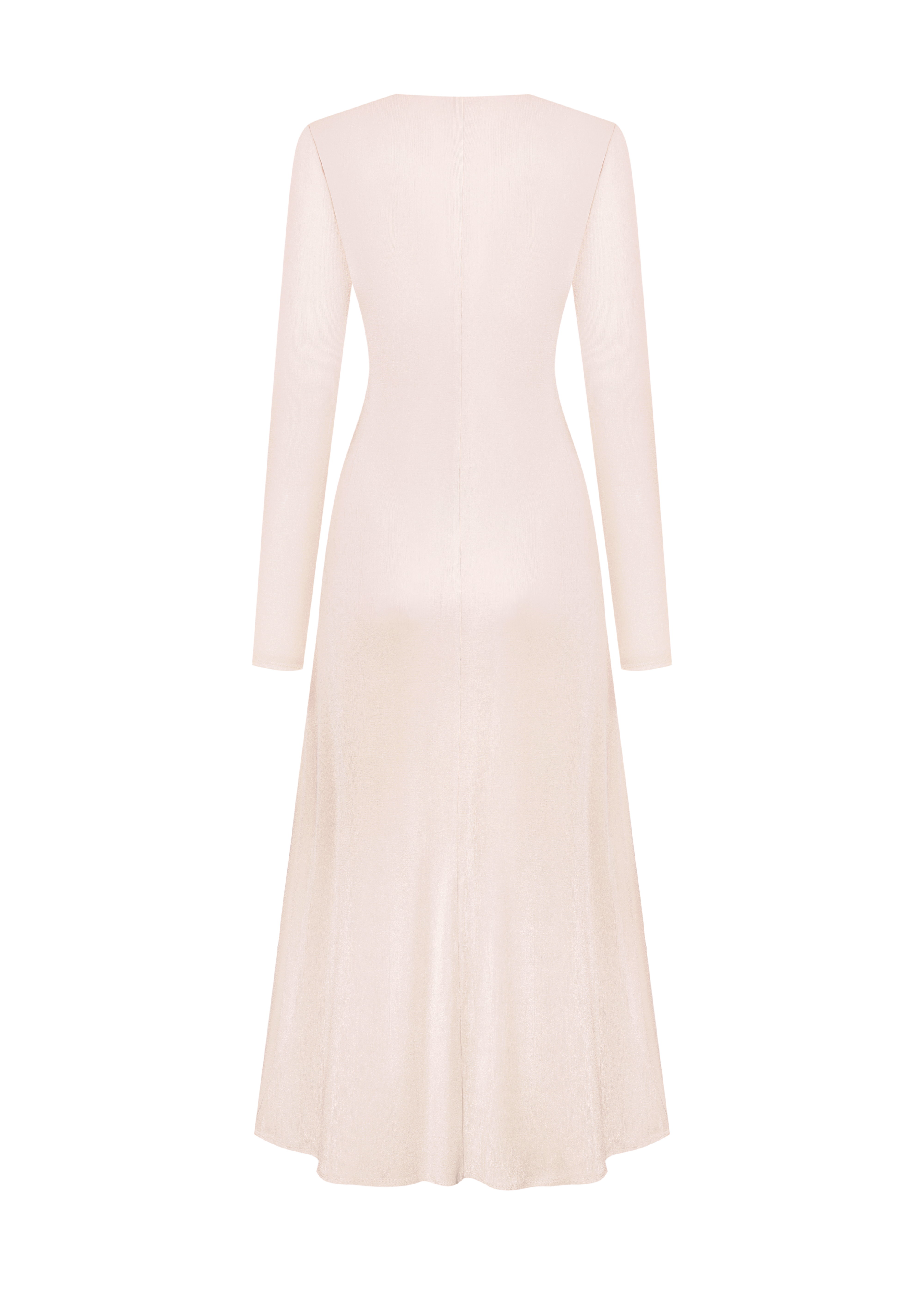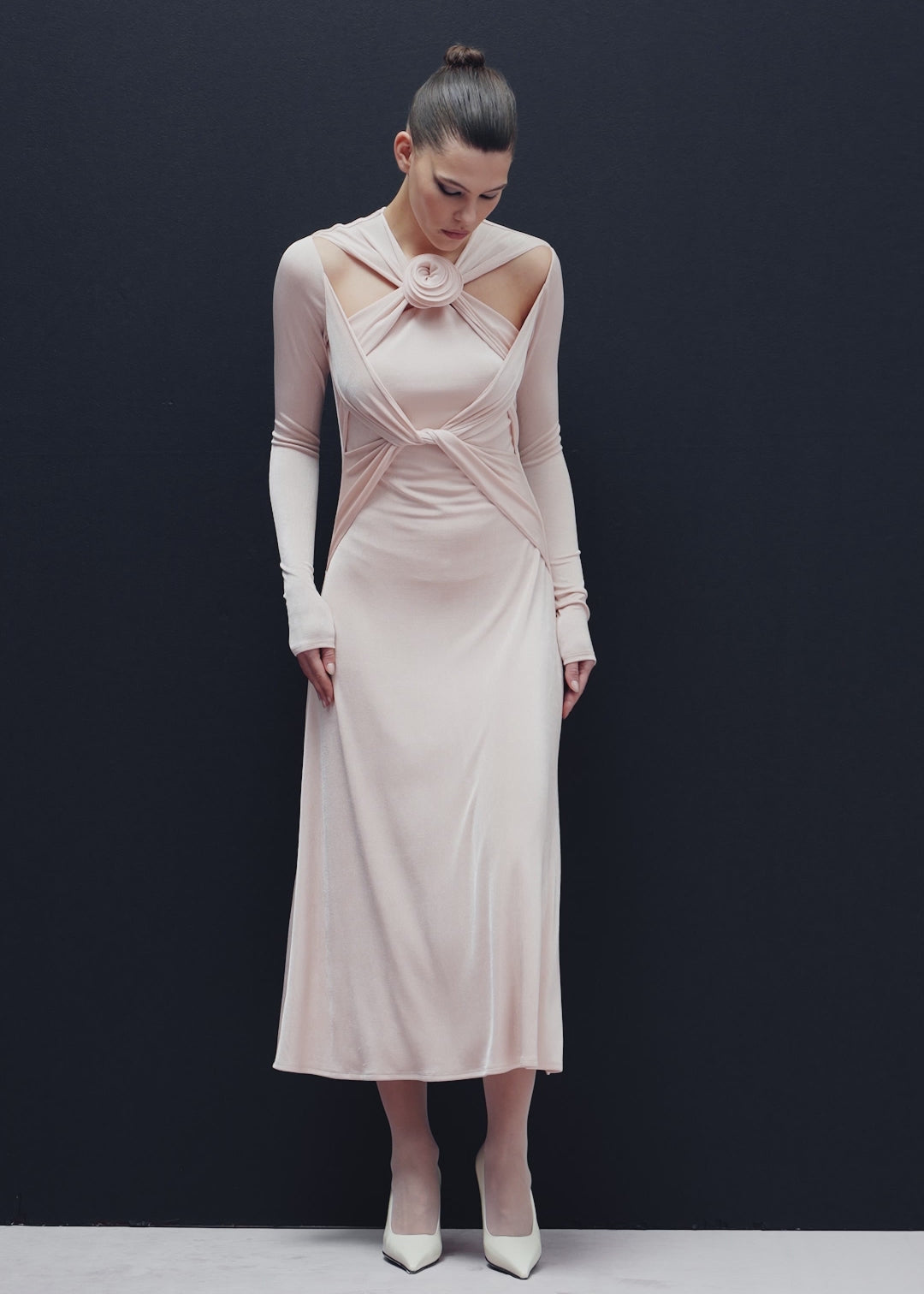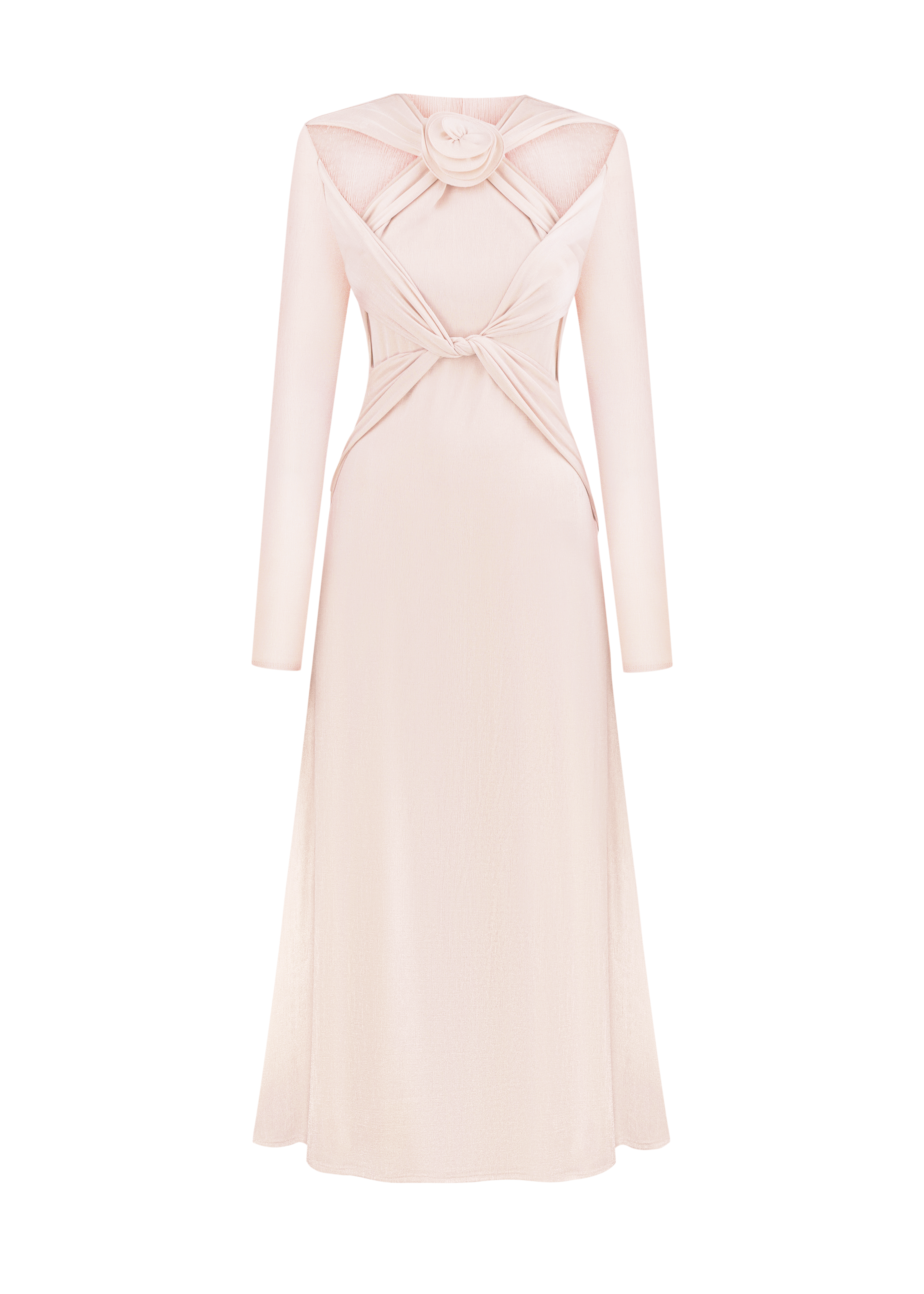 Сукня максі з довгими рукавами бездоганно поєднує сучасну вишуканість з комфортом, створюючи образ, який є одночасно вишуканим та невимушеним. Прикрашена вирізами, складними вузлами та квітами ручної роботи, вона випромінює шарм та індивідуальність. Ідеально підходить для тих, хто цінує поєднання простоти та вражаючих деталей у своєму гардеробі, ця сукня неодмінно приверне увагу, куди б ви не пішли.