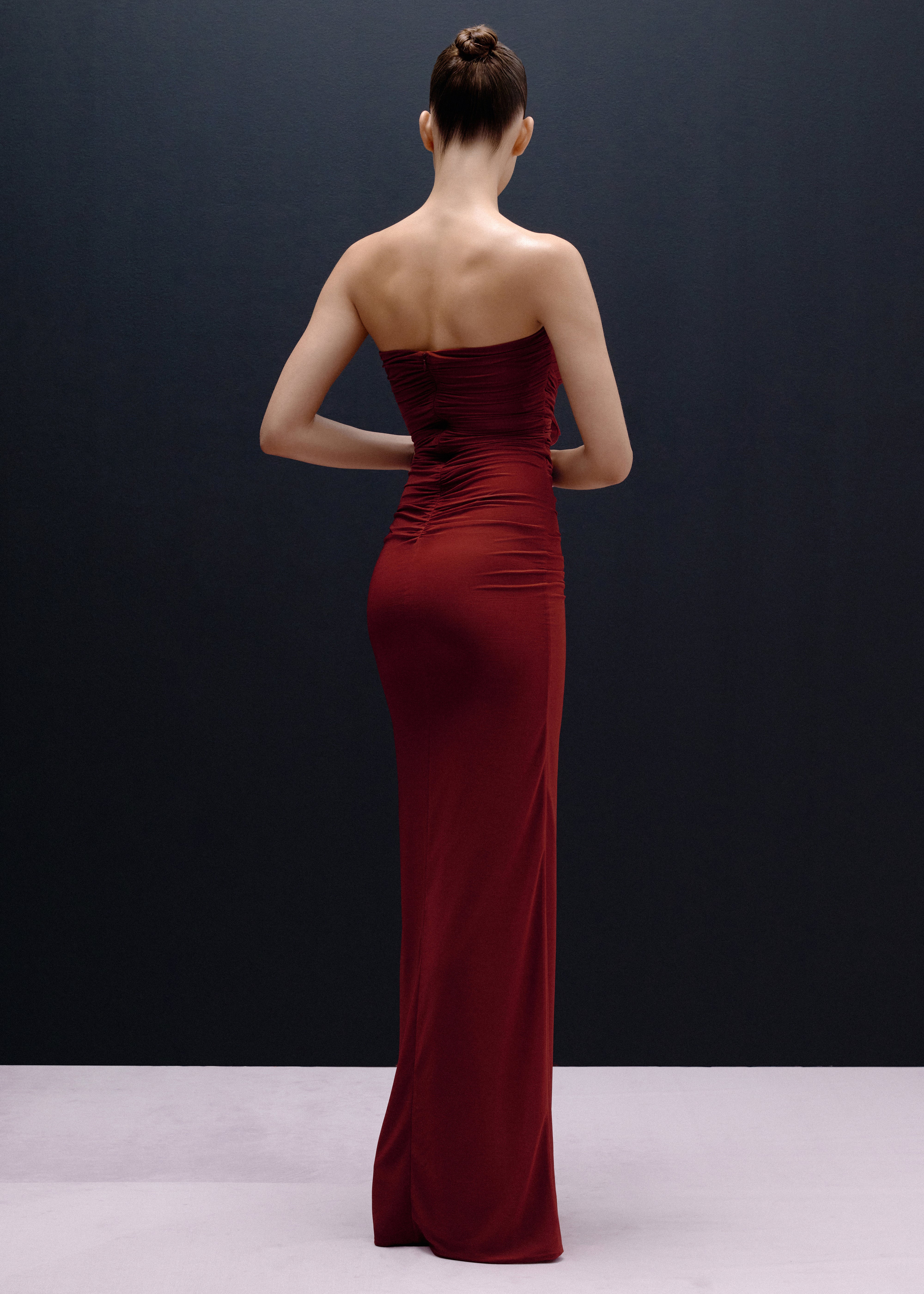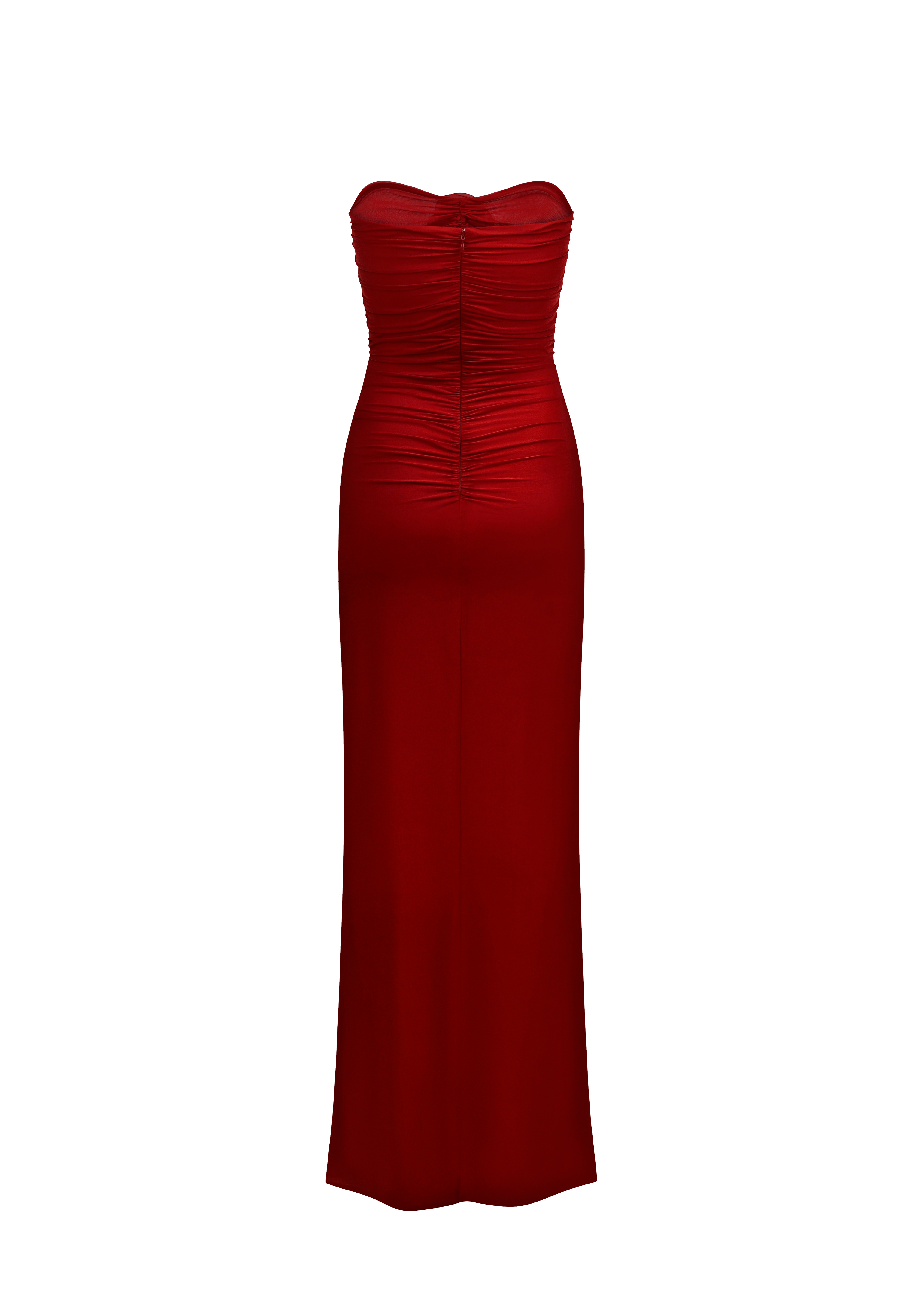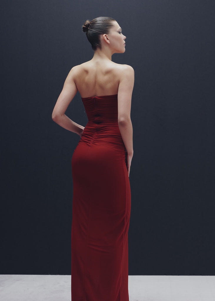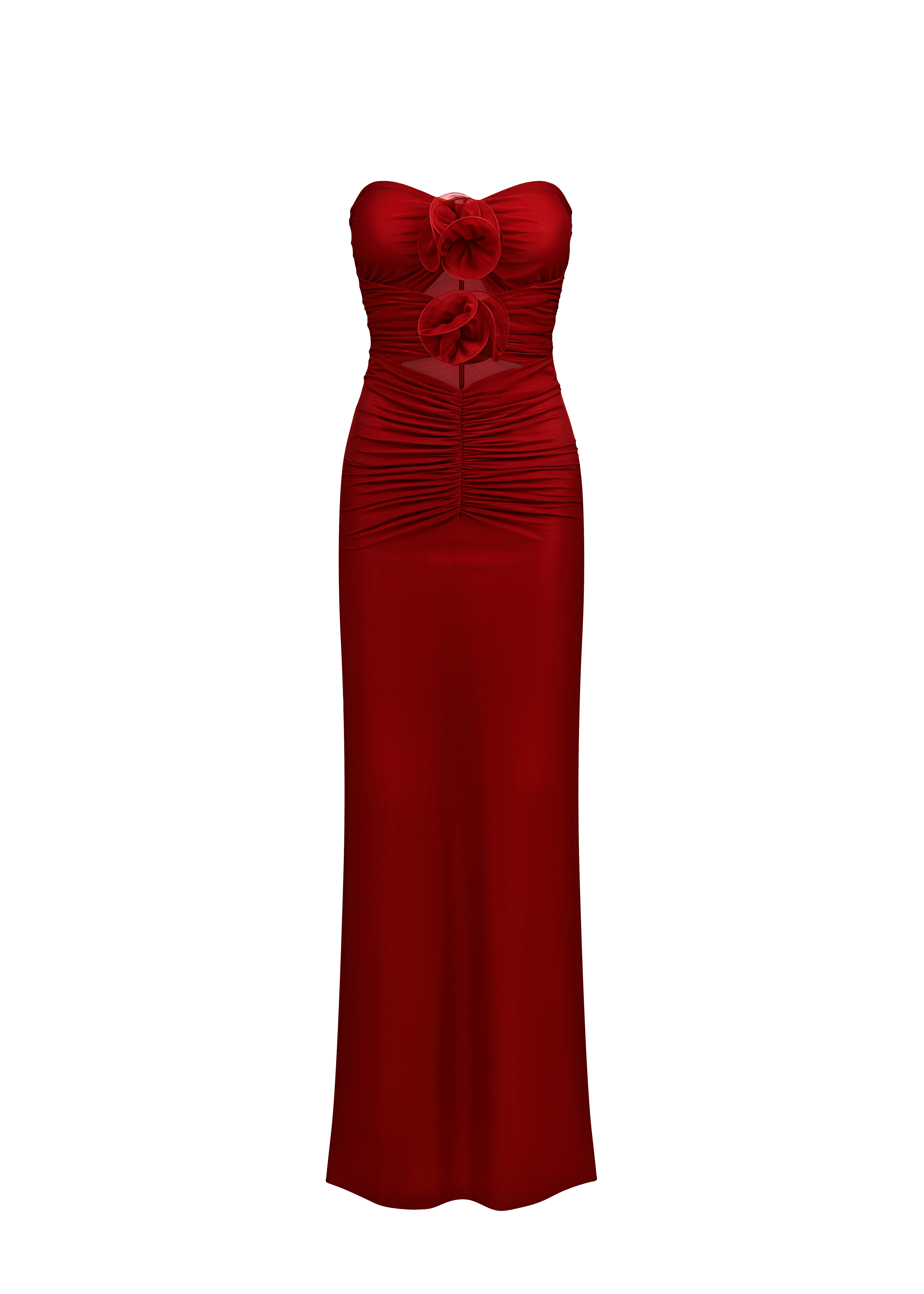 Сукня максі без бретелей Wild Orchid – це захопливе поєднання сучасної елегантності та ніжної жіночності. Виготовлена з напівпрозорої тканини, ця сукня максі має вишукані рюші, які чудово підкреслюють фігуру. Що справді вирізняє її, так це складні вирізи, прикрашені квітами ручної роботи, які додають їй сміливого та унікального вигляду. Застібається на магнітні застібки на спині.