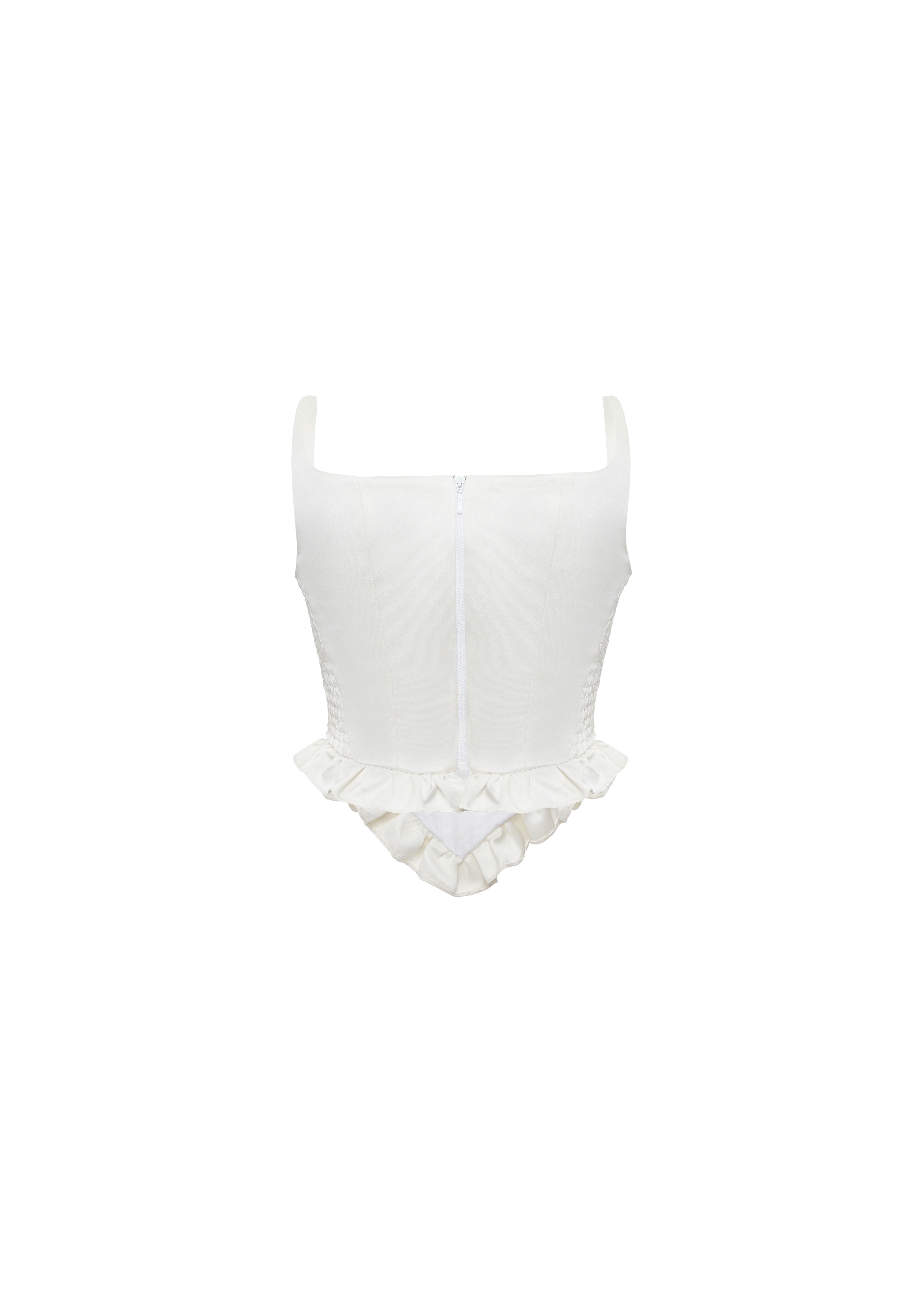Цей корсет виготовлений з молочного атласу з мініатюрною баскою та ніжними квітами ручної роботи, які додають елегантності його дизайну. Квадратний виріз горловини та вигнутий поділ створюють привабливий силует, а тонкі бретельки підкреслюють його чарівність. Розроблений з урахуванням комфорту, топ має еластичні вставки з боків які підкреслюють вашу фігуру. Топ застібається на блискавку, повністю на підкладці.