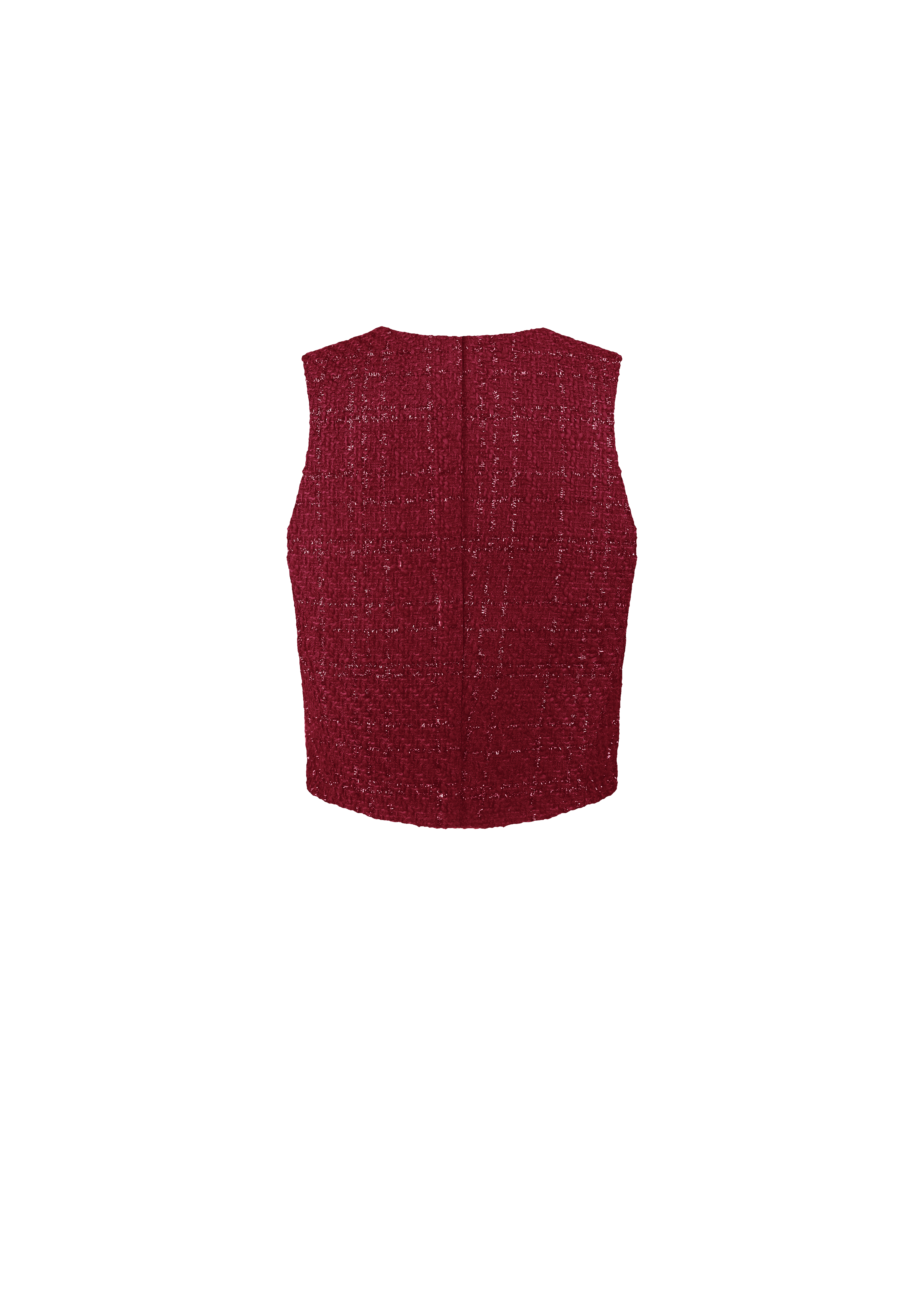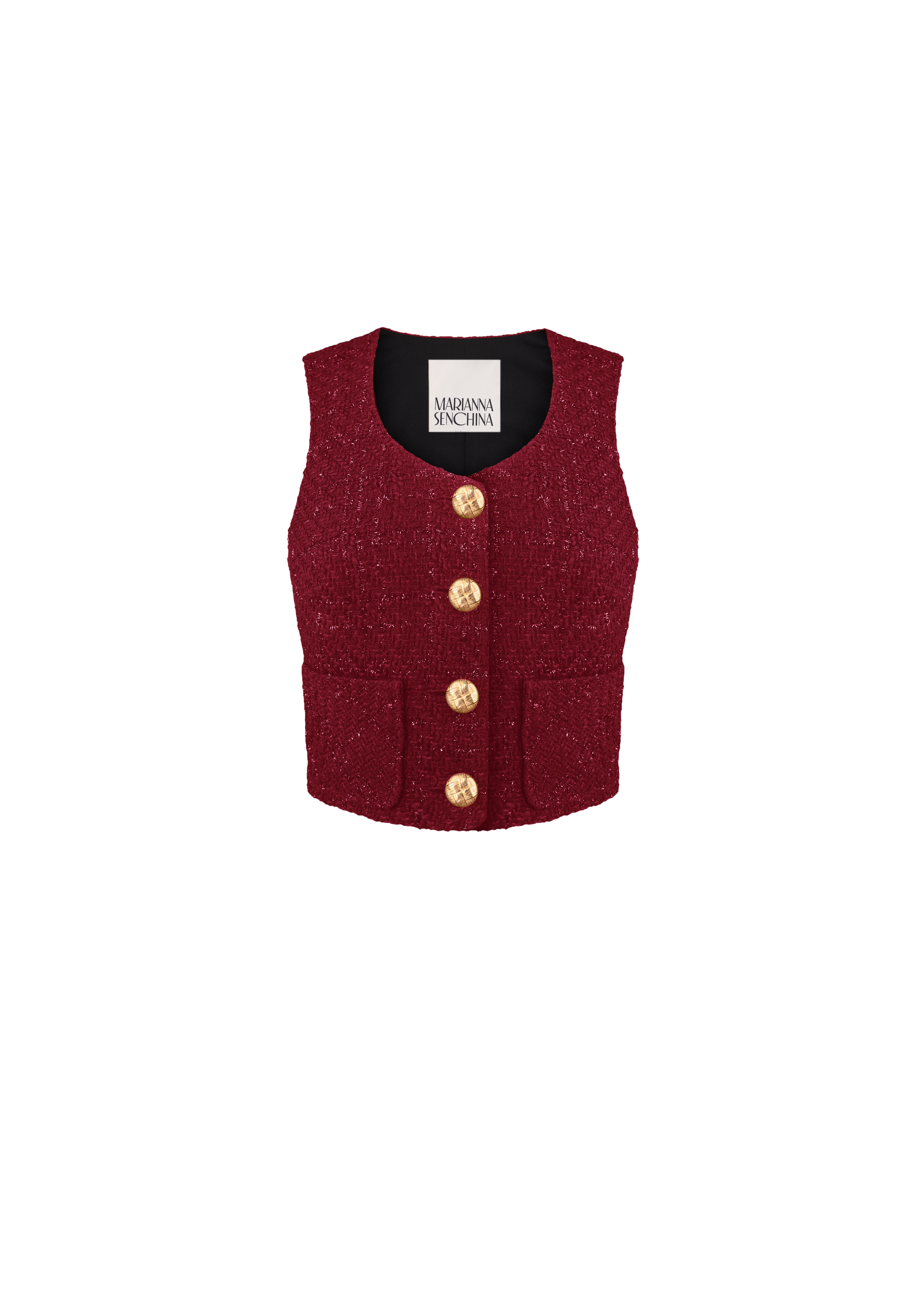 Укорочений твідовий жилет прикрашений елегантними золотими ґудзиками. Виготовлений з твіду. Для цілісного та вишуканого образу поєднайте його з нашим піджаком Kate та твідовими шортами, створивши стильний костюм-трійка, що випромінює впевненість та вишуканість.