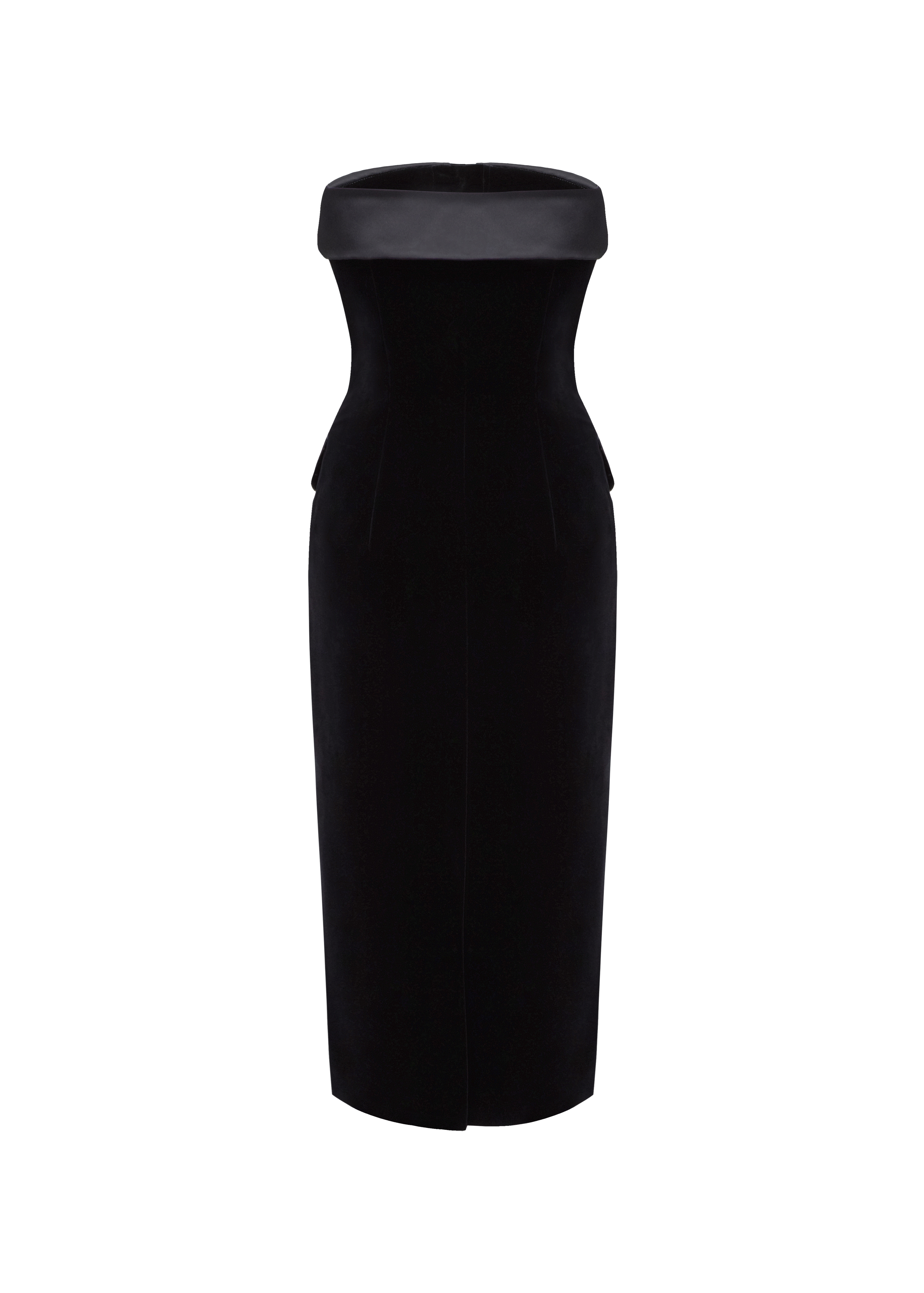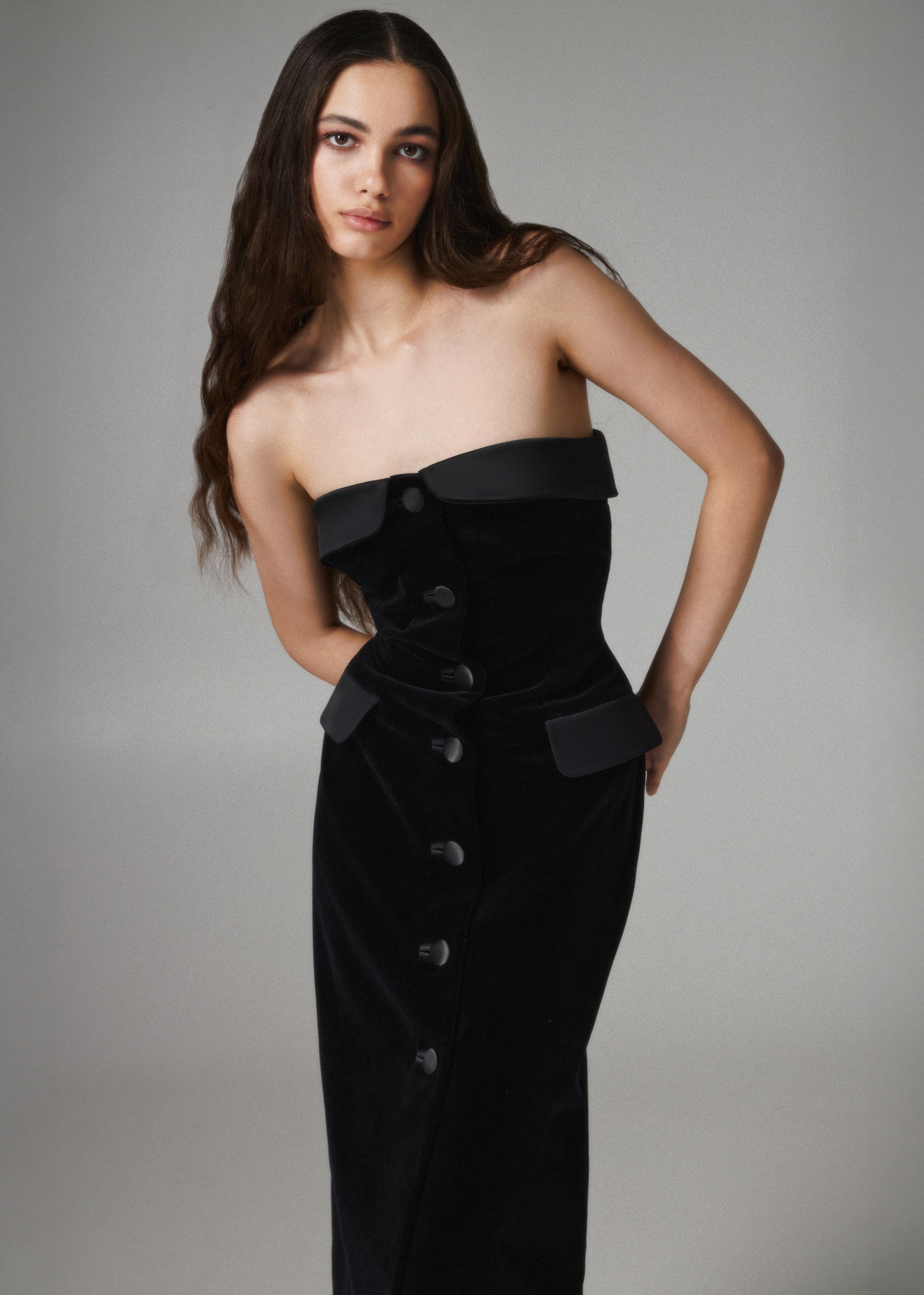 Diana dress luxurious and captivating ensemble meticulously crafted from black velvet. This exquisite open-shoulder midi jacket dress features a sophisticated black satin collar and is elegantly fastened with sleek black satin buttons, adding a touch of refinement to the design. Decorative satin flaps on the waist enhance the overall charm of the dress. Fully lined.