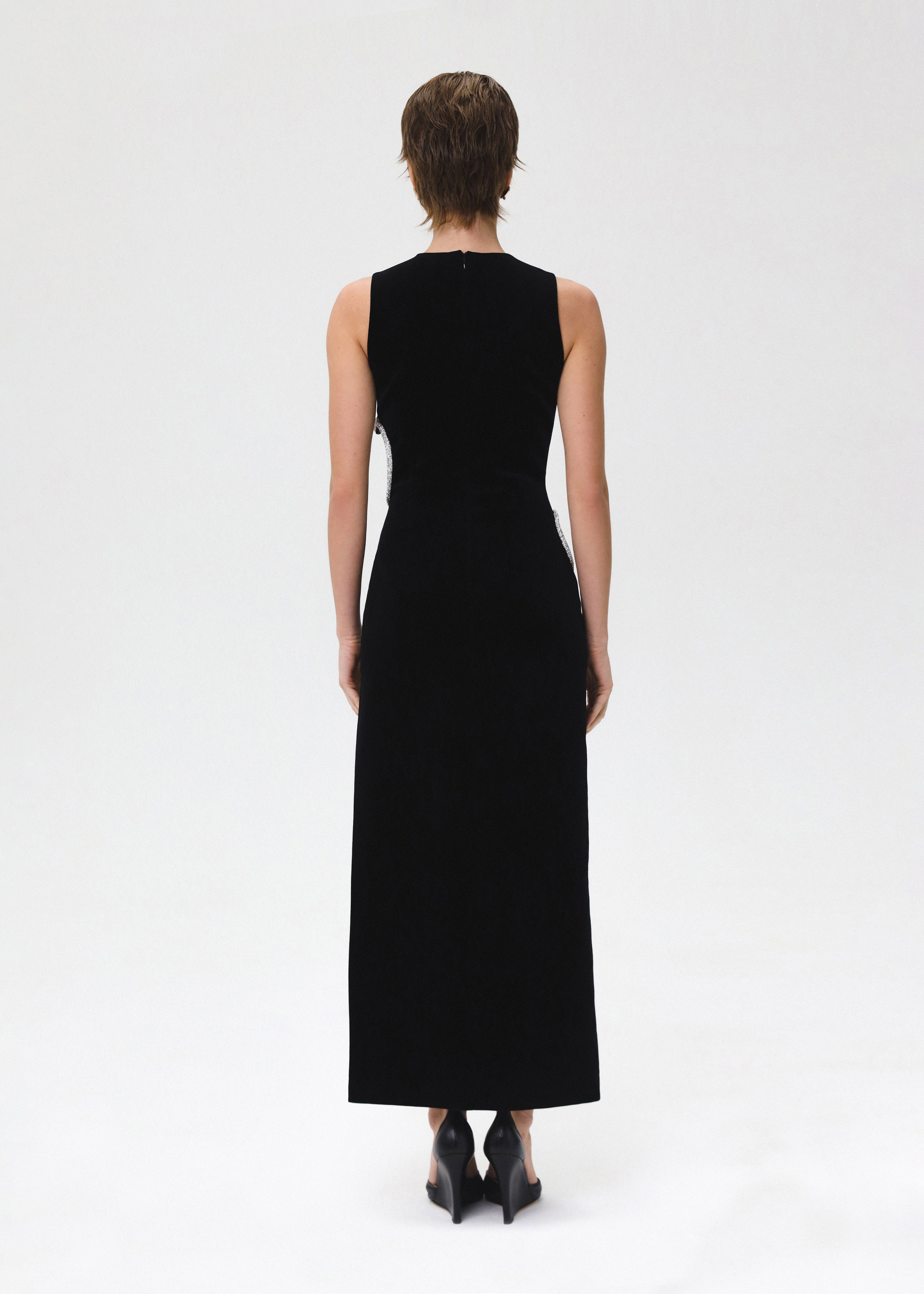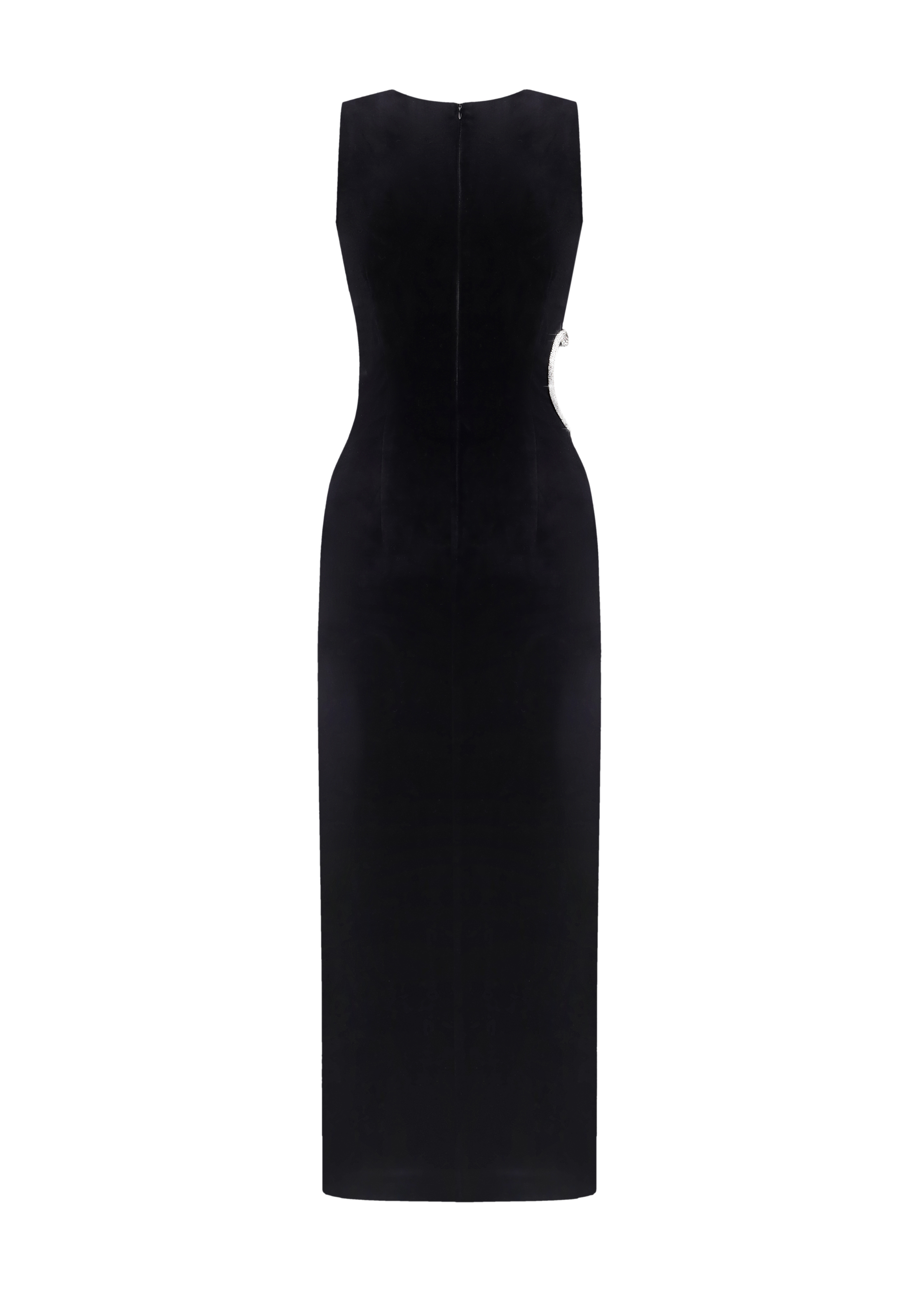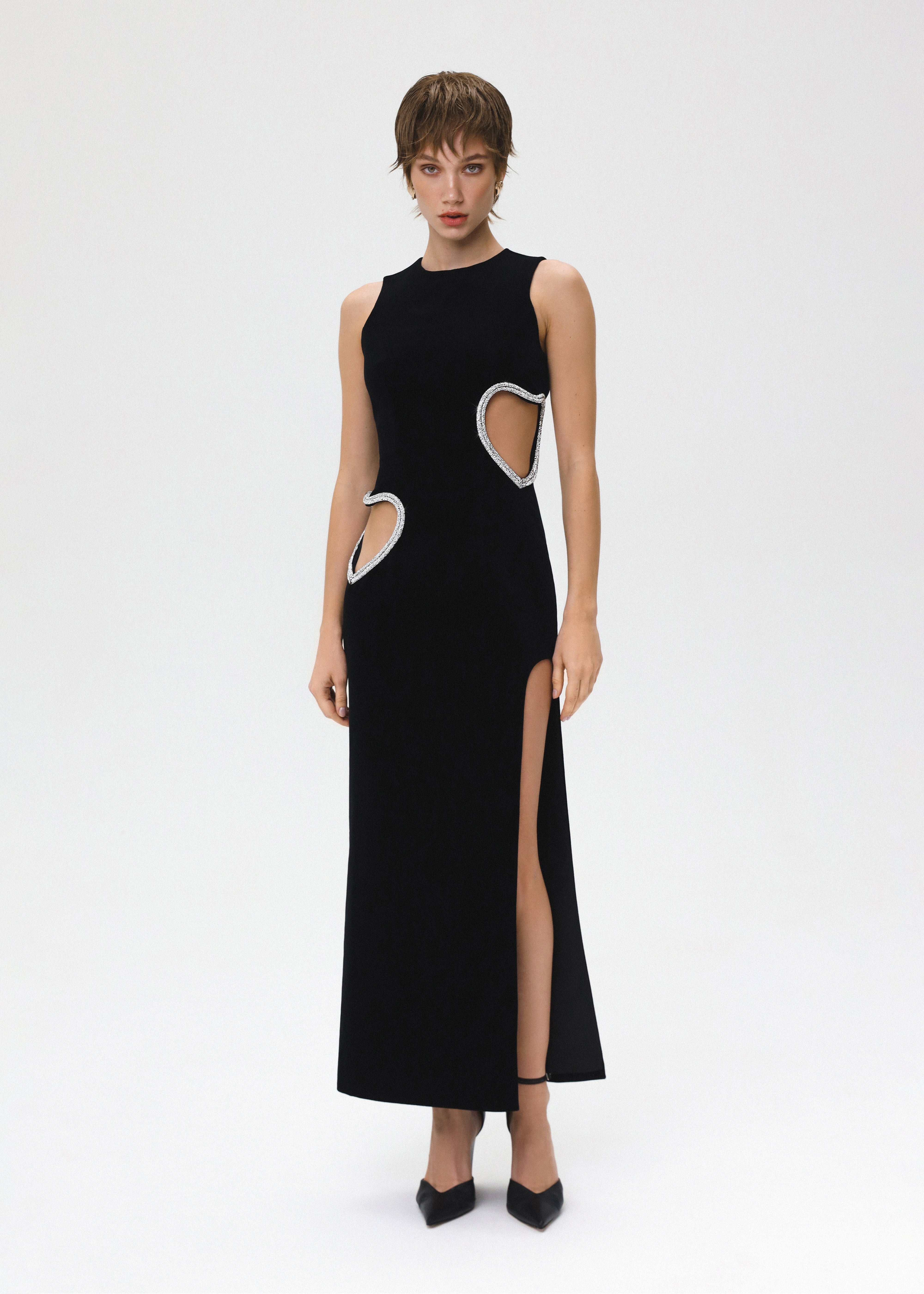 First Kiss crafted in a black color, this sleeveless midi dress features a round neck and a flattering structured silhouette. The most captivating features are the heart-shaped cut-outs at the waist and hips, embellished with shimmering crystals, adding a touch of glamour and sophistication. Complete with a thigh-high slit, the dress is fastened with a concealed back zipper and hook and eye closure, fully lined.