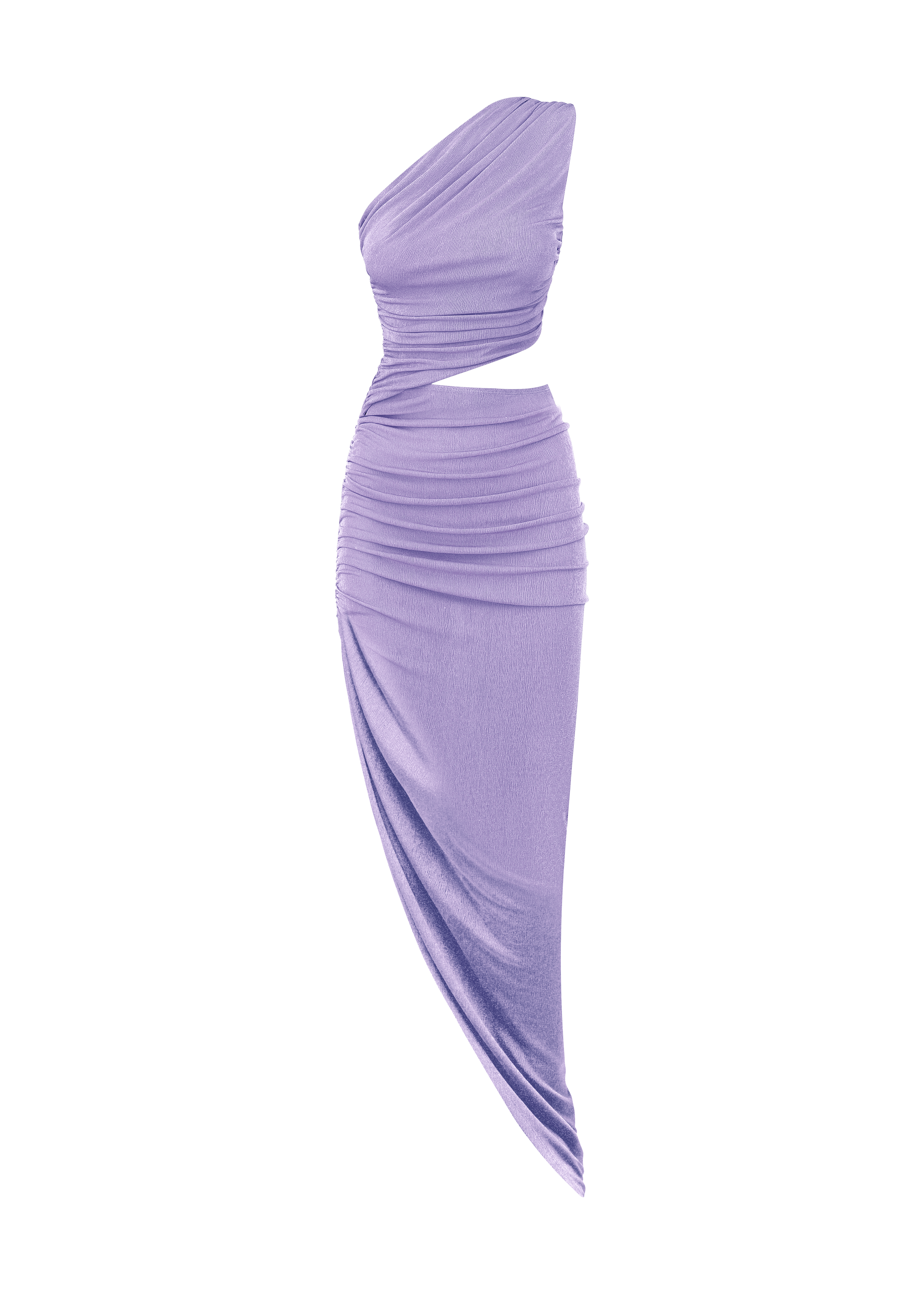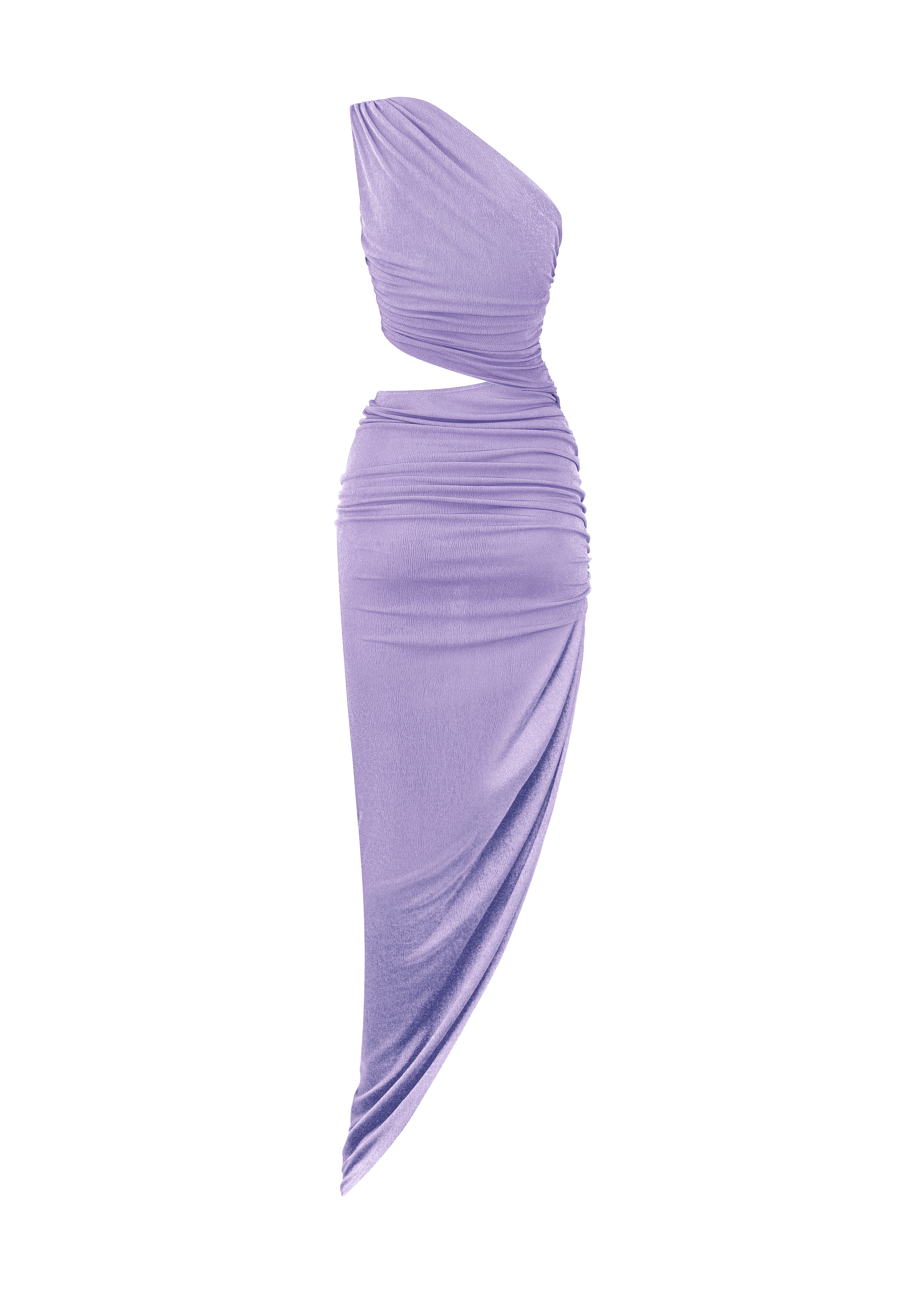 A bold statement in fiery lilac, this jersey one-shoulder dress is designed to captivate. The asymmetric silhouette is accentuated by artful ruching, while a daring waist cutout adds a touch of allure. Crafted from soft, stretchy fabric, it hugs your curves for a flawless fit, making it the perfect choice for various occasions.