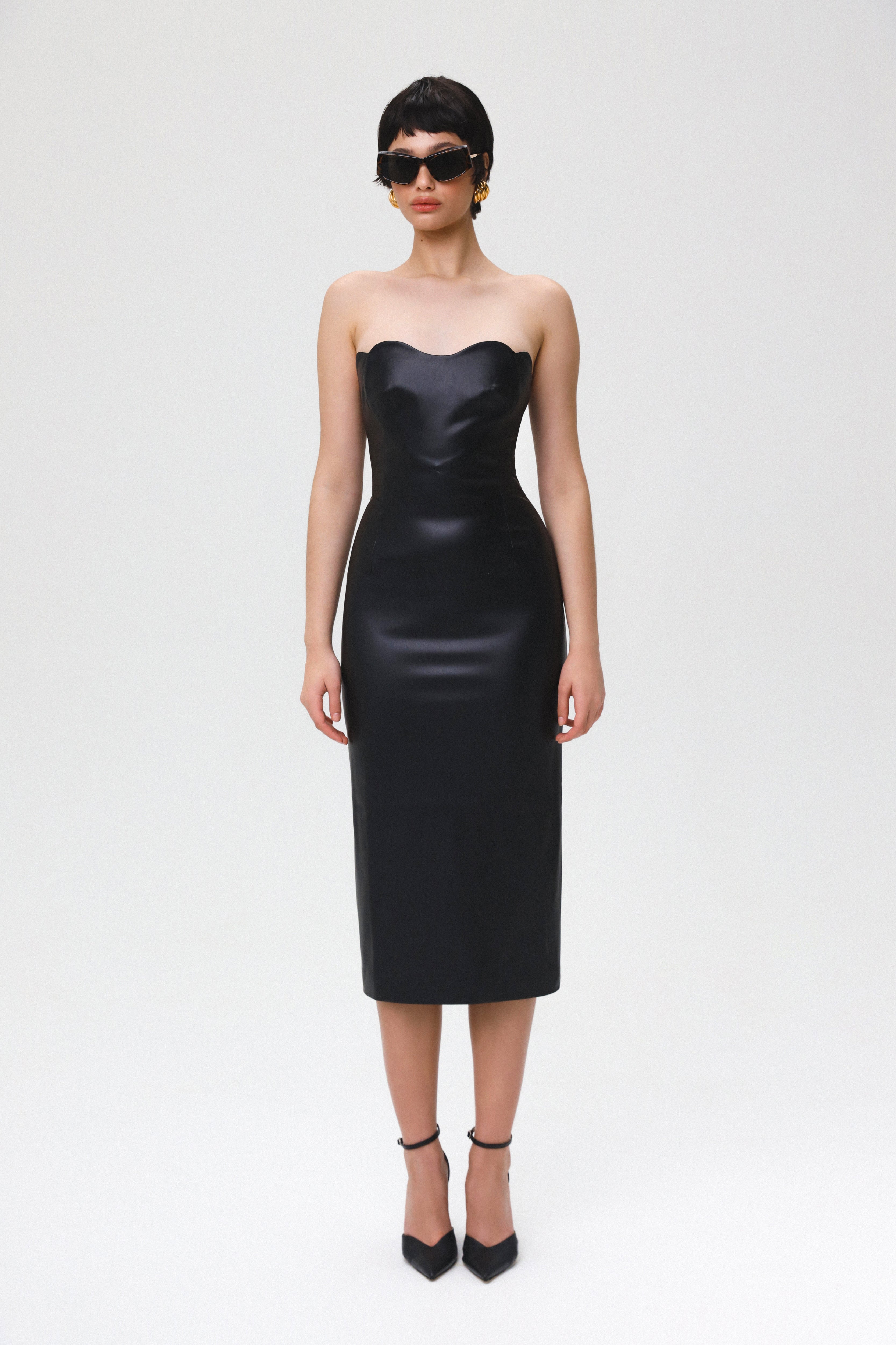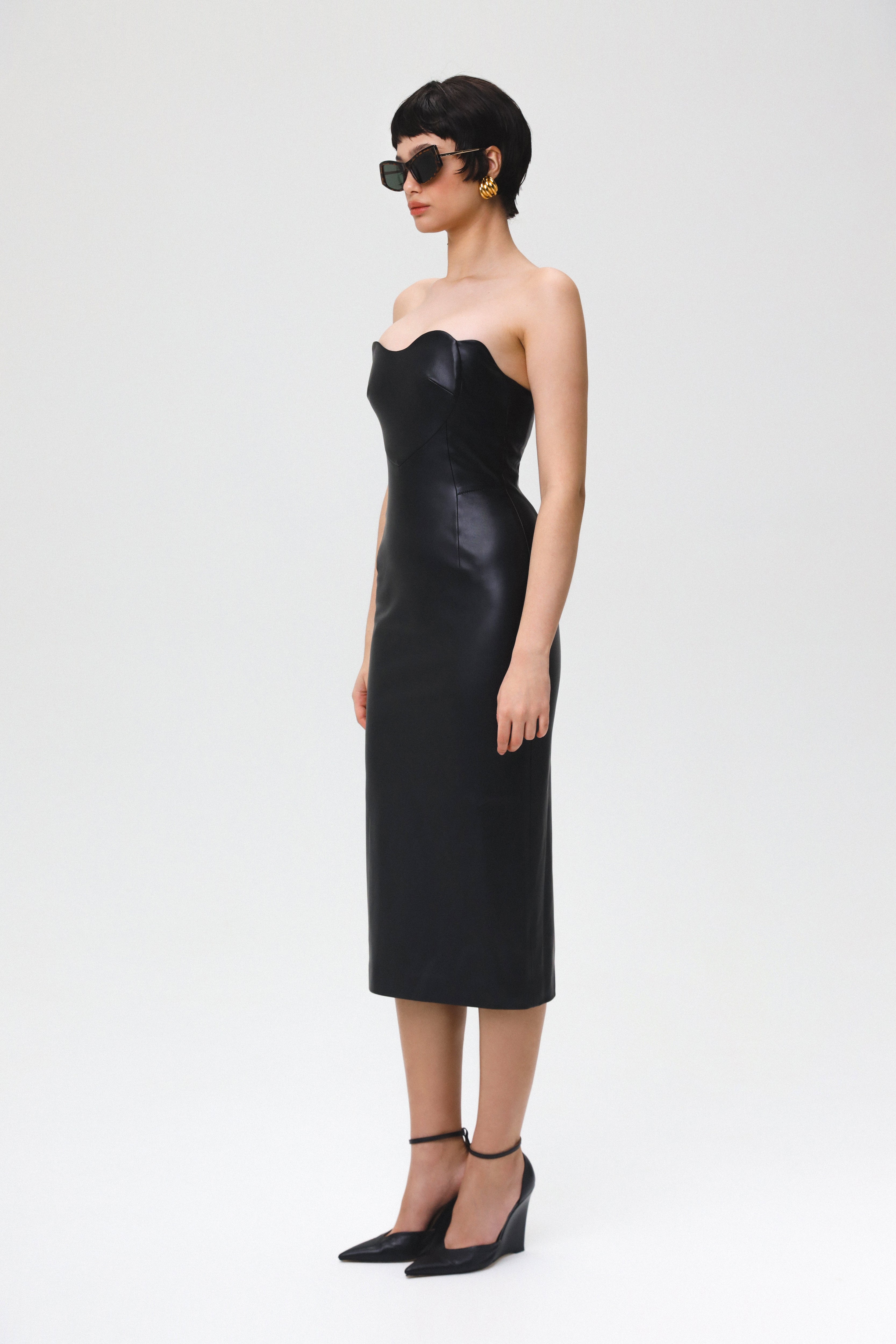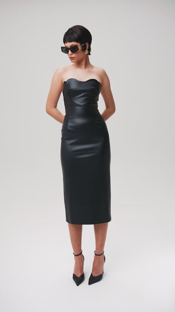 Love Lock leather midi dress in sleek black, featuring a heart-shaped bustier. Expertly tailored, this dress offers a flawless fit that accentuates your curves and enhances your silhouette. The straight, long skirt with a subtle slit at the back for added ease of movement. Fastened with a concealed back zip and hook and eye. Fully lined.