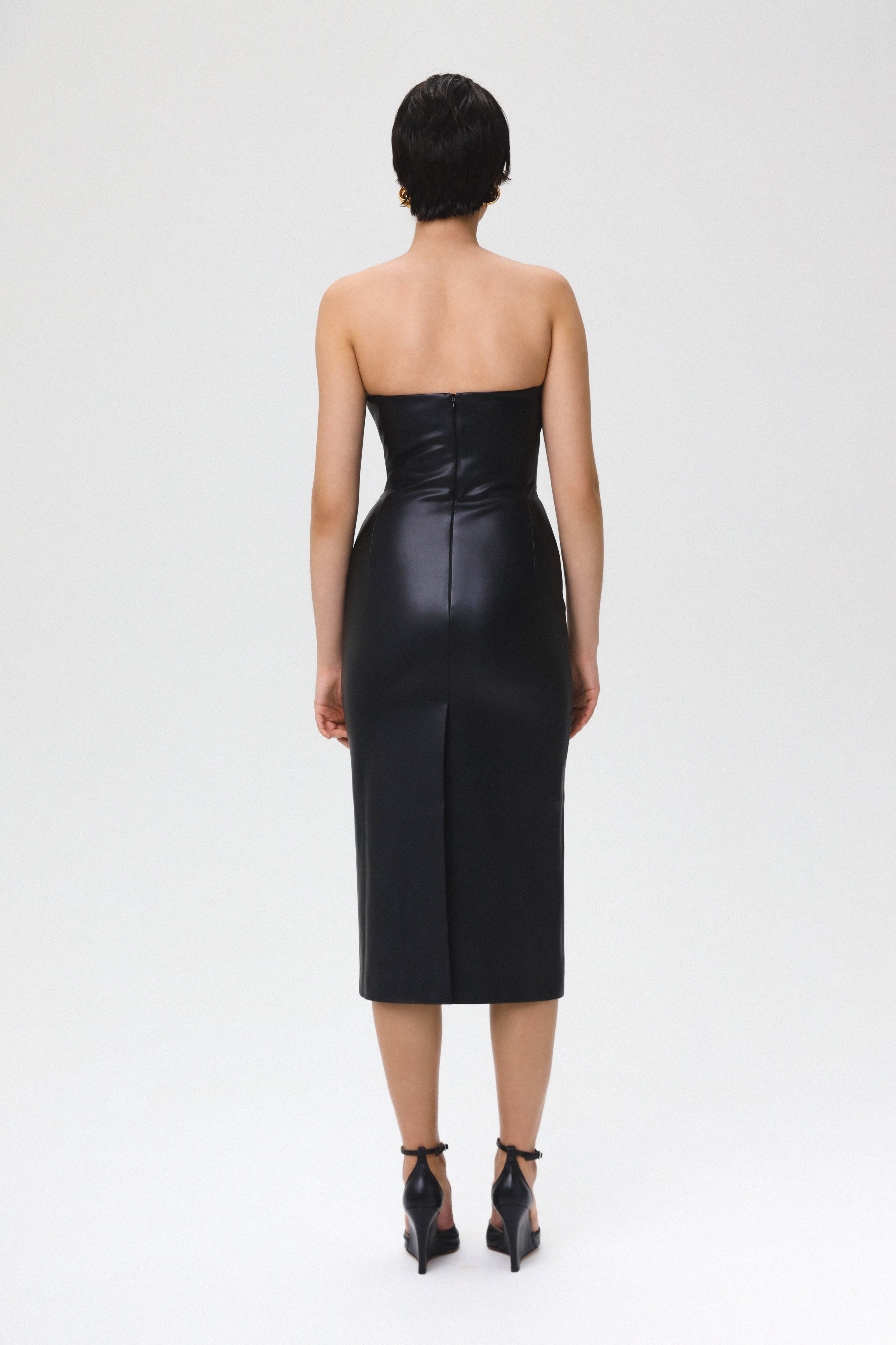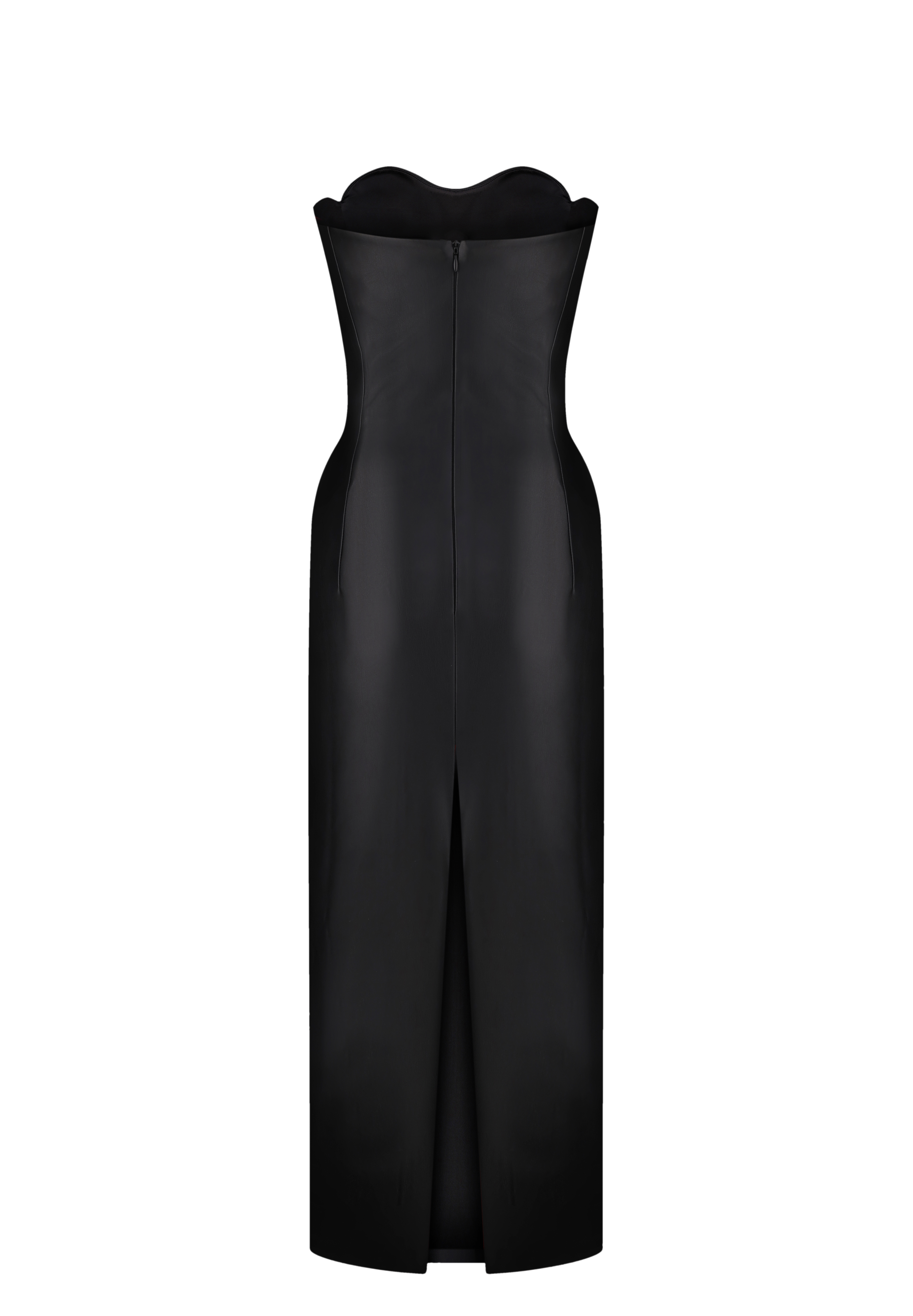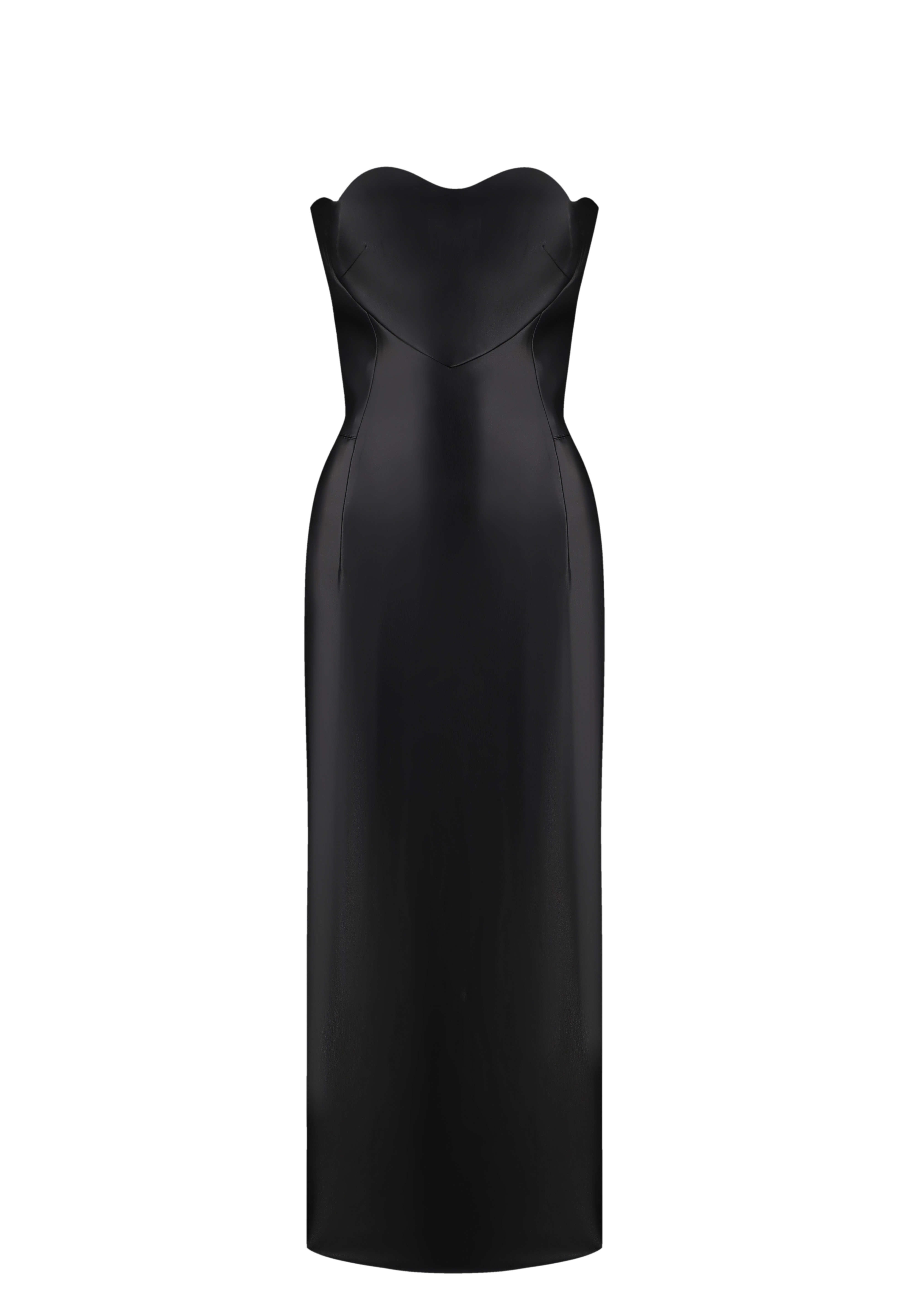 Love Lock leather midi dress in sleek black, featuring a heart-shaped bustier. Expertly tailored, this dress offers a flawless fit that accentuates your curves and enhances your silhouette. The straight, long skirt with a subtle slit at the back for added ease of movement. Fastened with a concealed back zip and hook and eye. Fully lined.