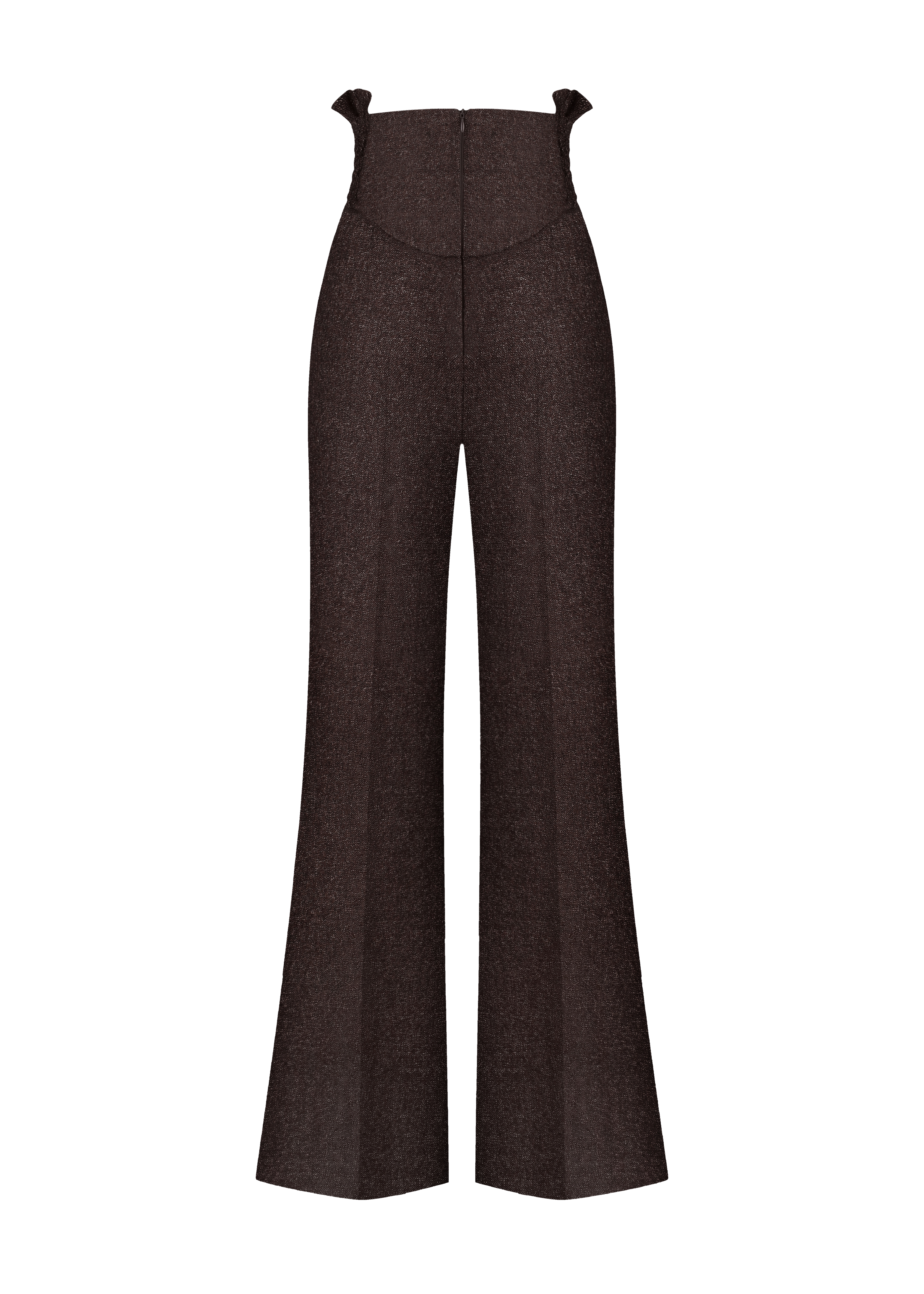 Thoughtfully designed for everyday elegance, our Swan fitted flared pants in a rich dark brown shade combine comfort and style effortlessly. Featuring an extra-high waist with elastic side inserts, these pants offer a flexible fit that enhances your natural shape. The subtle ruffles add a touch of charm, while the shaped curved waistband is accented with decorative buttons.