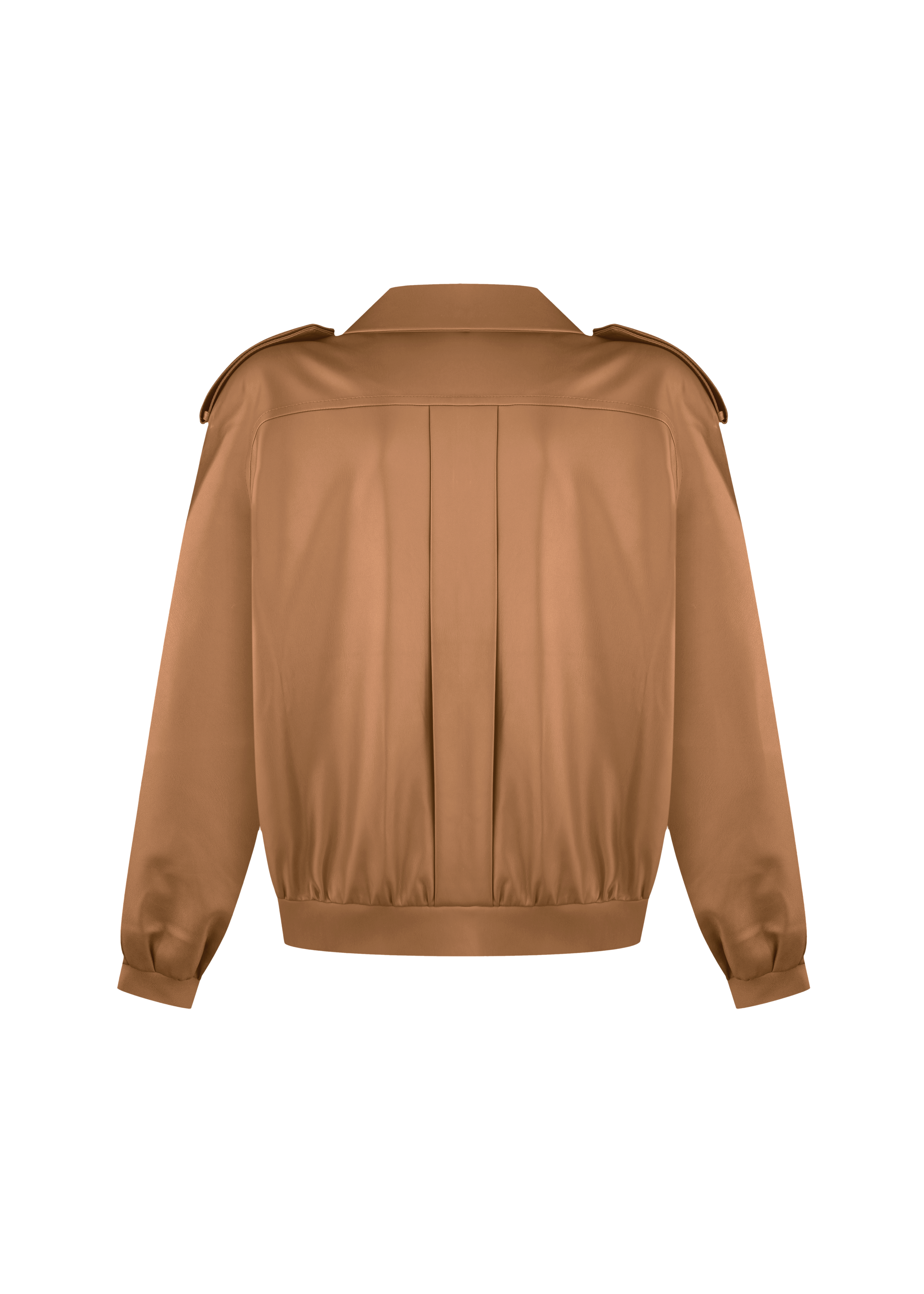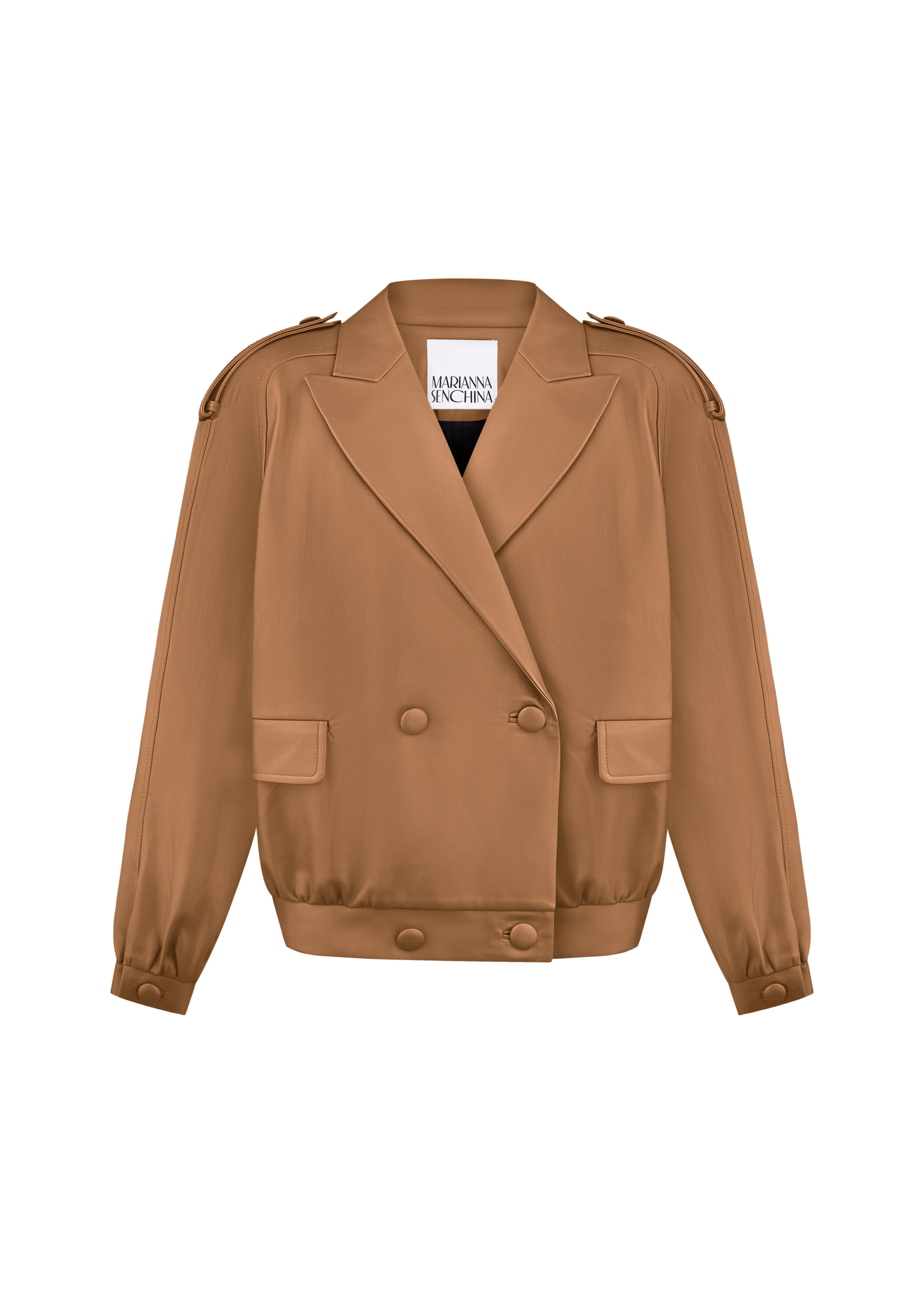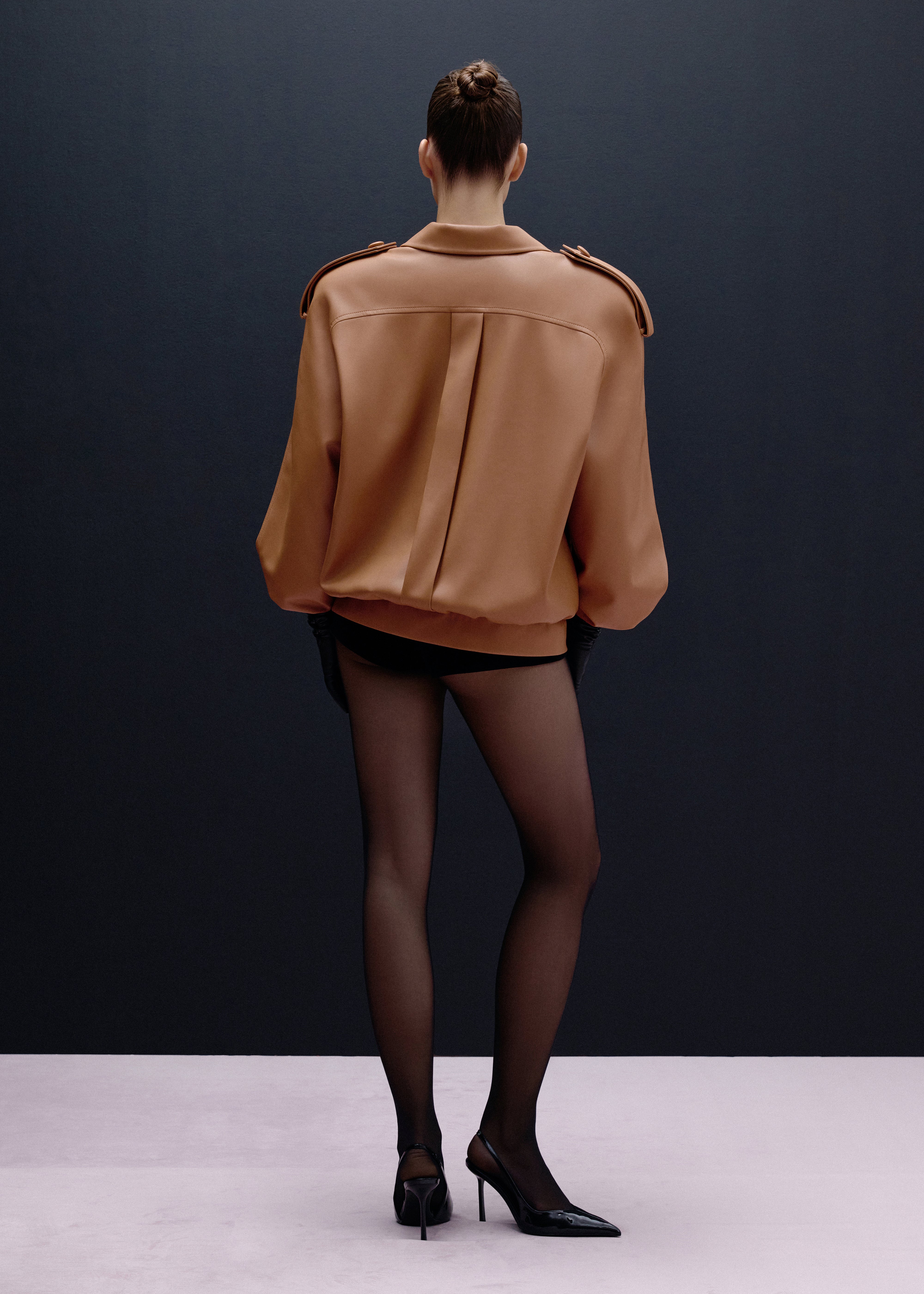 Cindy oversized double-breasted eco-leather jacket — a chic tribute to iconic 80s fashion. The structured shoulders and raglan sleeves create a distinctive silhouette that exudes confidence and style. Long sleeves adorned with leather wide cuffs and buttons, the V neckline, padded shoulders, wide collar, and notched lapels complete the classic and polished look. Jacket features two flap pockets for the functionality and shoulder straps that give it a unique and eye-catching appeal. Fastening with buttons. Fully lined.