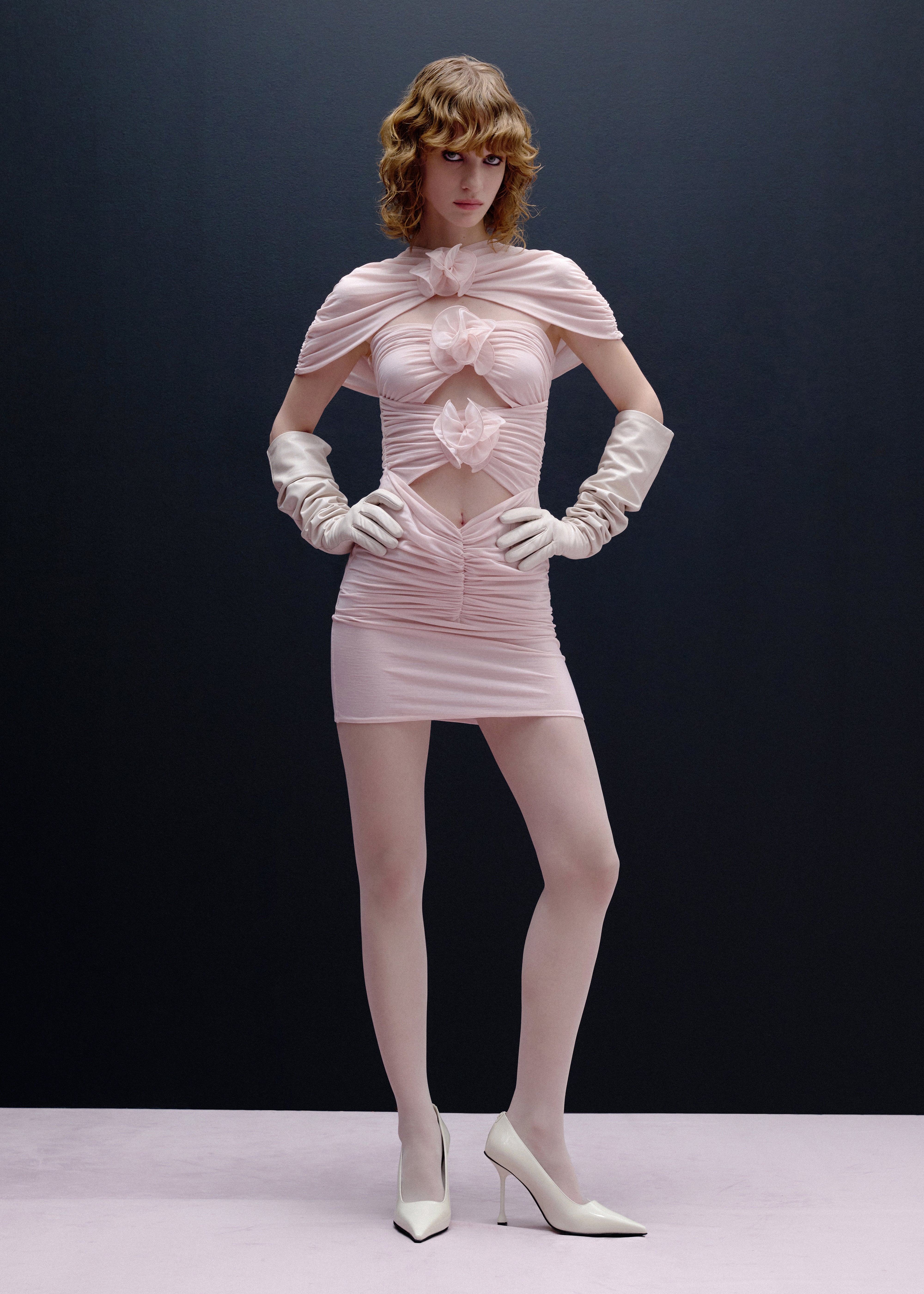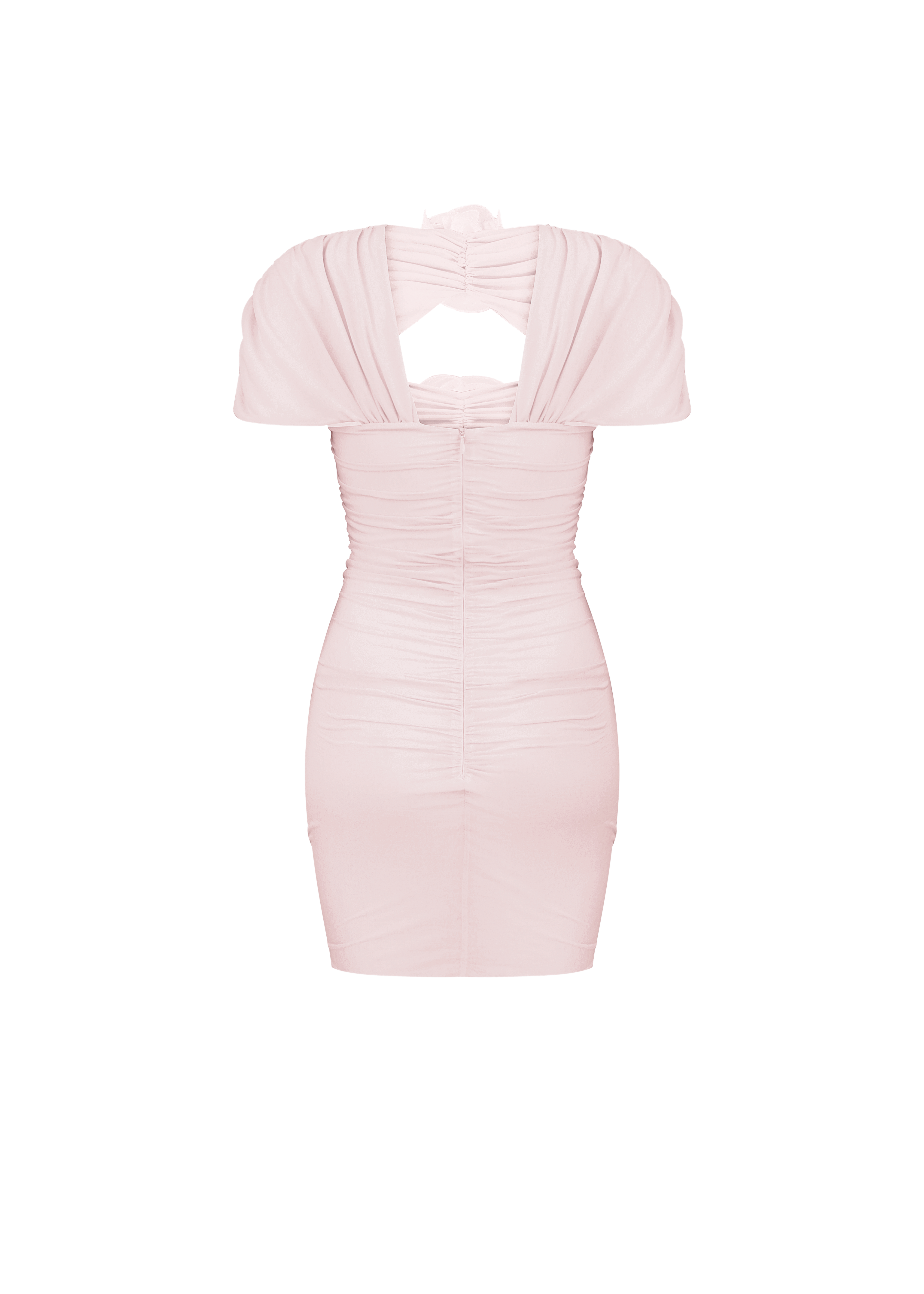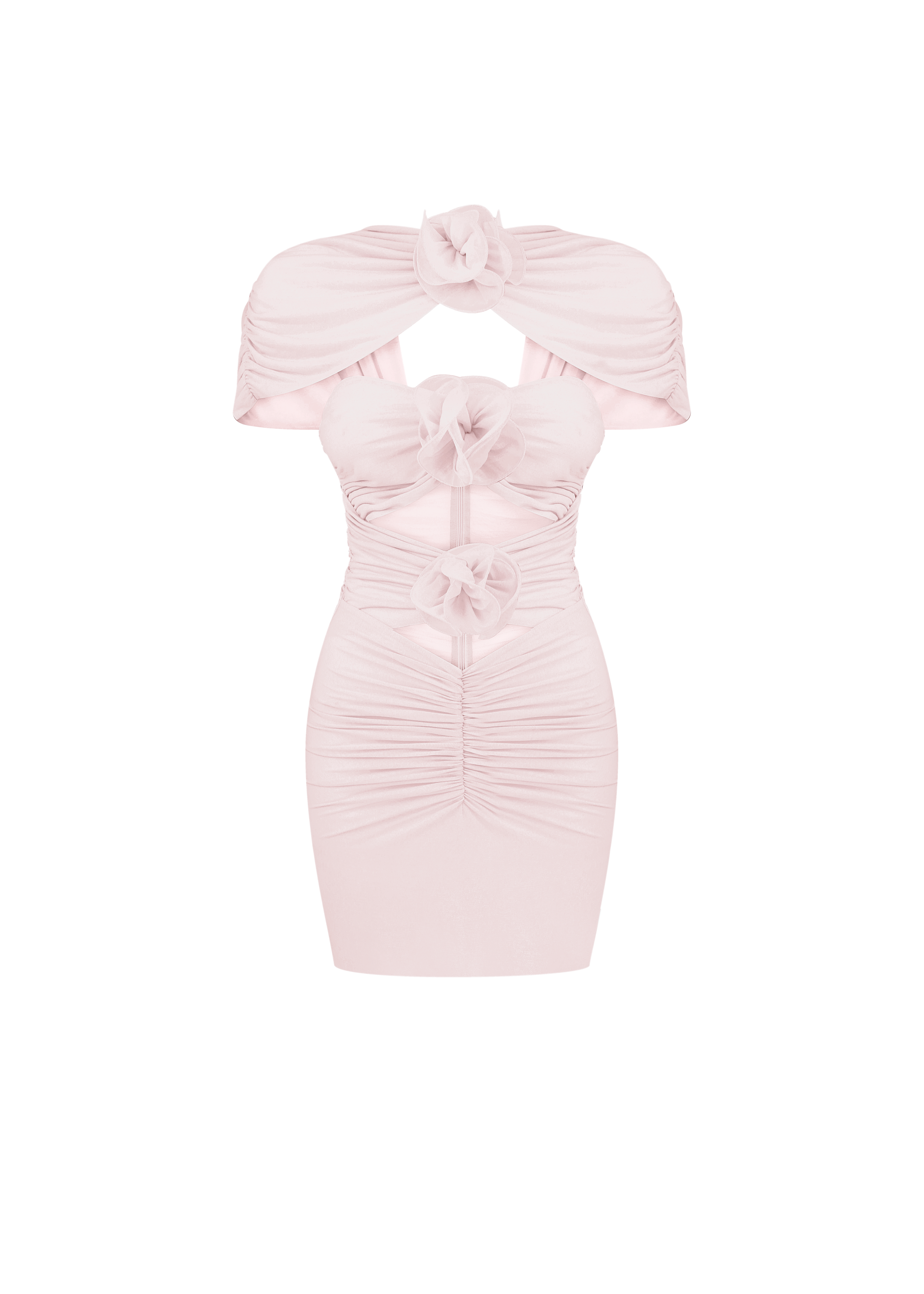 Wild Orchid ruched mini dress, a daring fusion of modern elegance and feminine allure. Crafted in a primrose pink hue, this dress features chic ruched detailing that contours the body. What sets it apart are the intricate cutouts adorning with handcrafted flowers, adding a bold and edgy touch. Fastened with concealed back zipper and hook and eye closure.
