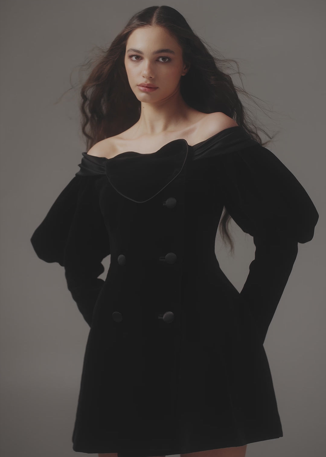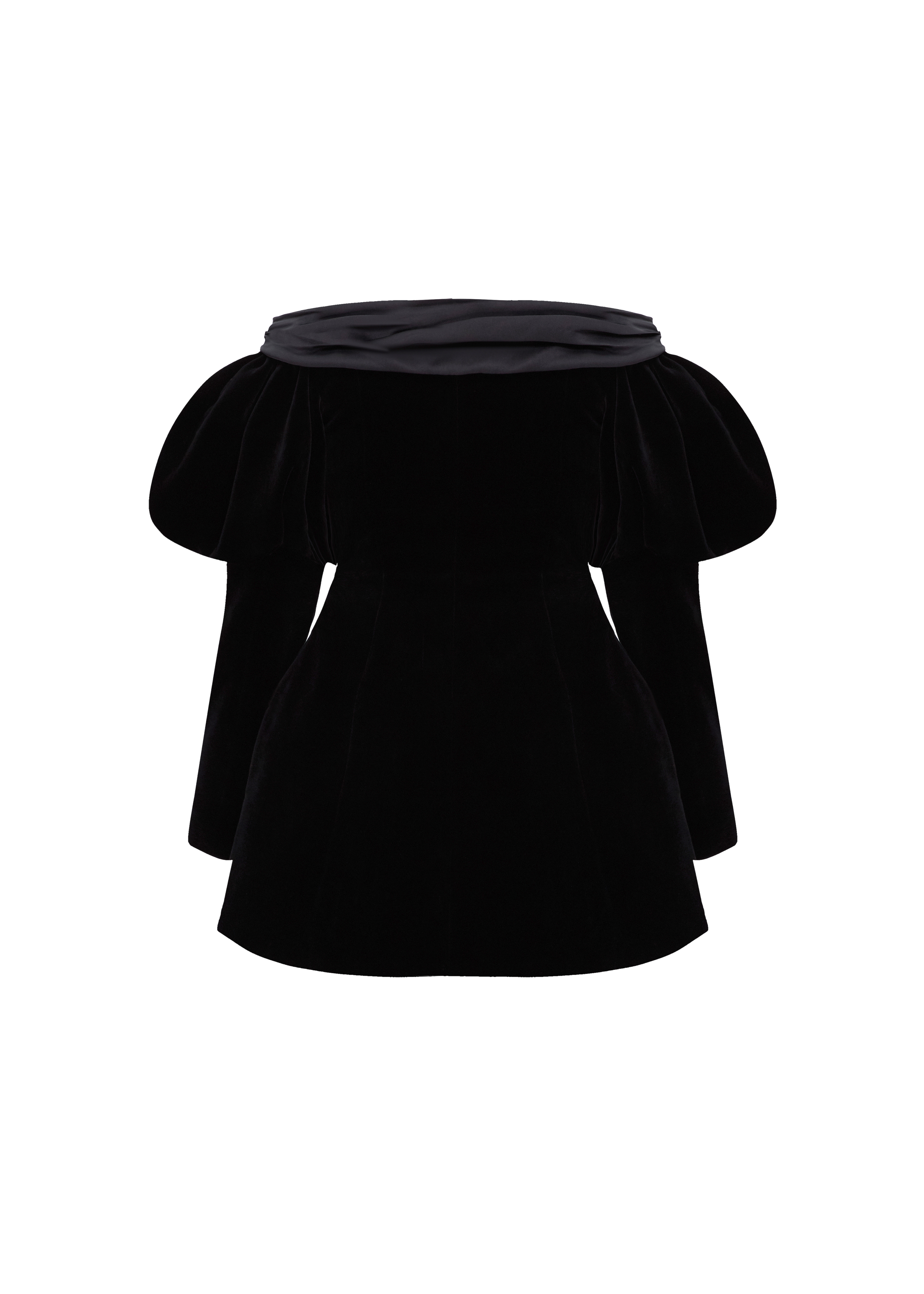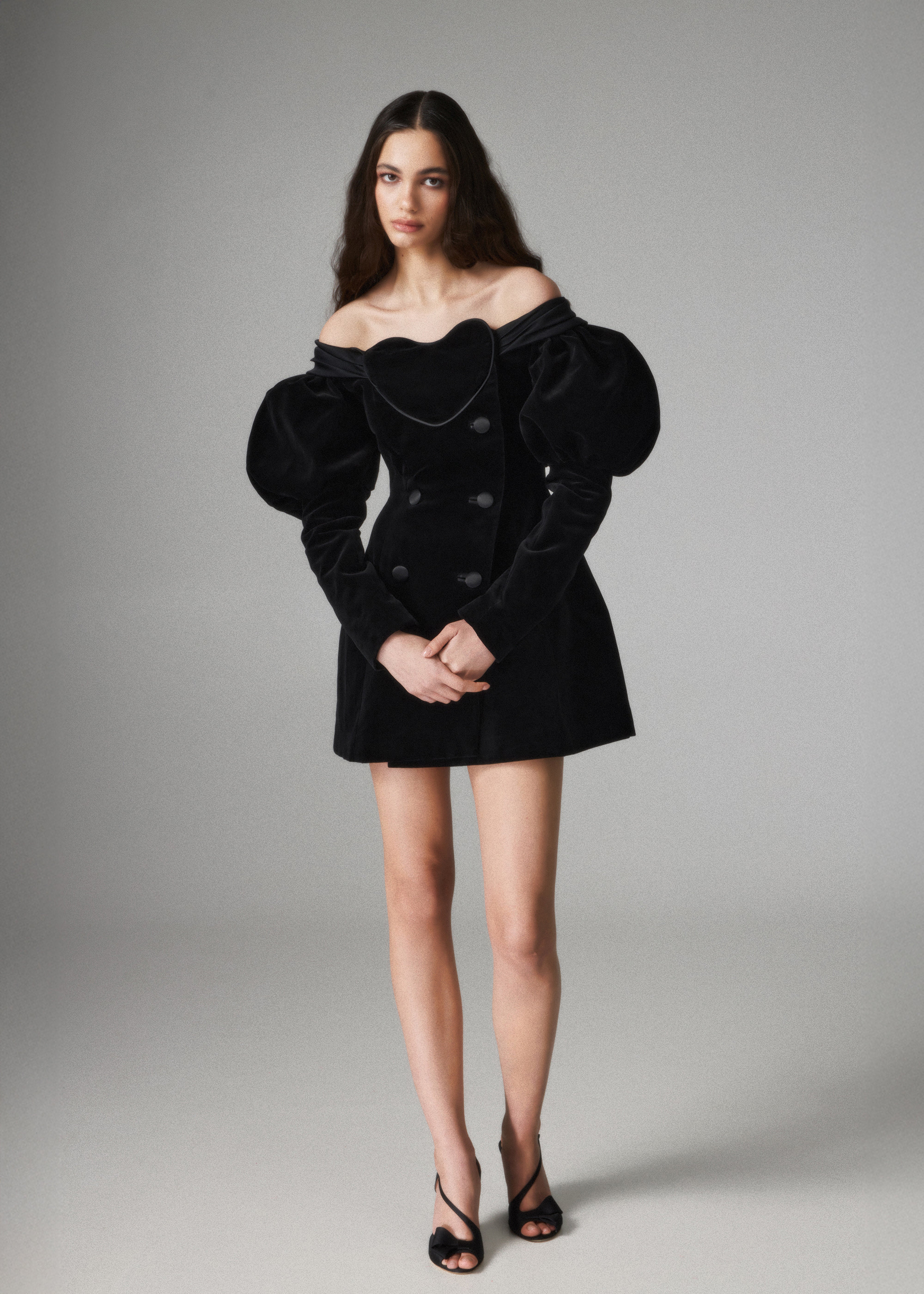 Presenting our Love Letter velvet dress, a captivating ensemble that weaves a tale of romance through its exquisite design. The heart-shaped detail, gracefully woven into the entire collection, takes centre stage, epitomizing the essence of romance. Crafted from black velvet and adorned with black satin details like a pleated collar and buttons, this off-the-shoulder jacket-dress exudes timeless allure. The puff-sleeves and A-silhouette skirt create a flattering and feminine silhouette that perfectly complements the romantic theme. Fastened with elegant black satin buttons on the front and concealed snap buttons inside. Fully lined.