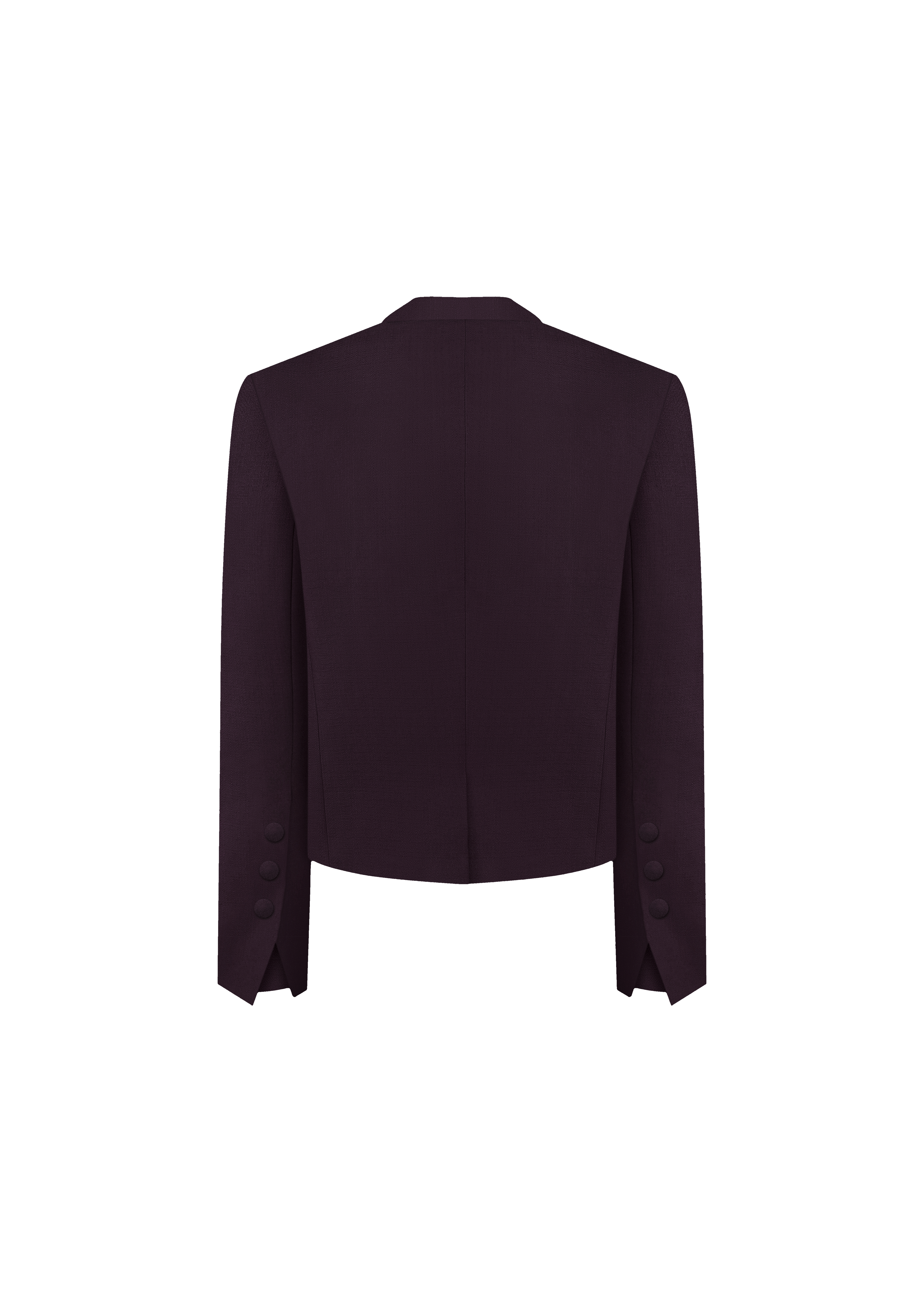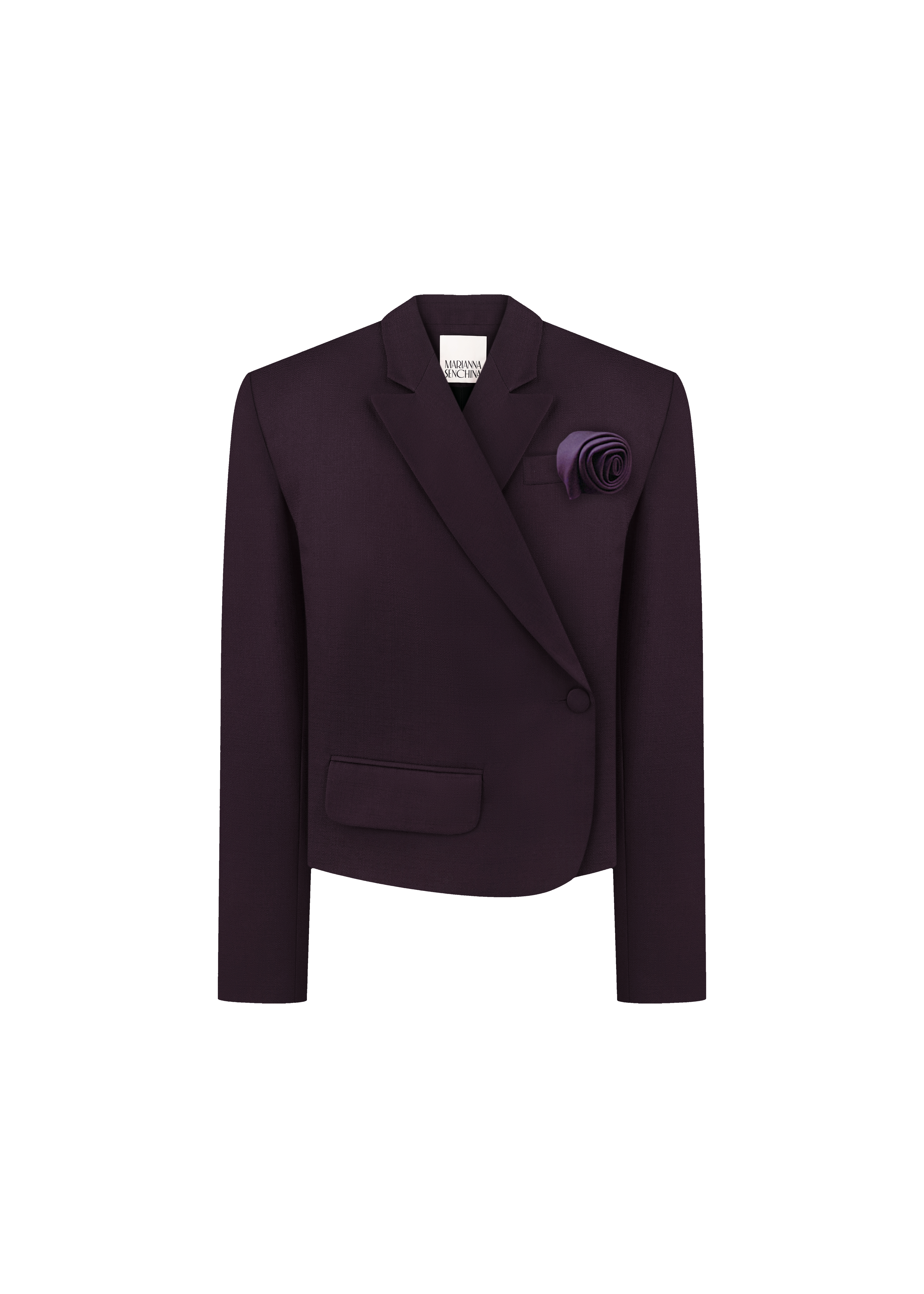 The oversized double-breasted Linda jacket now in a fig shade, perfect for the various occasions. It features a classic straight silhouette with padded shoulders and notched lapels, offering a timeless look. The jacket is adorned with decorative buttons on the cuffs and fastens with a single fabric-covered button and a nacreous snap button inside. Fully lined. Adorned with handcrafted flower brooch.