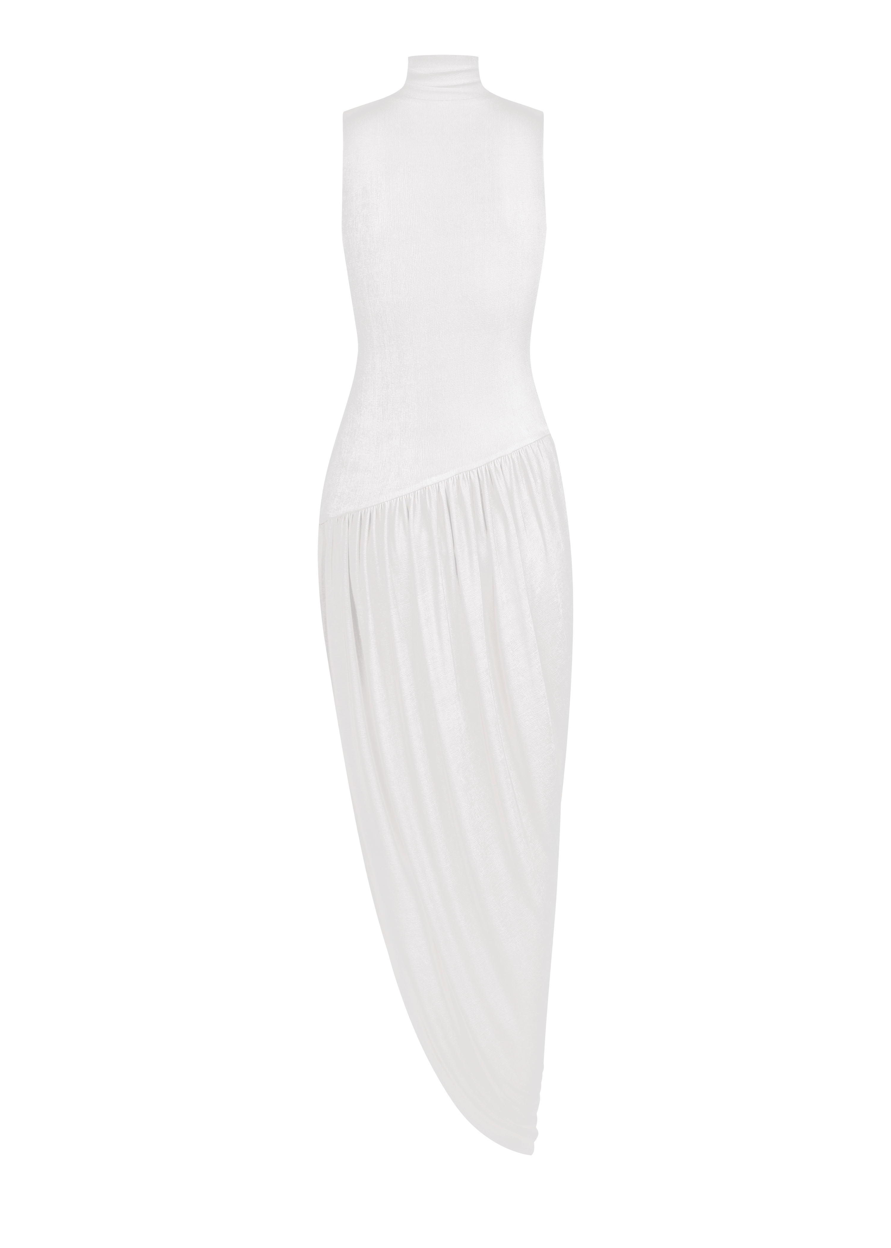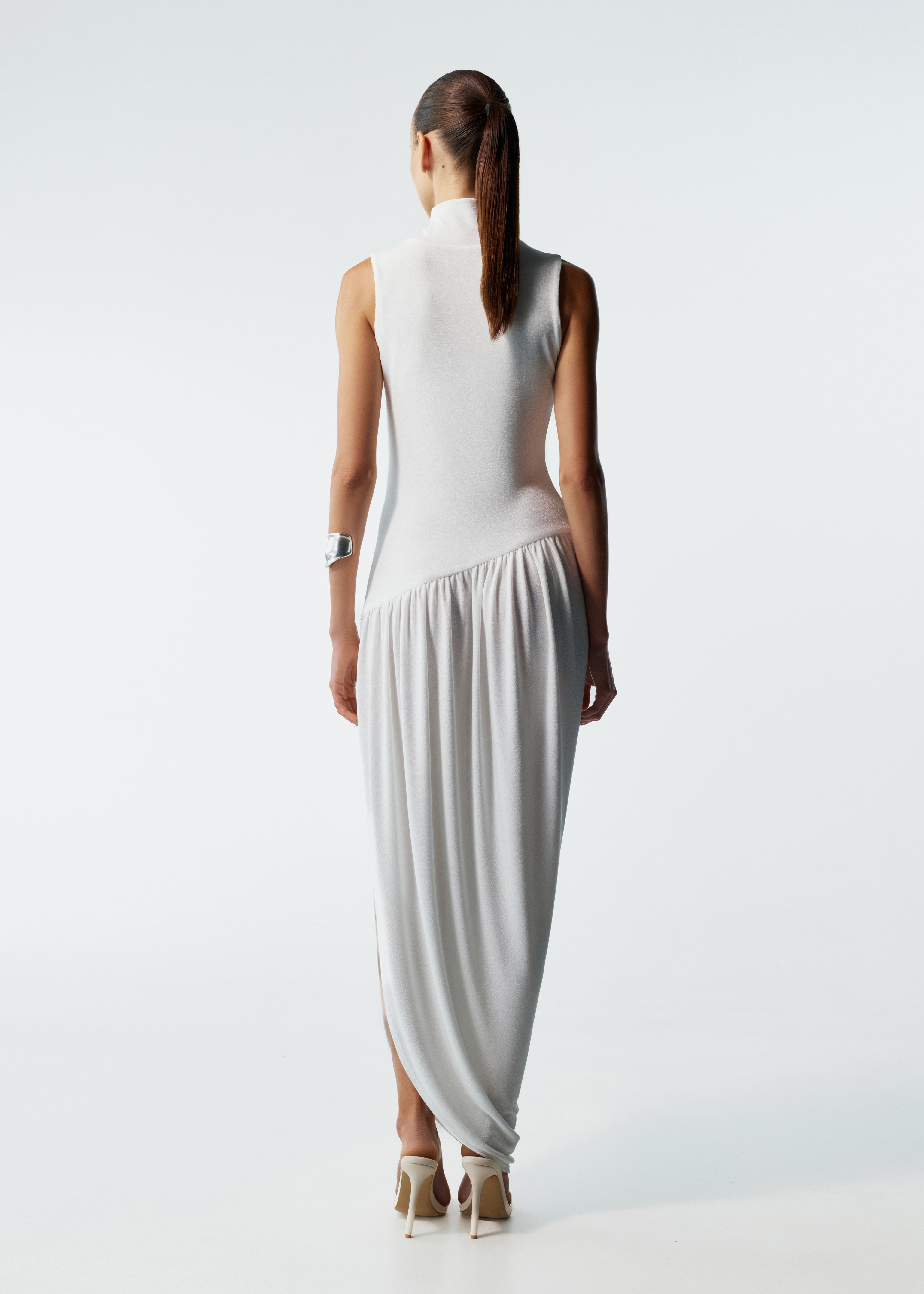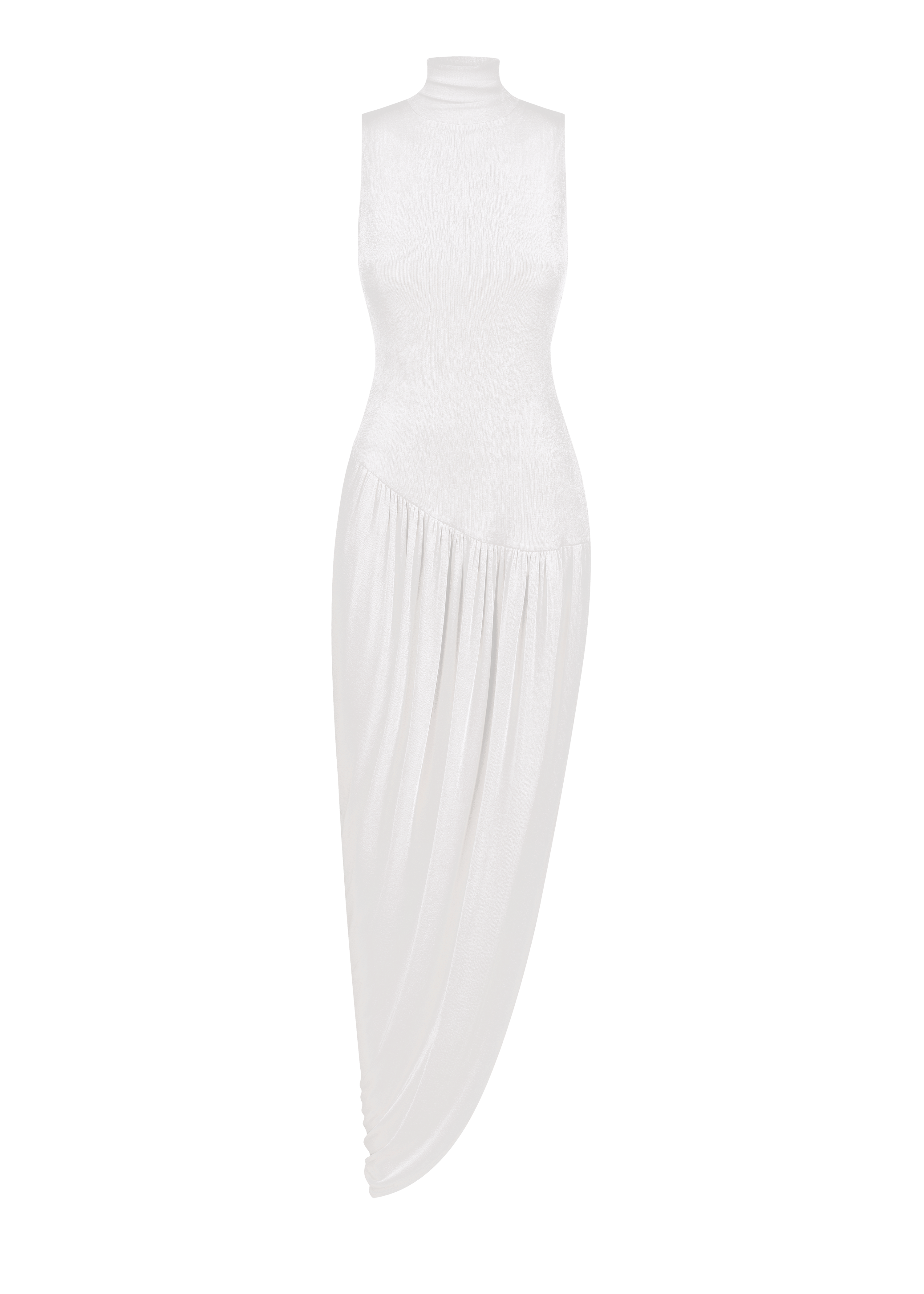 This jersey sleeveless turtleneck dress in white color is designed to be a versatile piece in tour wardrobe. It's symmetric asilhouette is accentuated by artful ruching, while a daring slit adds a touch of allure. Crafted from soft, stretchy fabric, it hugs your curves for a flawless fit, making it the perfect choice for various occasions.