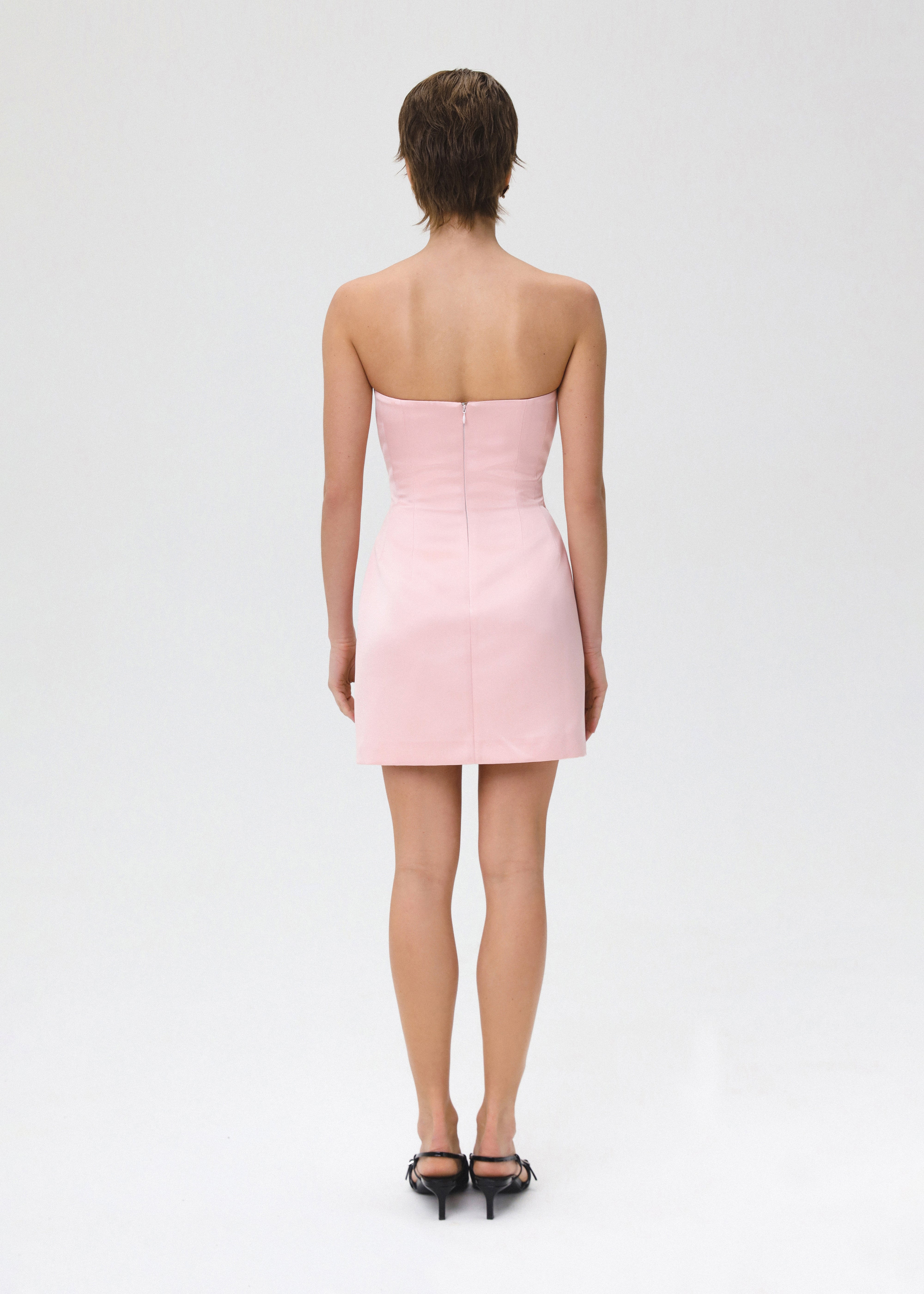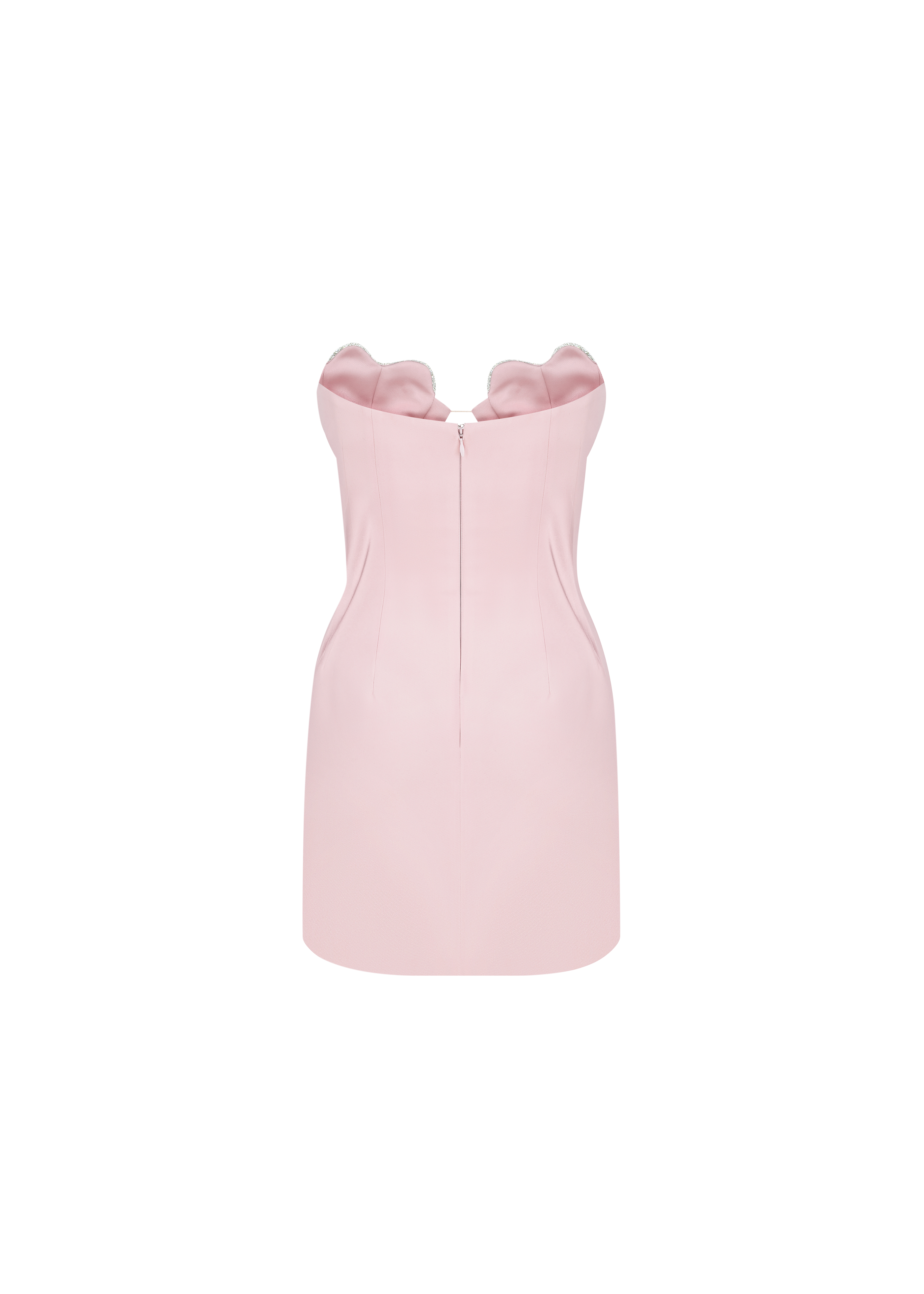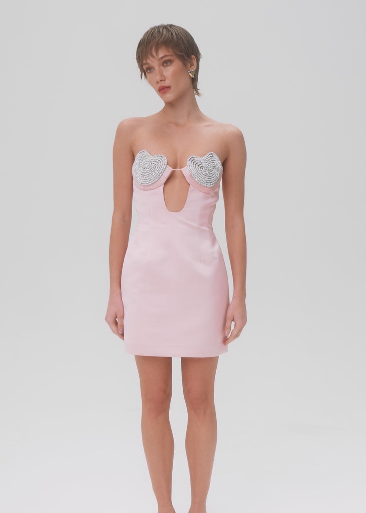 The strapless mini design features a fitted bustier and inner corset, sculpting silhouette that gracefully highlights feminine curves. The corset showcases a keyhole cutout. Handmade heart-shaped bustier cups take centre stage, adorned with sparkling crystals and connected by a transparent thread to achieve a subtle and elegant effect.  Fastened with a concealed back zipper and hook-and-eye closure. Fully lined.