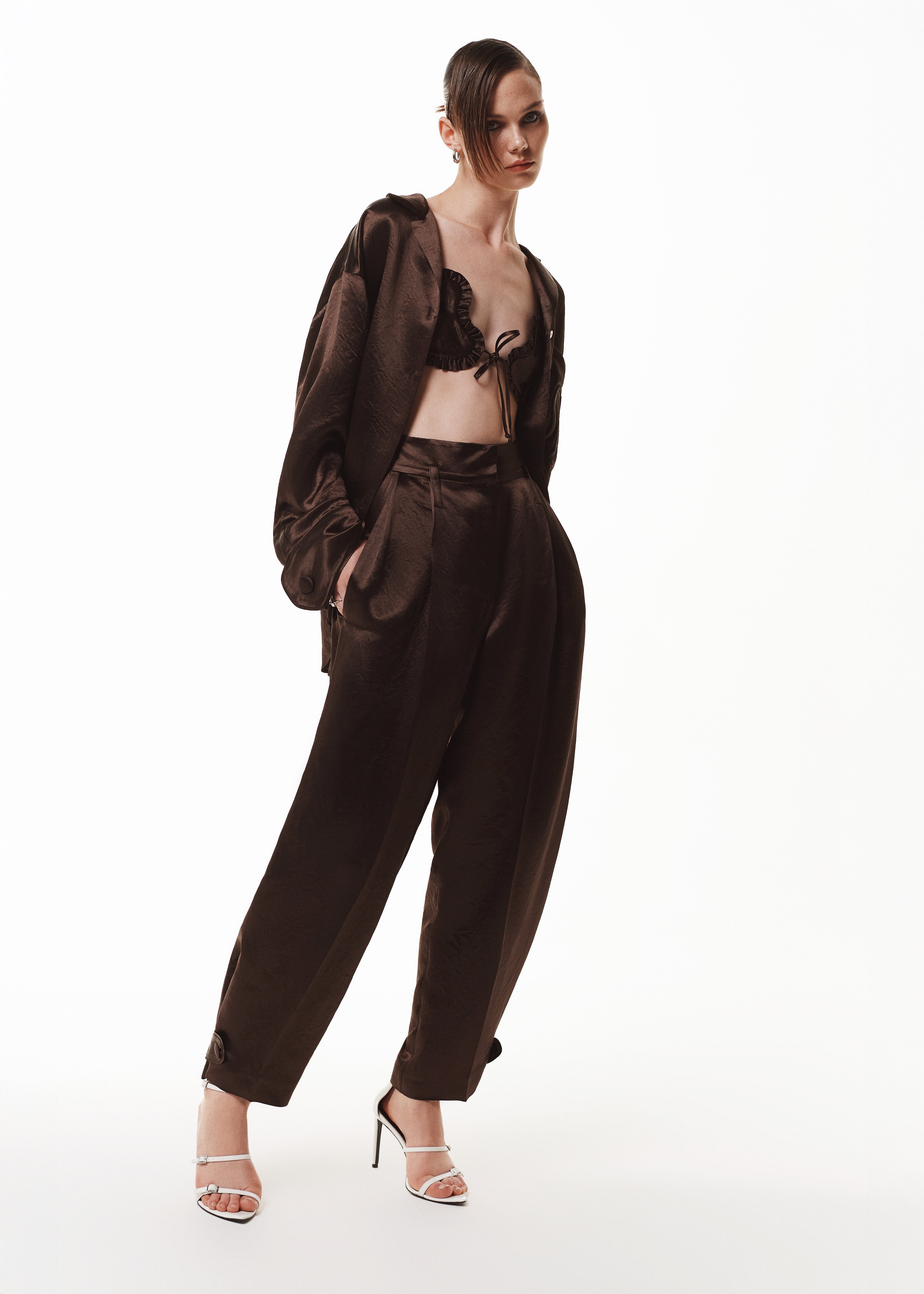 This season, our signature banana pants, now in a rich choco color, are tailored from fluid and sheen fabric, which create a perfect sophisticated look. The high-rise, tight waistband is fastened with a zip fly, ensuring a perfect fit, while the double pleat detail adds a touch of refinement to the silhouette.