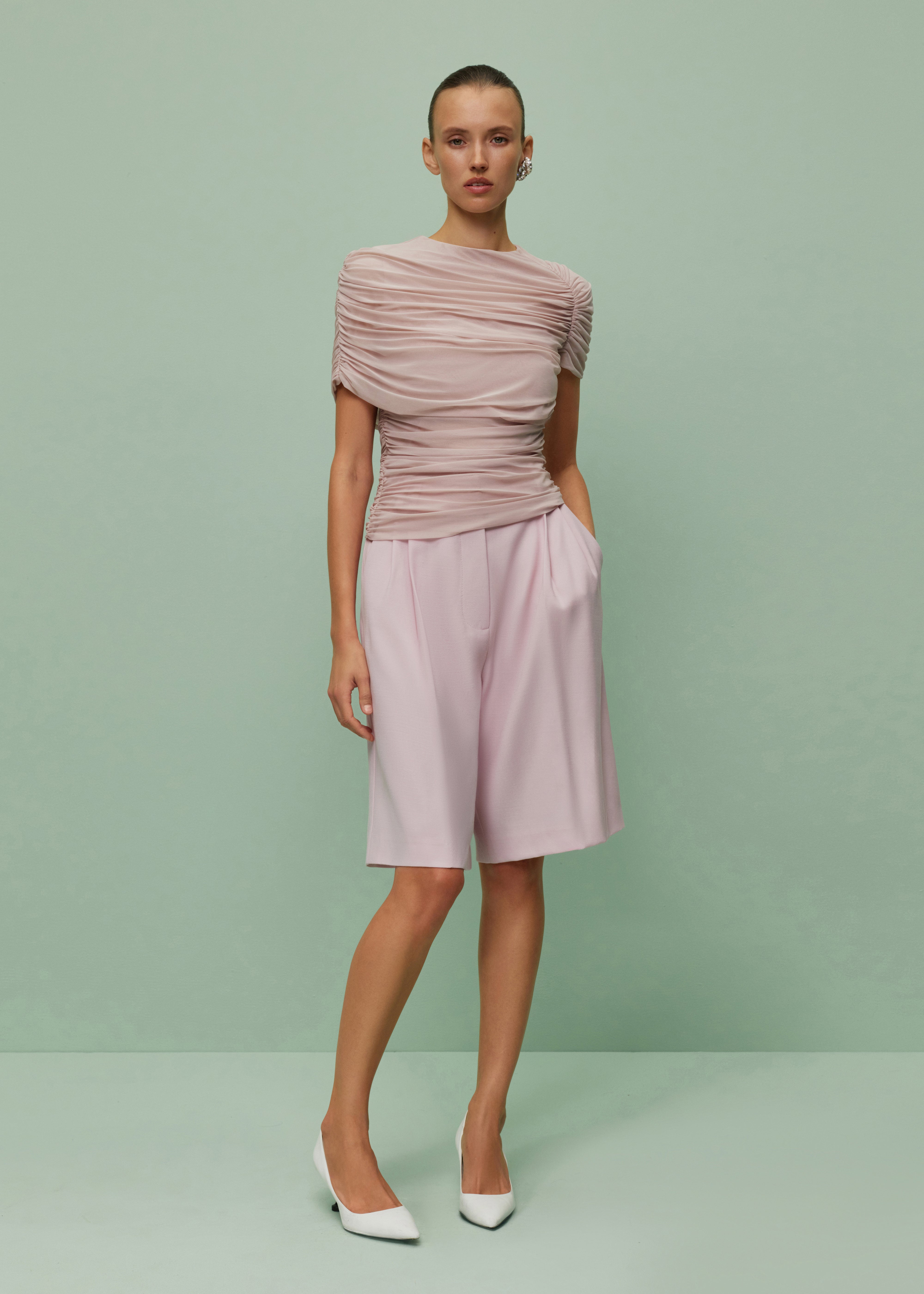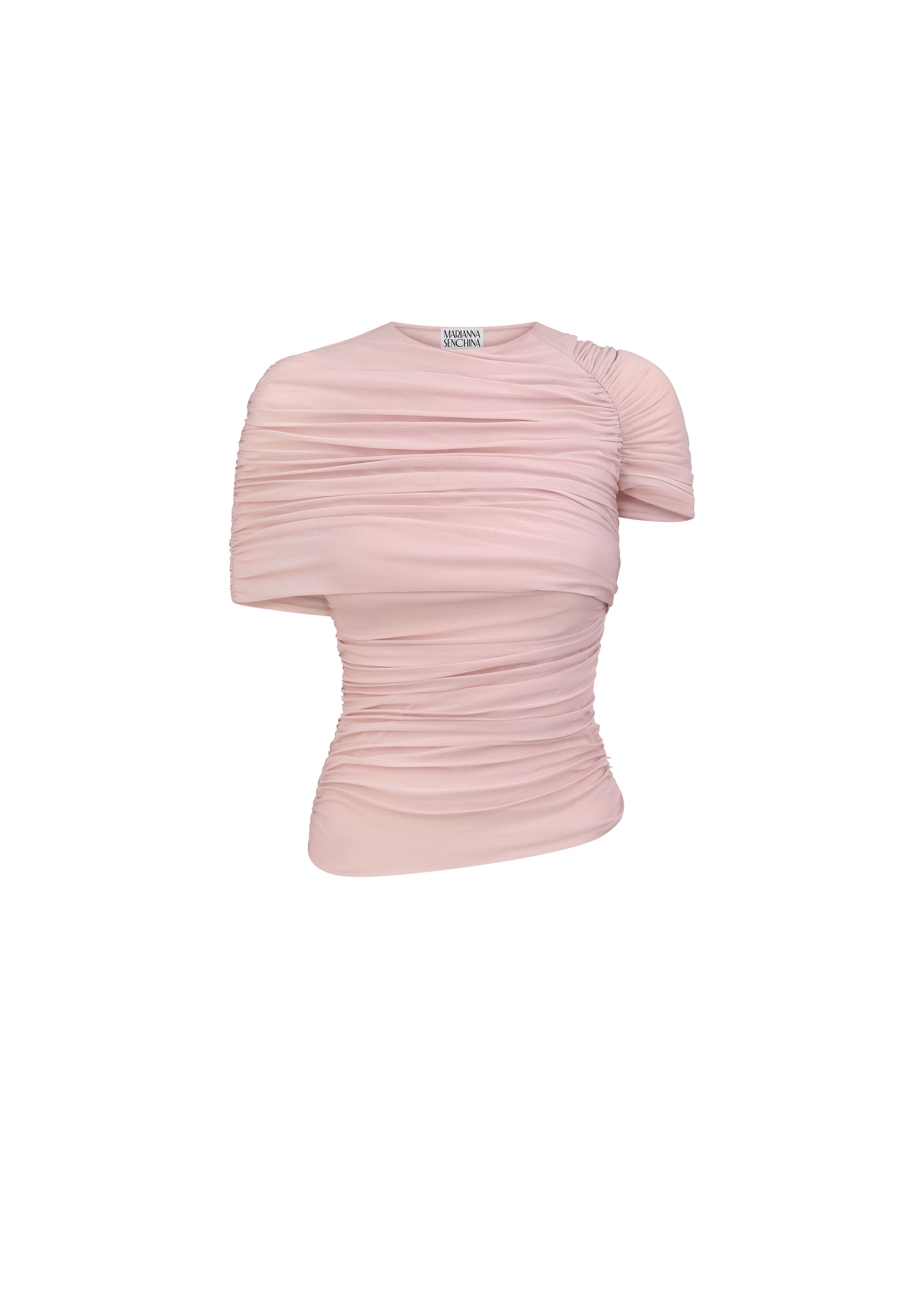 One sleeve ruched top with shawl in sheer lightweight dusty pink fabric.
