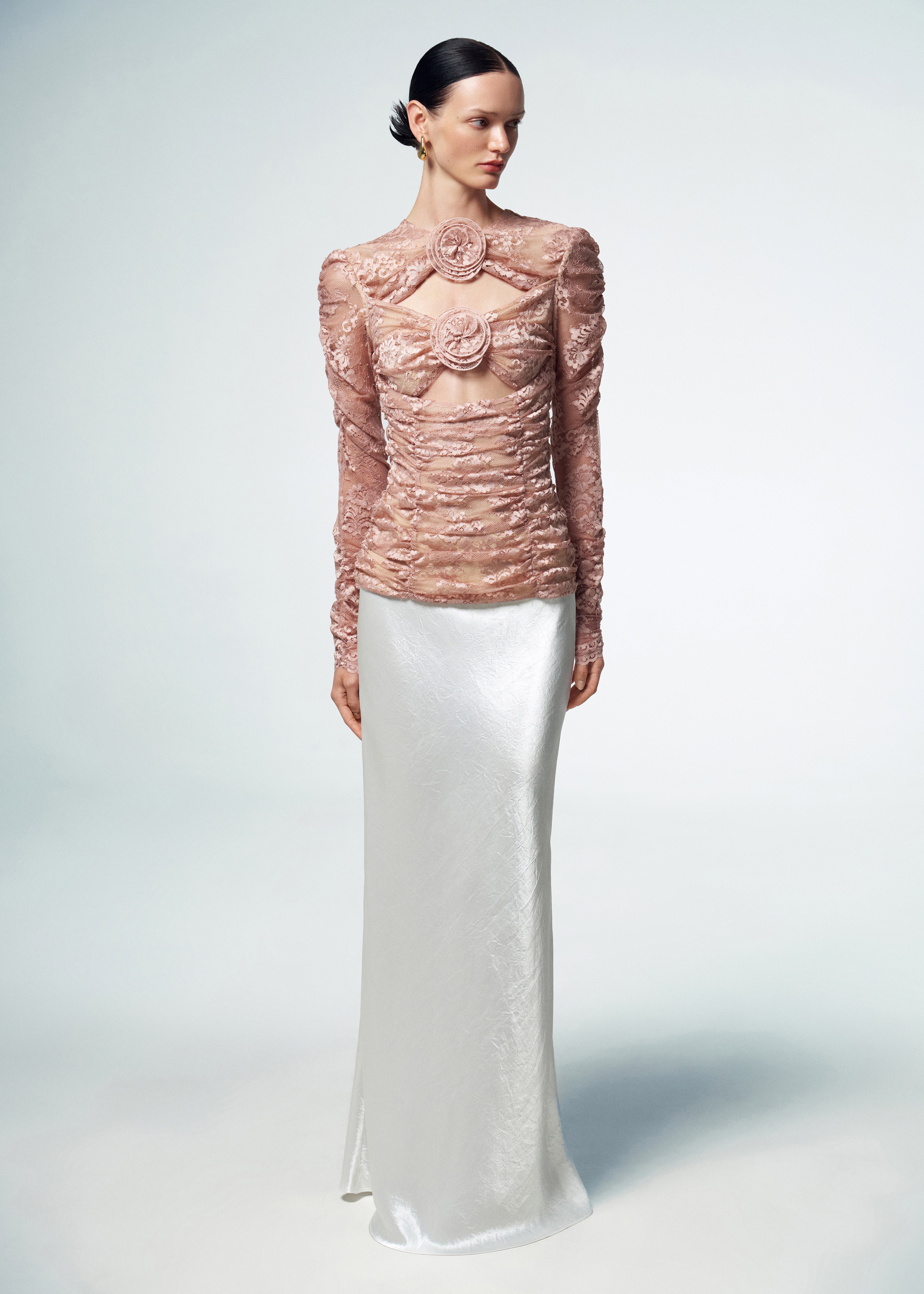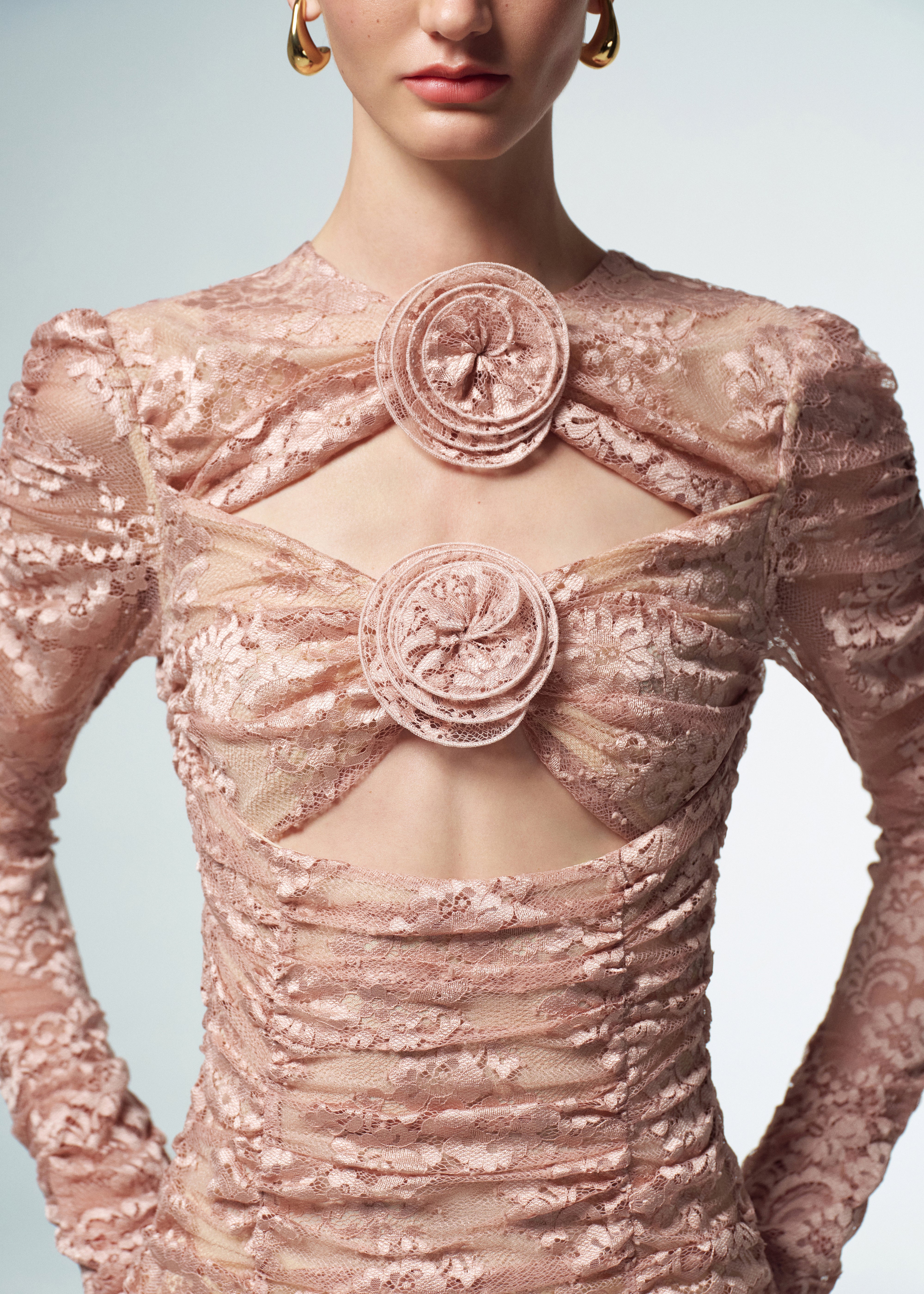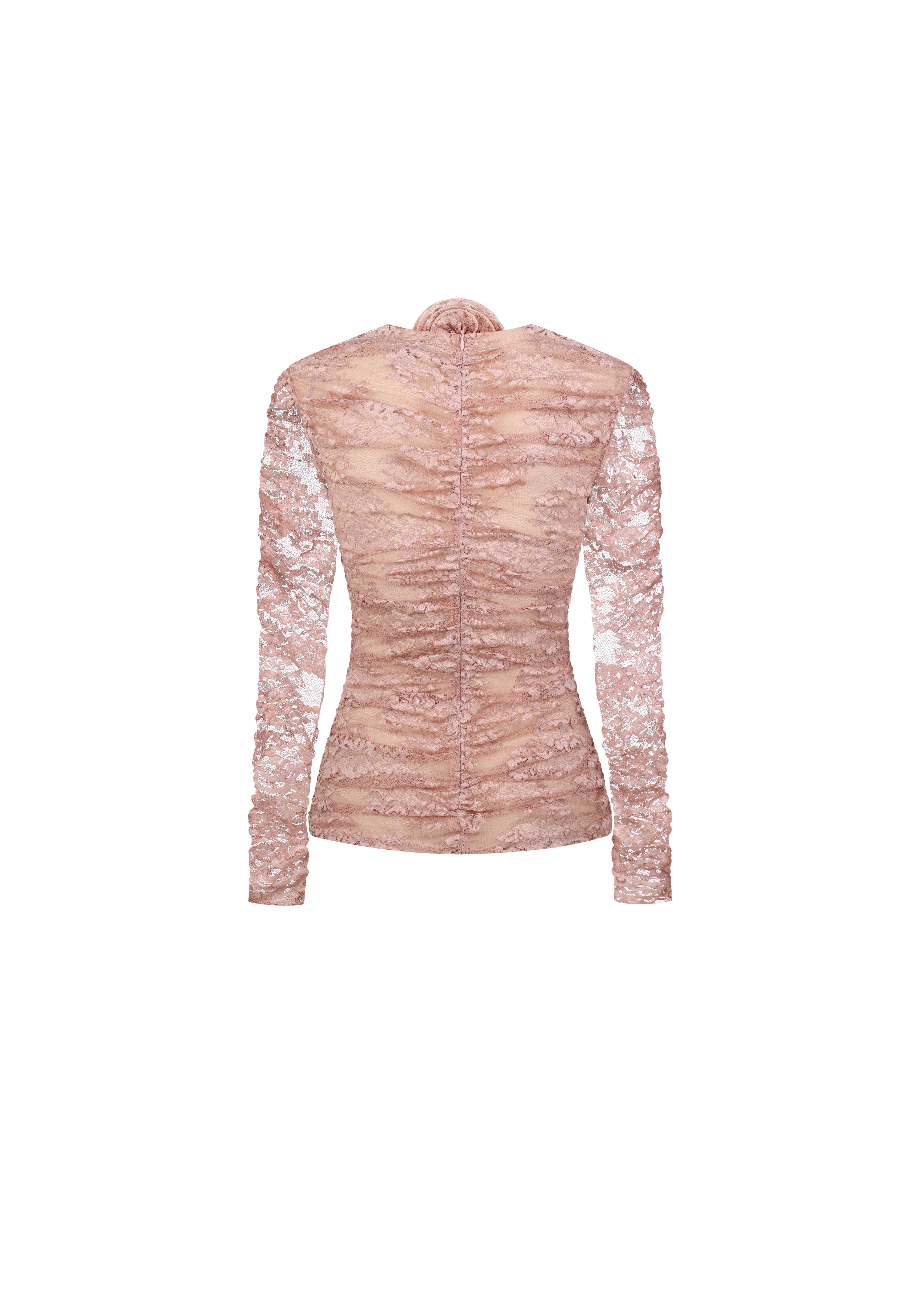 Long-sleeve rushed top adorned with delicate handmade flowers. Crafted from dusty pink mesh in floral print. The strict crew neckline beautifully contrasts with alluring cutouts on the chest area, embellished with two handcrafted 3D flowers, introducing a playful and eye-catching element. The stretchy fabric ensures a comfortable and confident fit, while the rushing on two sides enhances the flattering silhouette. Fastened with a concealed back zipper.