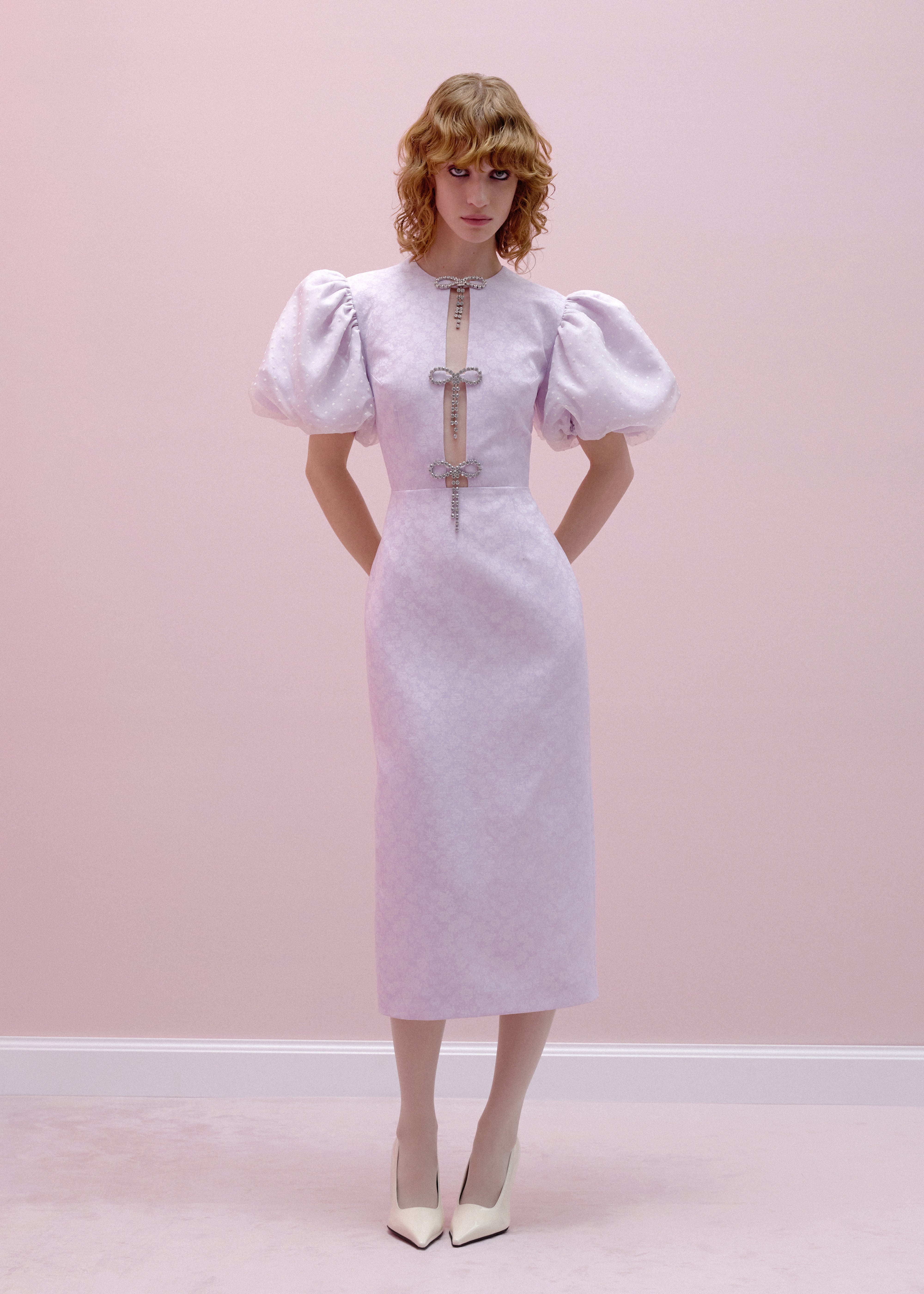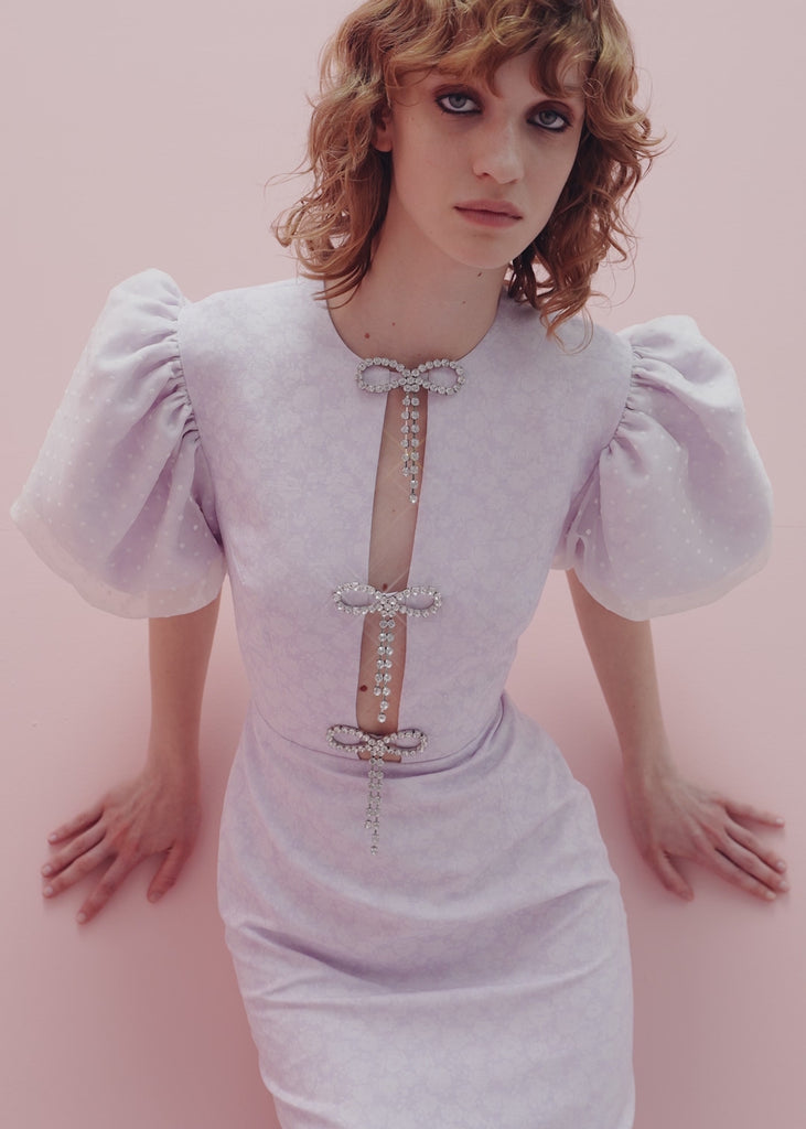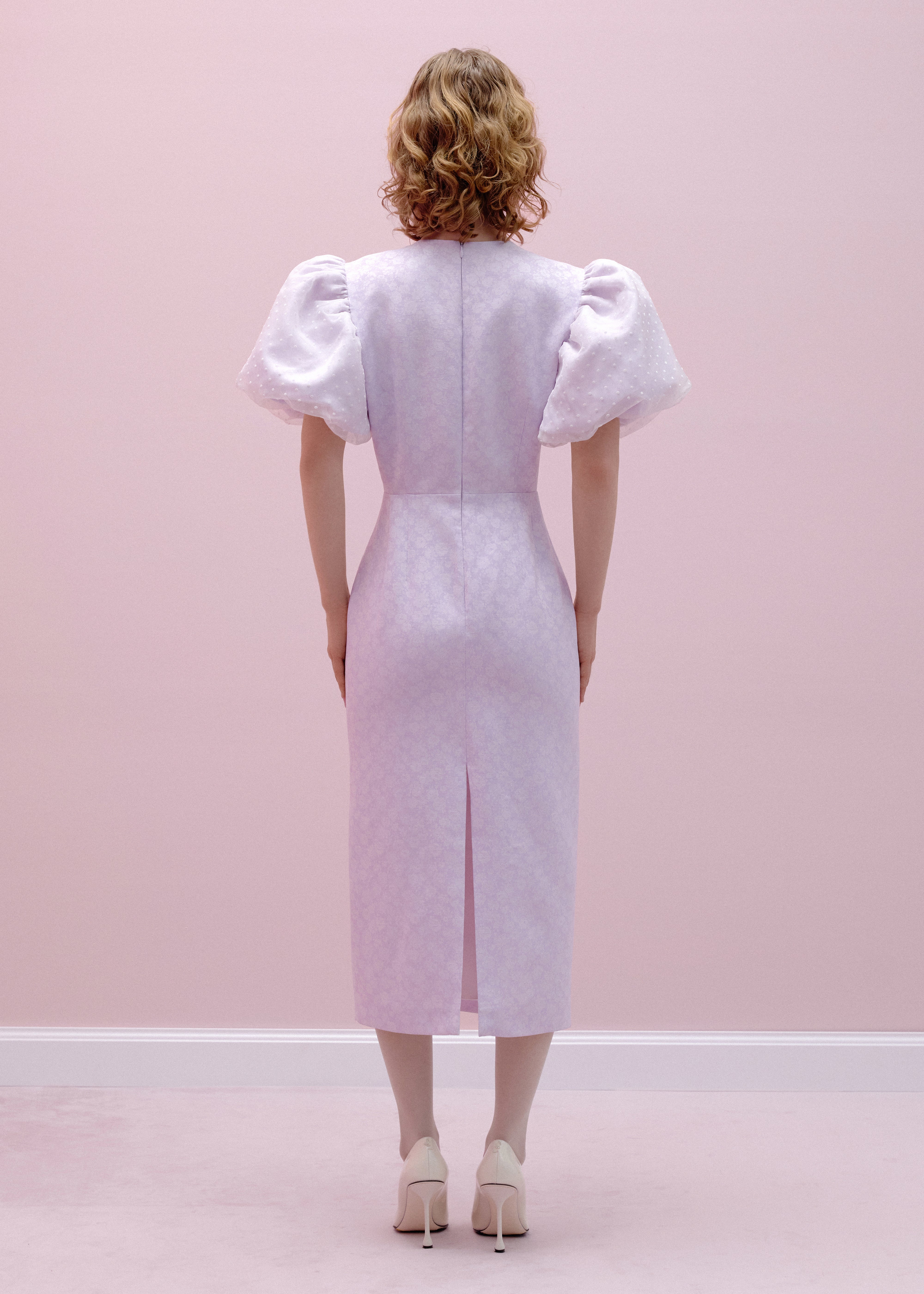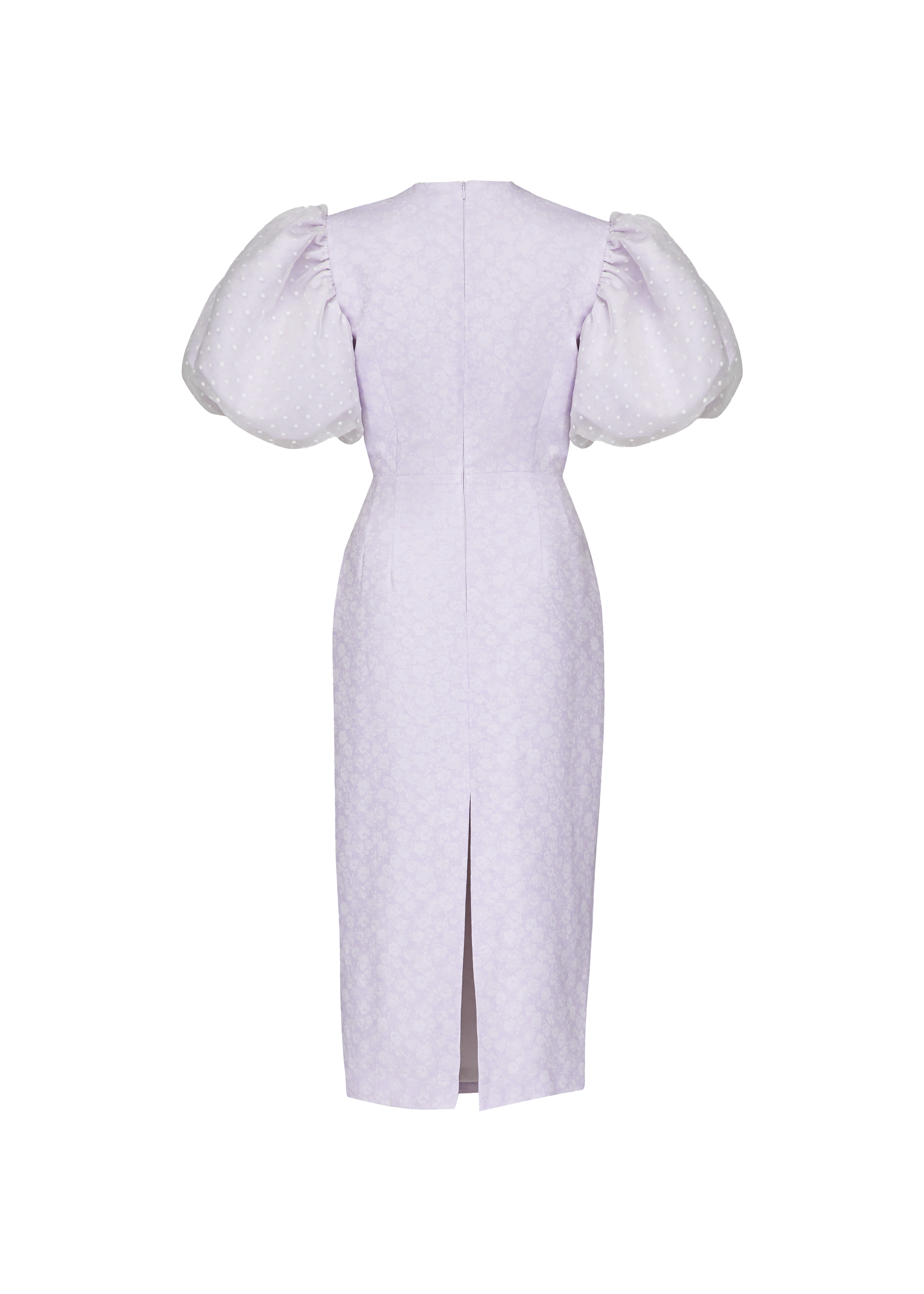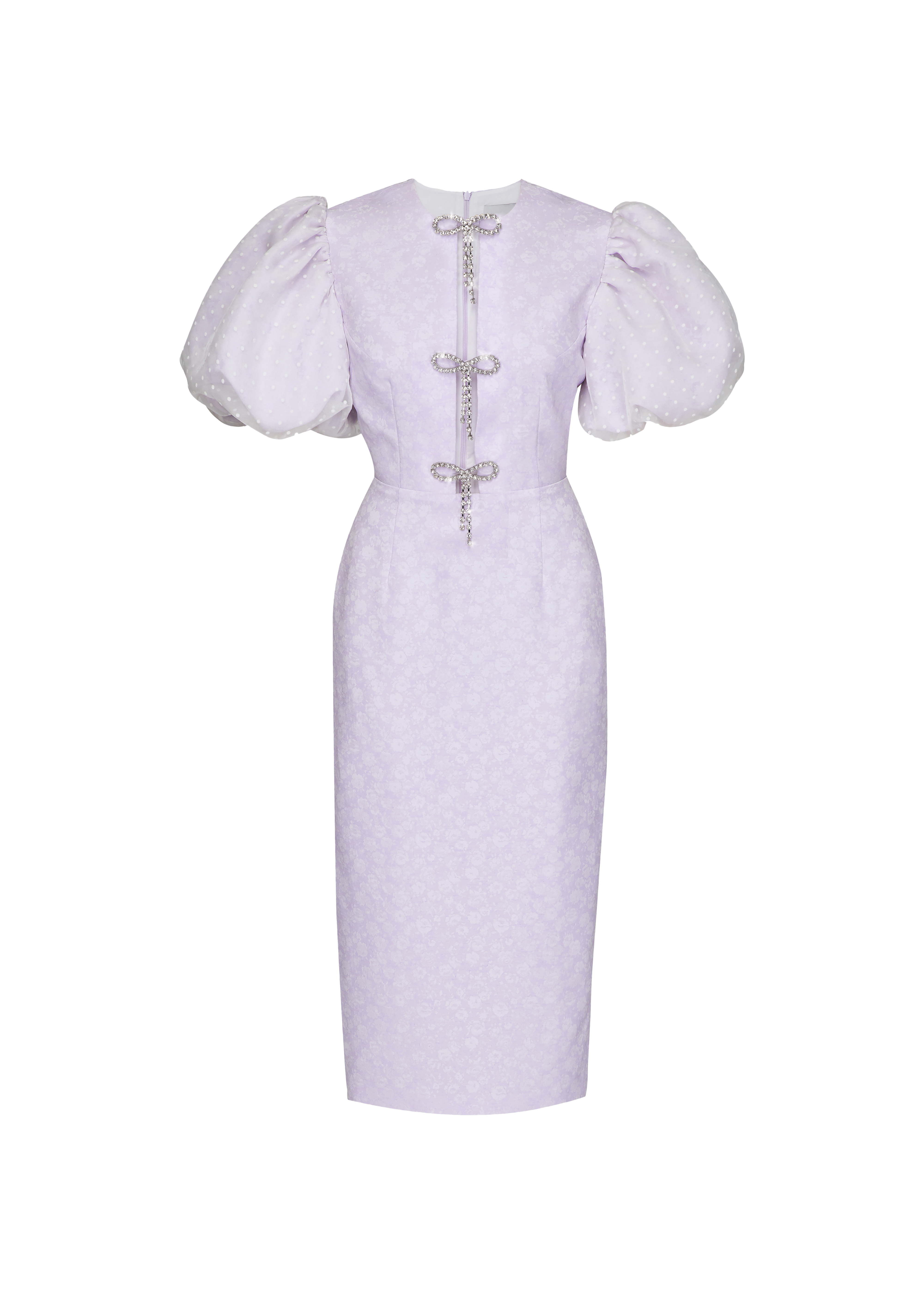 In a stunning floral print lilac color, this midi dress is the epitome of classiness. The dress features a crewneck and a cutout on the abdomen, which is elegantly complemented with three 3D mini crystal bows for a touch of sparkle. The dress also boasts organza buff sleeves in flocked white polka dots, providing a subtle texture that adds depth to the design. The pencil skirt is designed with a slit at the back, allowing for ease of movement. The dress fastens with a concealed back zipper and is fully lined for comfort and a seamless finish.