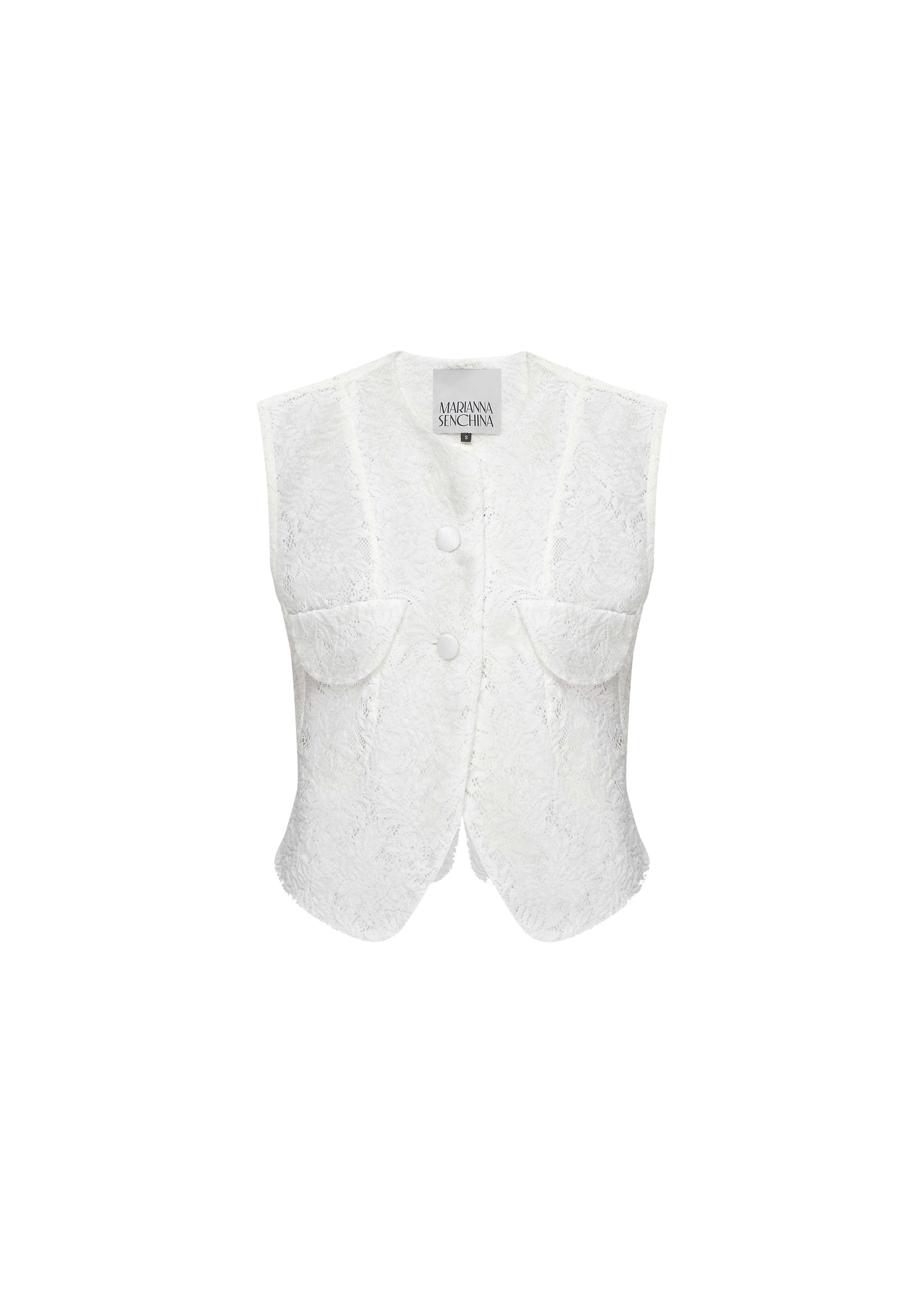 Embrace a touch of enchantment on your special day with our Bride-to-be cropped sleeveless vest. Crafted from delicate white lace in a charming flower pattern, this piece showcases a unique cut-out design on the back, adding an alluring element to the overall look. Fastened with two buttons, covered in satin fabric, and featuring imitation flaps at the front. With its modern round neckline and flattering cropped silhouette, the vest complements the Bride-to-be jacket and pants perfectly, creating a coordinated ensemble that's simply unforgettable. Whether you're walking down the aisle or attending a romantic event, this vest is a stunning addition that captures hearts and leaves a lasting impression.