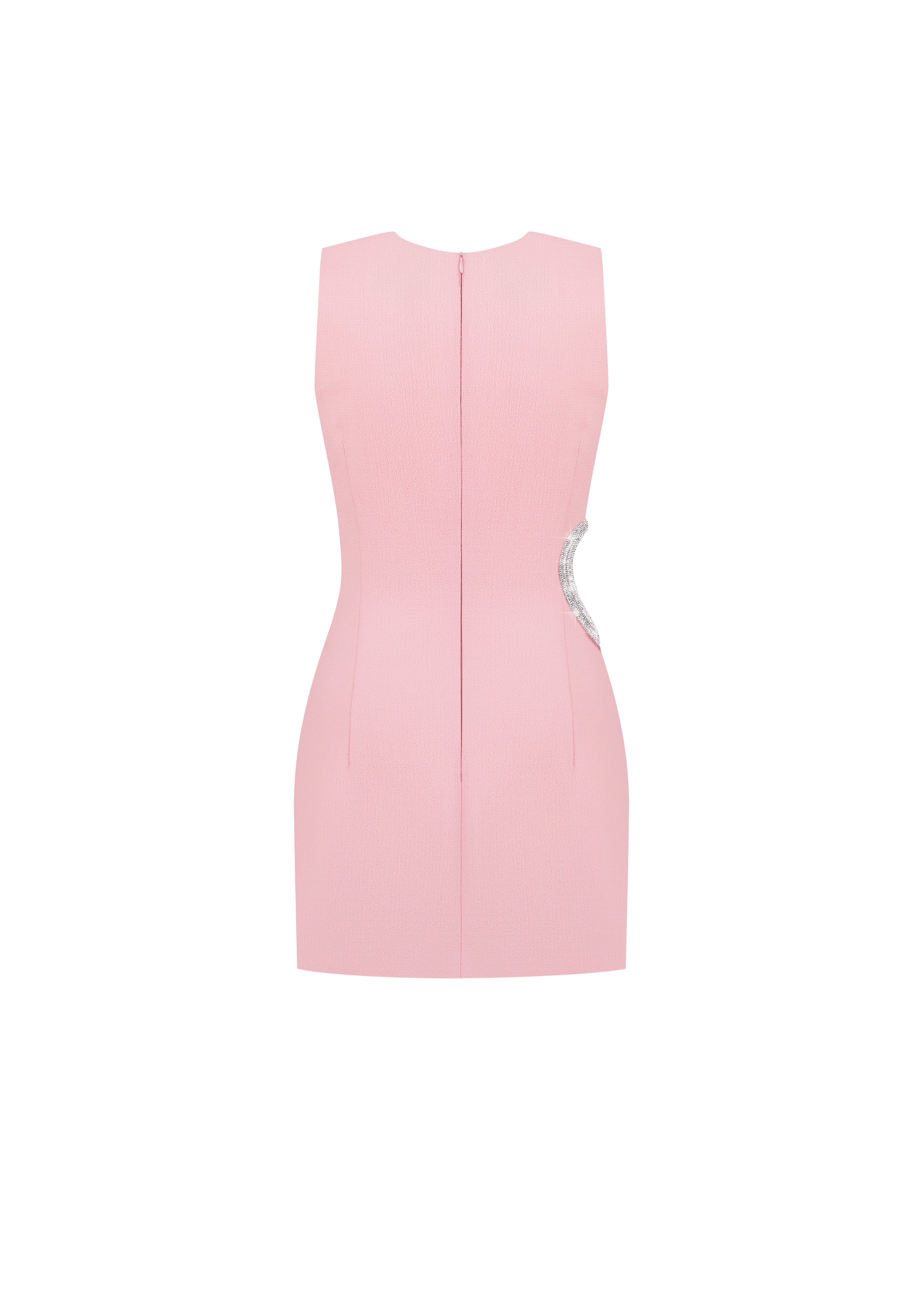 Crafted in a vibrant pink hue, this sleeveless mini dress features a round neck and a flattering structured silhouette. The most captivating features is the heart-shaped cut-out at the waist, embellished with shimmering crystals, adding a touch of glamour and sophistication. The dress is fastened with a concealed back zipper and hook and eye closure, fully lined.