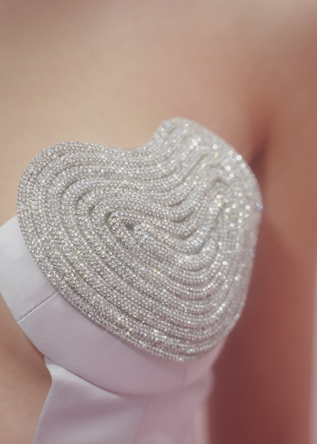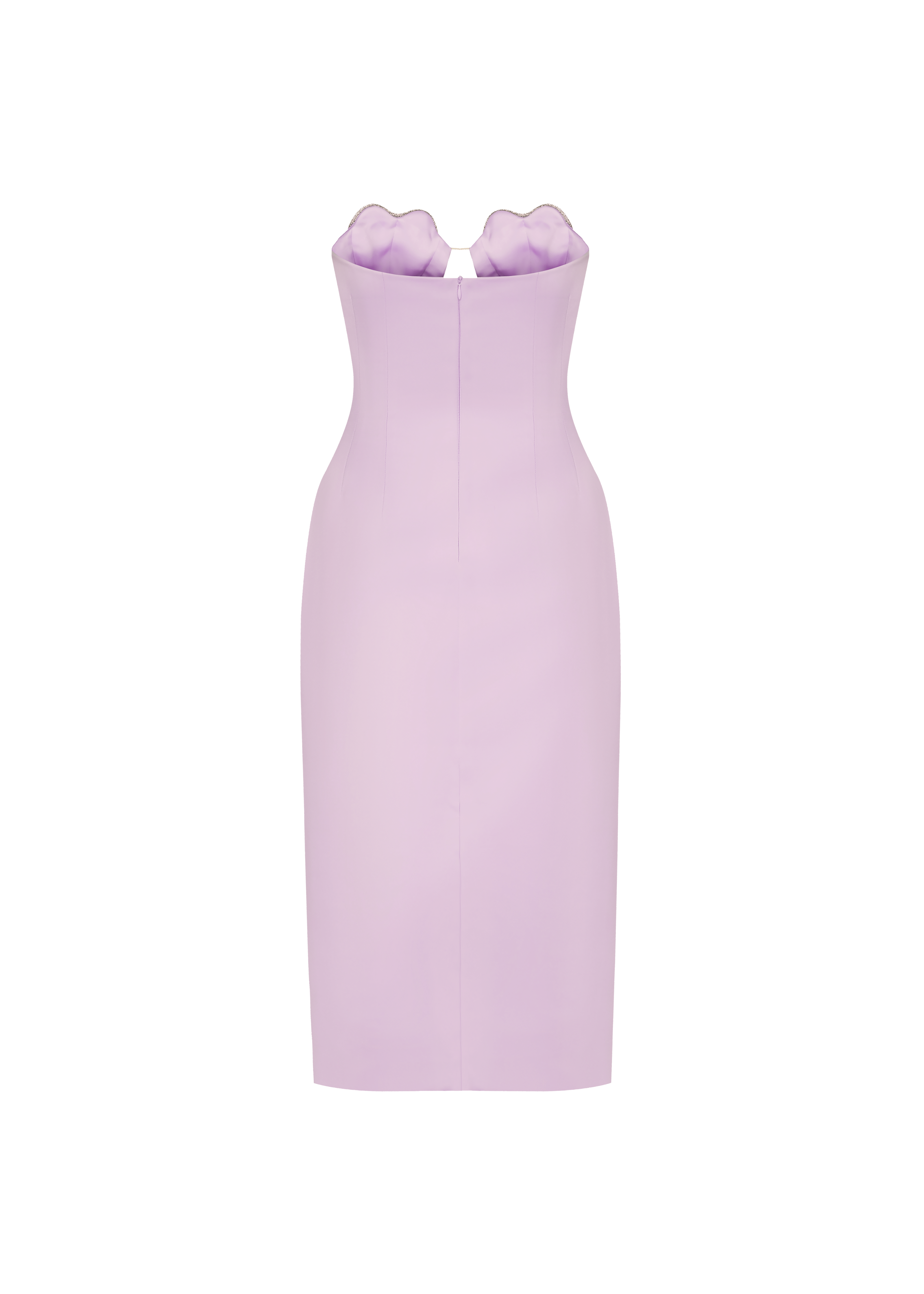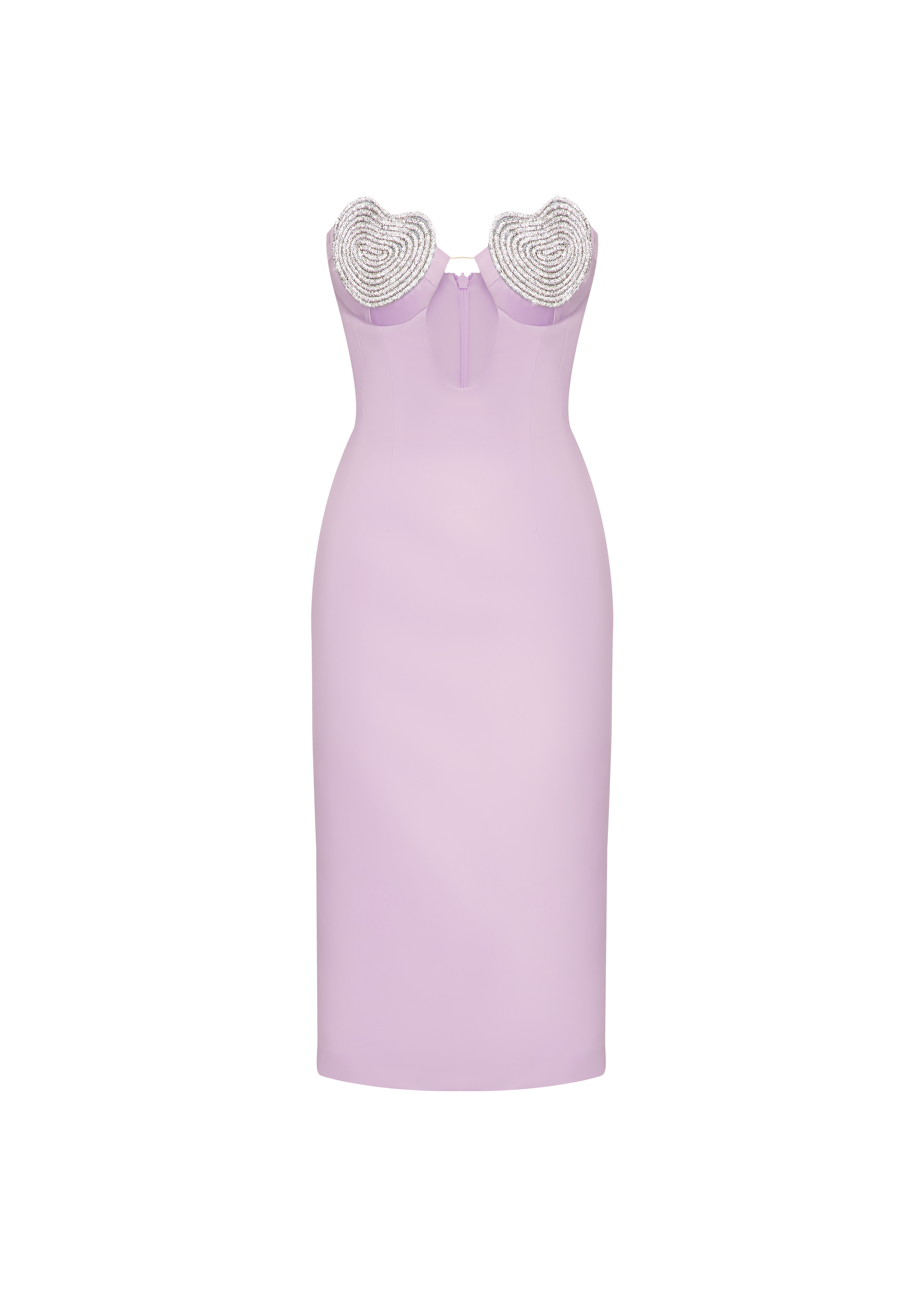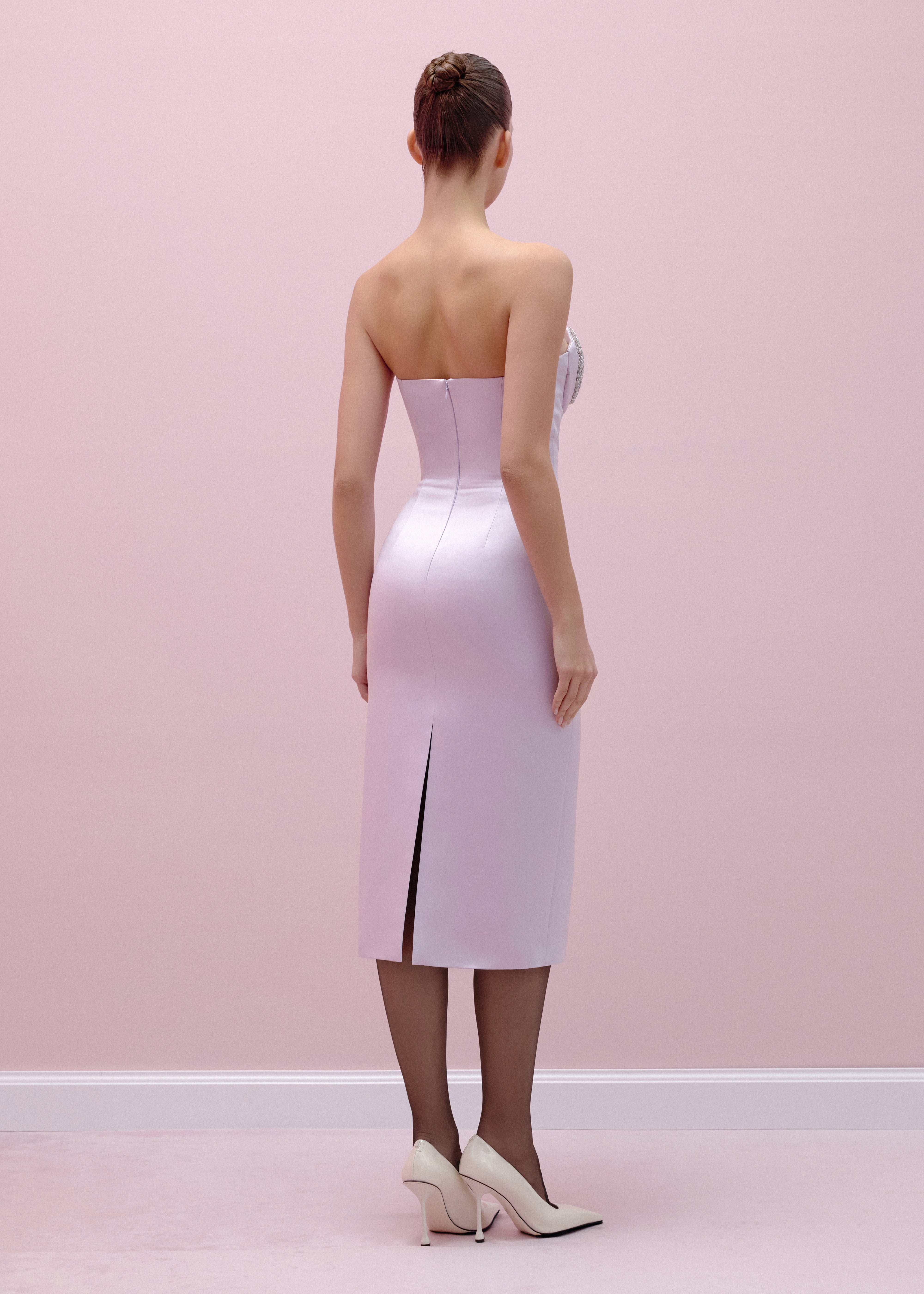 Strapless midi dress, exquisitely designed to showcase the figure with its tight-fitting silhouette that creates flawless flowing shapes. This elegant dress boasts a fitted bustier with an inner corset and a sculpting skirt, creating a truly feminine figure. The keyhole cutout at the bust adds a touch of allure, while the heart-shaped bustier cups are delicately handcrafted and adorned with sparkling crystals, connected by a transparent thread for a subtle and elegant effect. The dress is fastened with a concealed back zipper and hook and eye, ensuring a seamless finish. Fully lined.