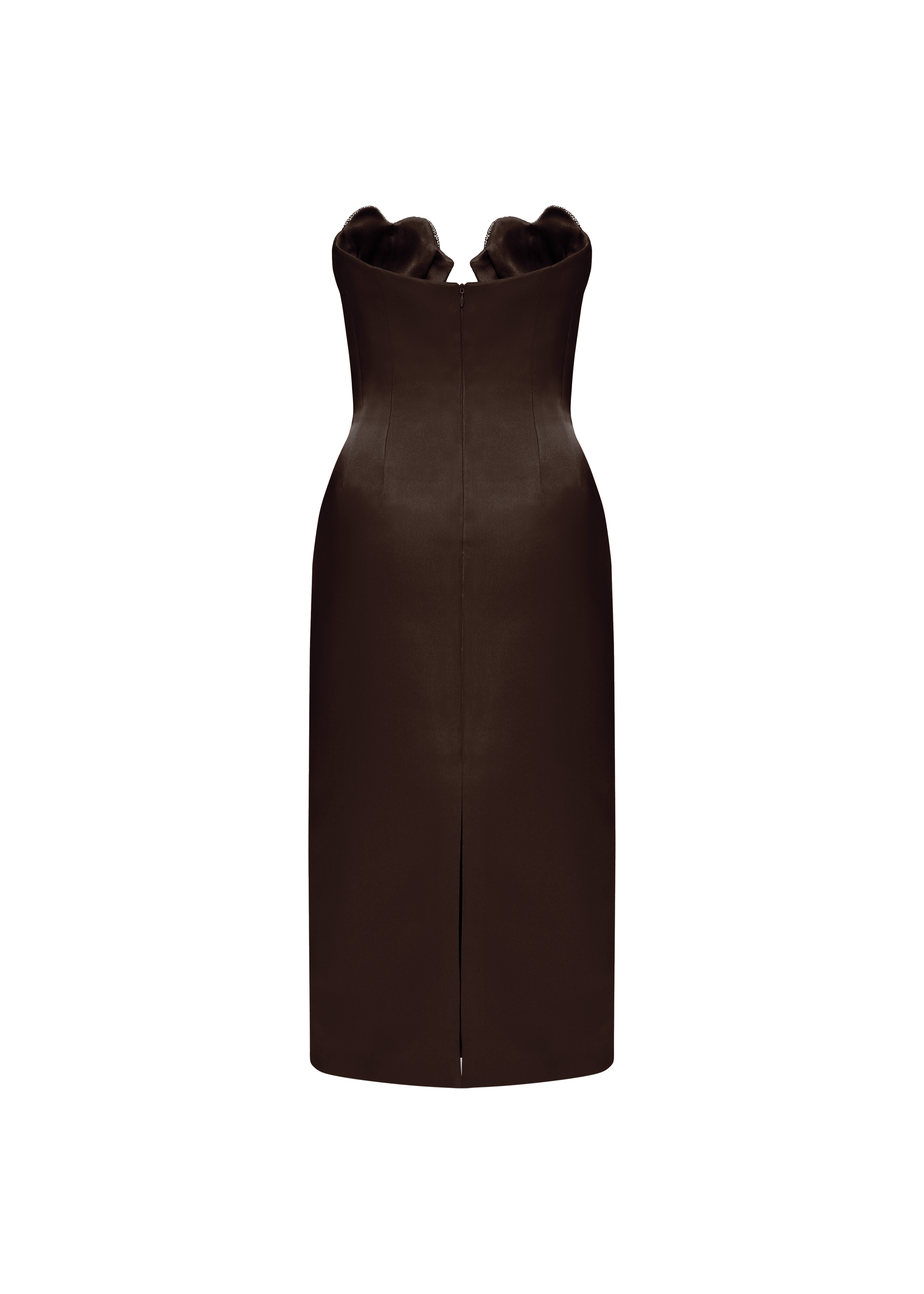 Mermaid Midi Dress is a stunning addition to this season's collection, now in a rich Chocolate brown hue with matching brown crystals for an elegant twist. This strapless midi dress boasts a fitted bustier and inner corset, sculpting a tight-fitting silhouette that accentuates feminine curves with grace. The keyhole cutout at the bust adds allure, while meticulously handcrafted heart-shaped bustier cups adorned with sparkling crystals create a captivating focal point, connected by a transparent thread for a subtle yet glamorous effect. Fastened with a concealed back zipper and hook and eye closure, this dress ensures a seamless finish. Fully lined for utmost comfort.