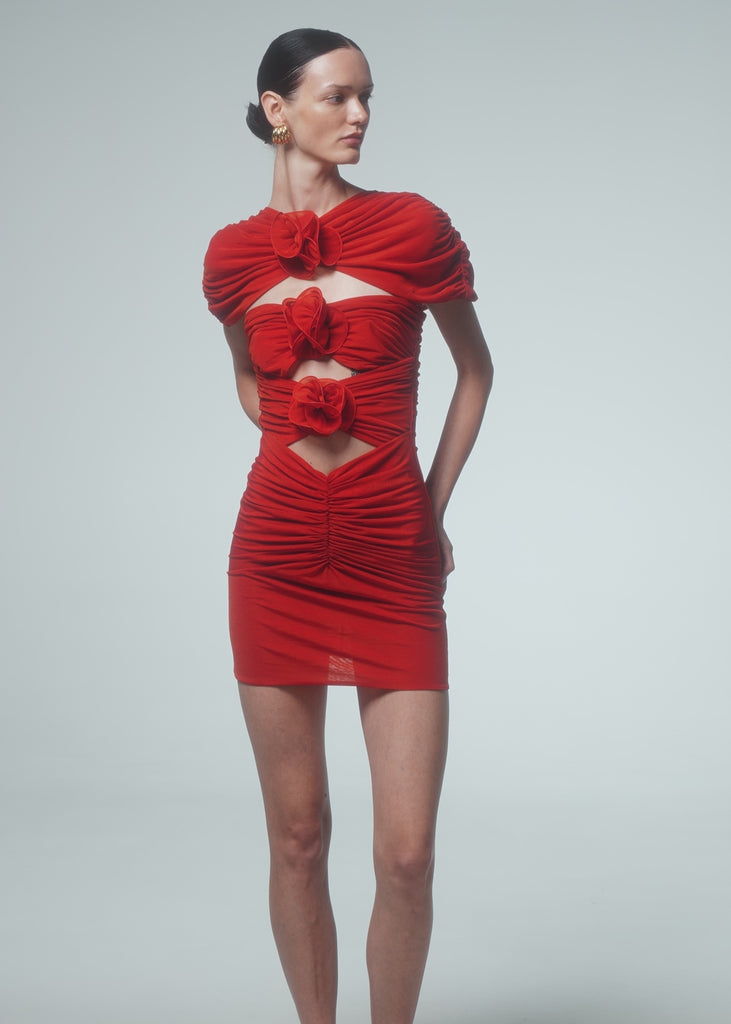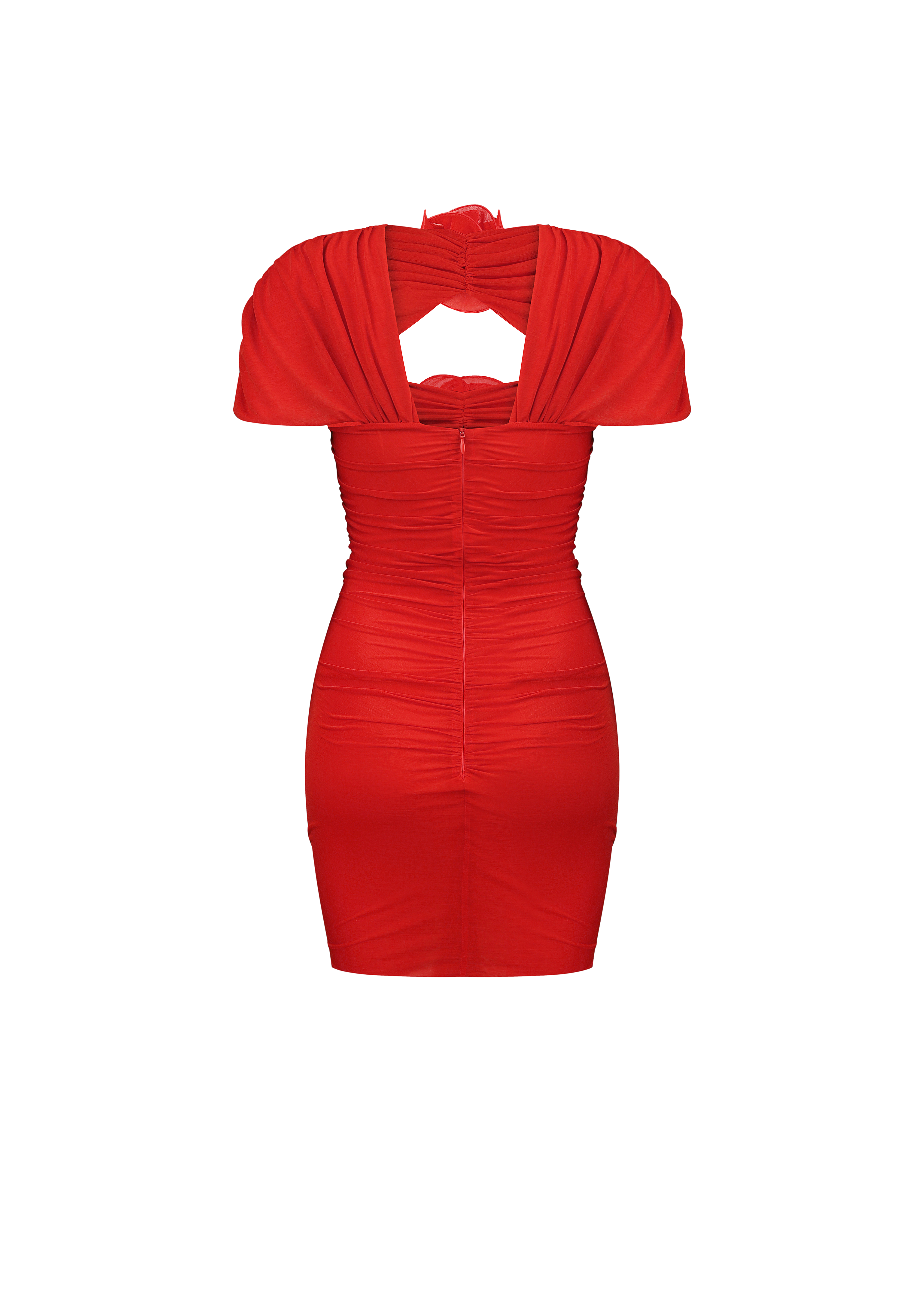 Wild Orchid ruched mini dress, a daring fusion of modern elegance and feminine allure. Crafted in a vibrant scarlet red hue, this dress features chic ruched detailing that contours the body. What sets it apart are the intricate cutouts adorning with handcrafted flowers, adding a bold and edgy touch. Fastened with concealed back zipper and hook and eye closure.
