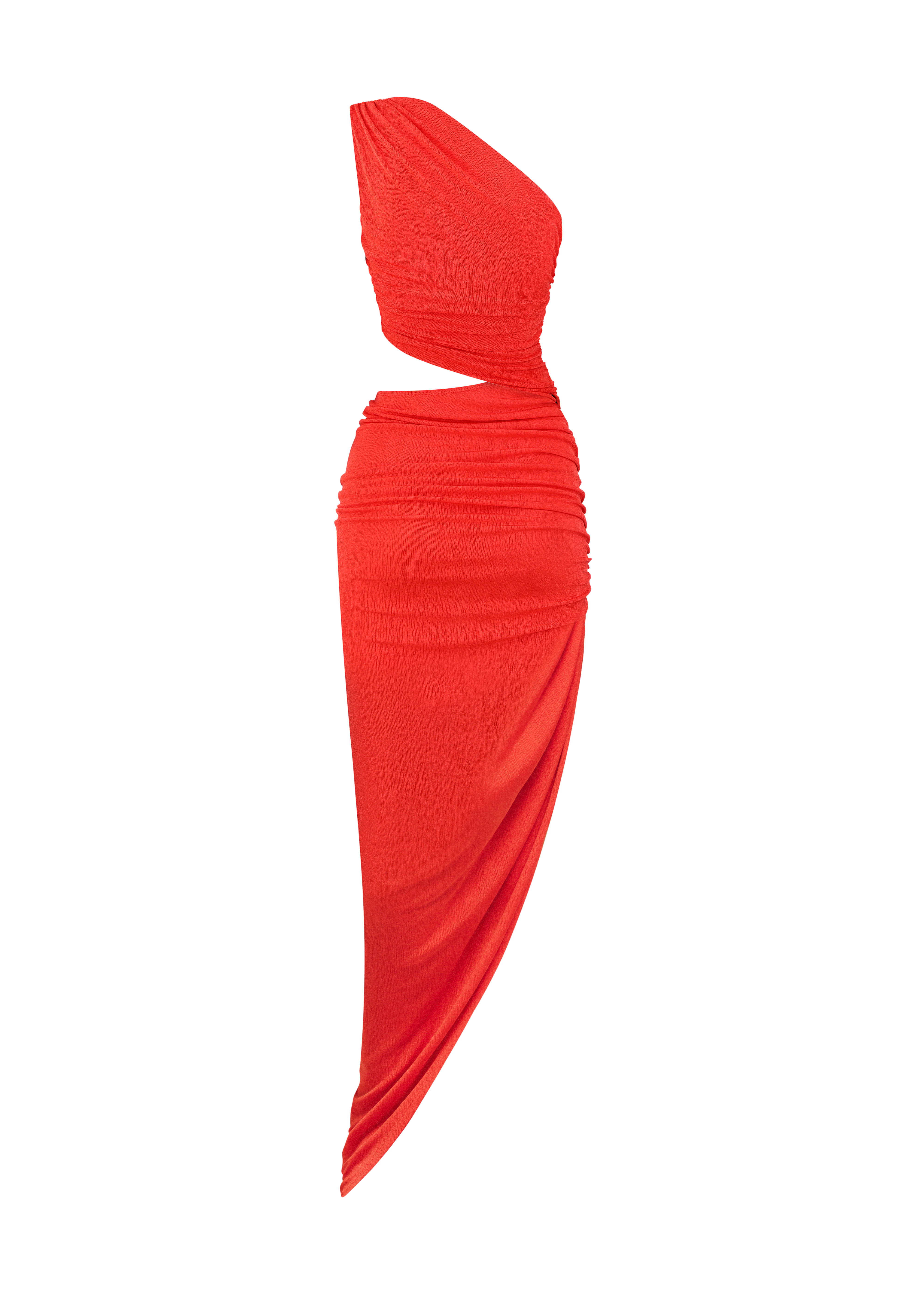 Трикотажна сукня на одне плече. Асиметричний силует підкреслюється рюшами і сміливим вирізом на талії. Виготовлена з м'якої, еластичної тканини, вона облягає ваші вигини забезпечуючи бездоганну посадку, що робить її ідеальним вибором для різних випадків.