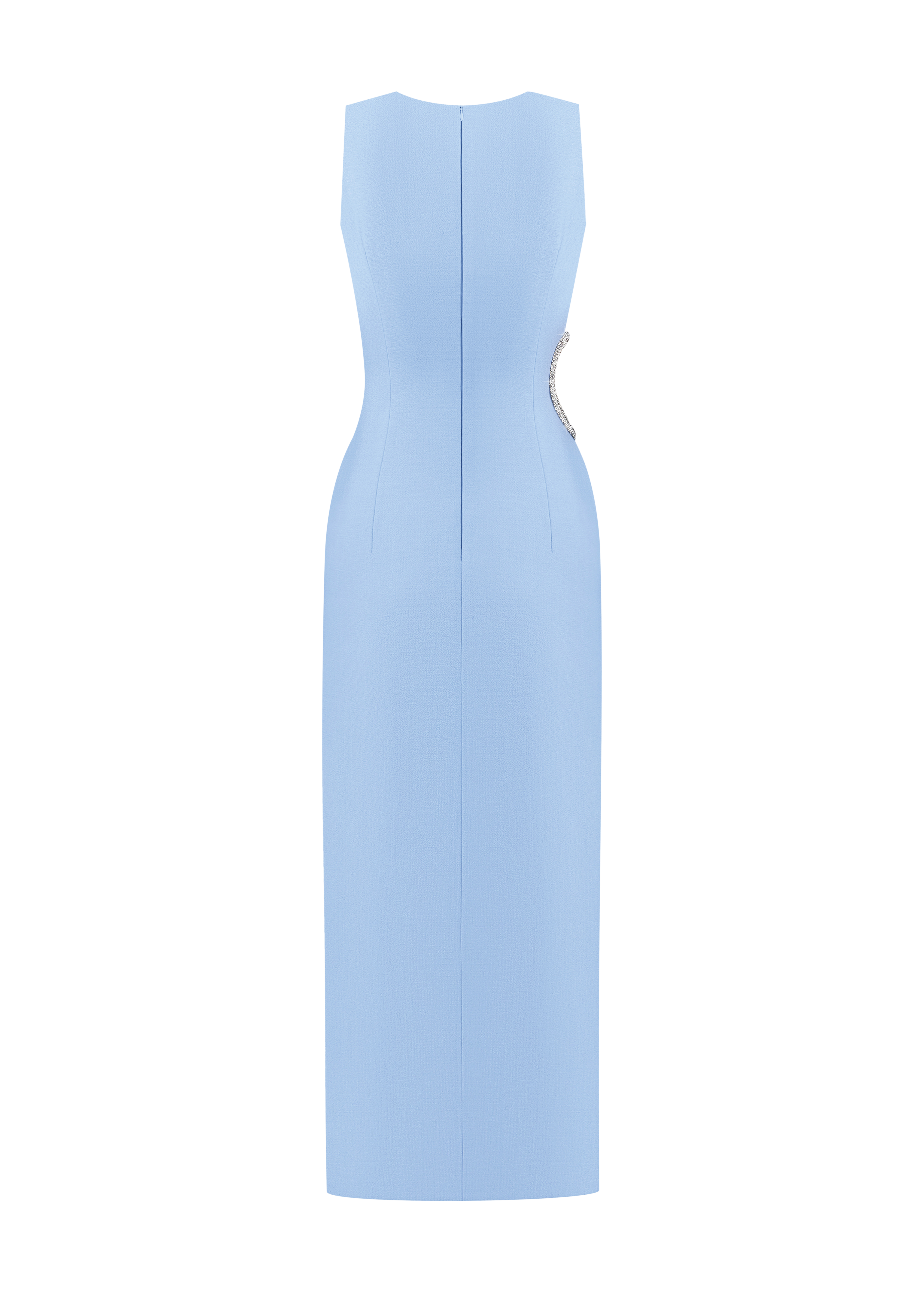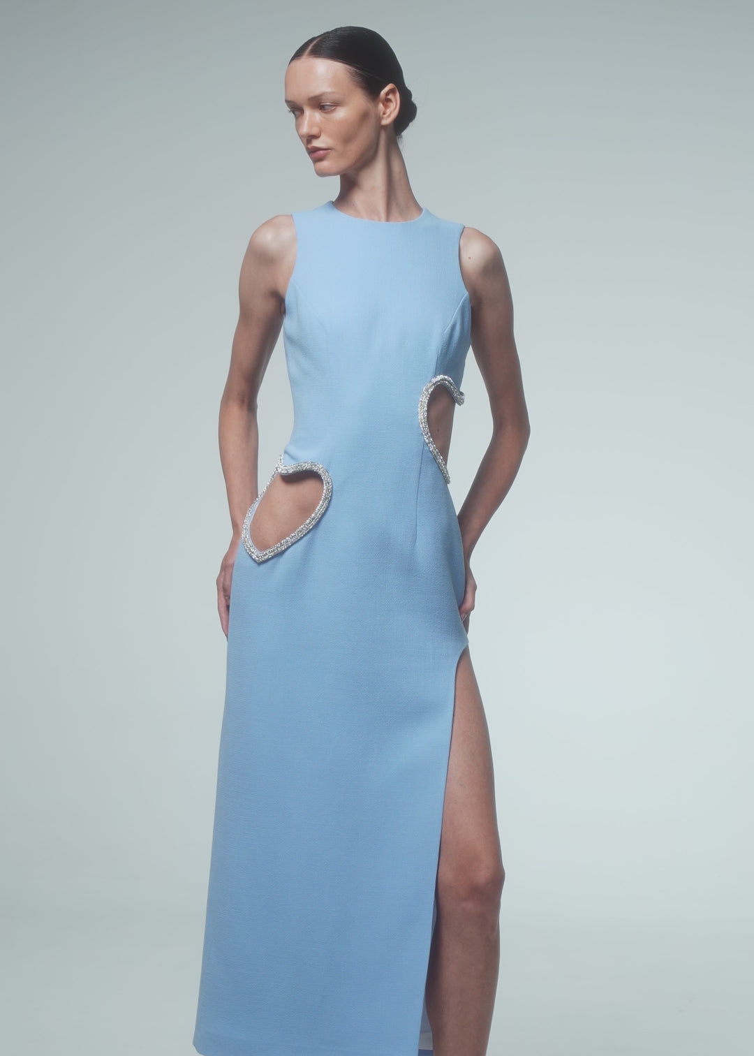 Ця міді-сукня без рукавів має круглий виріз горловини та структурований силует. Її особливістю є виріз у формі серця на талії, прикрашений мерехтливими кристалами, що додають нотку гламуру та вишуканості. Сукня застібається на приховану блискавку ззаду та гачок, повністю на підкладці.