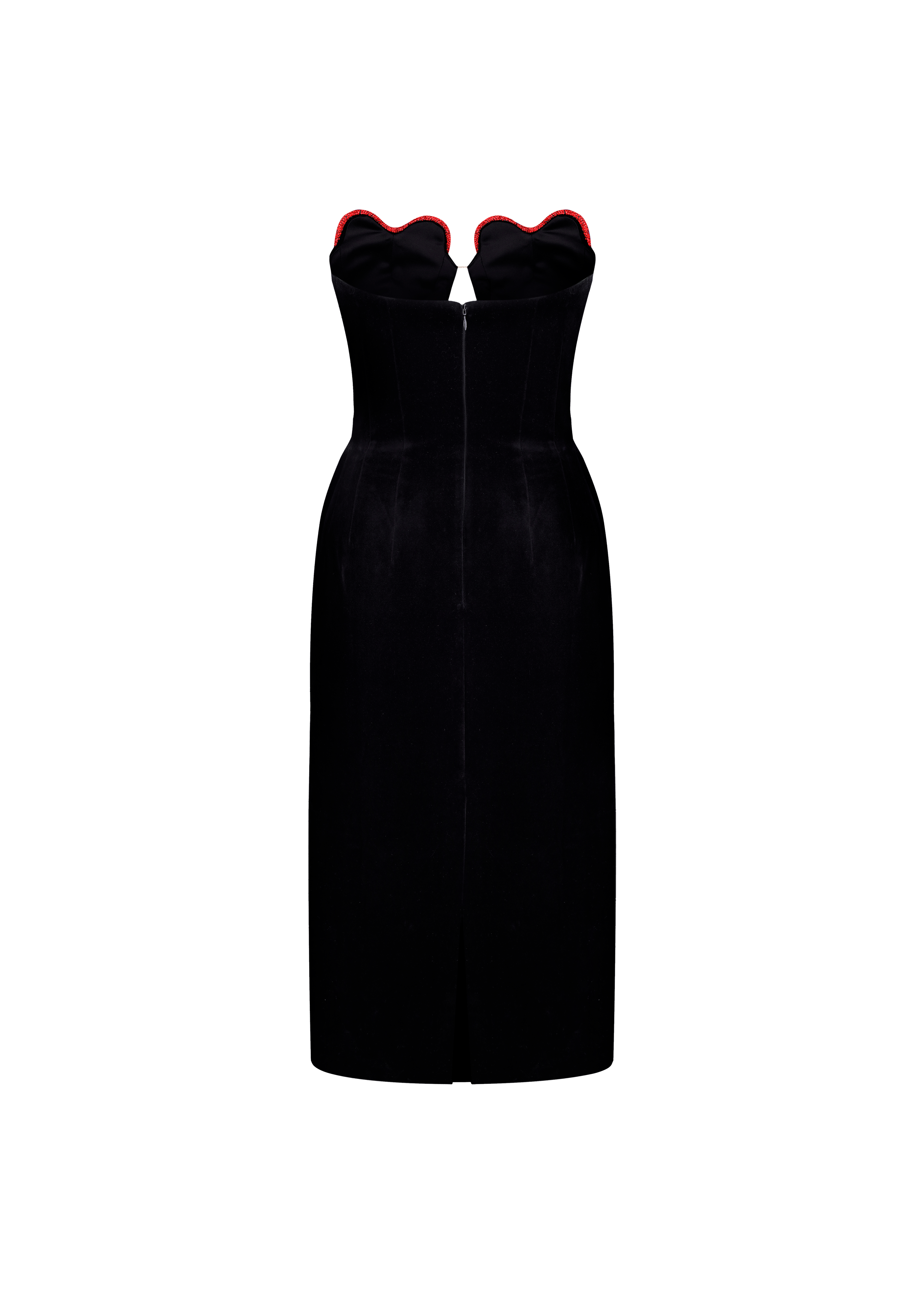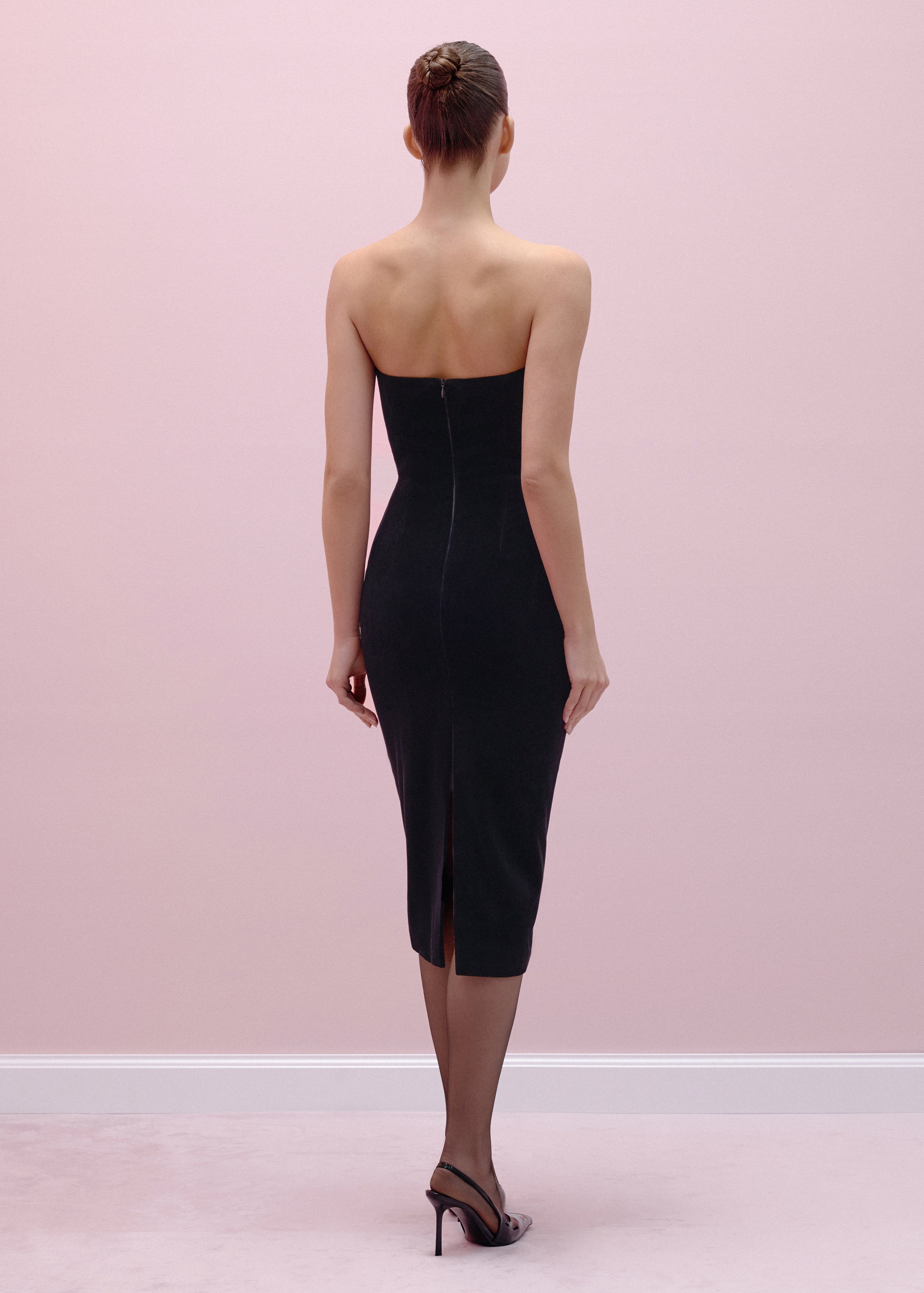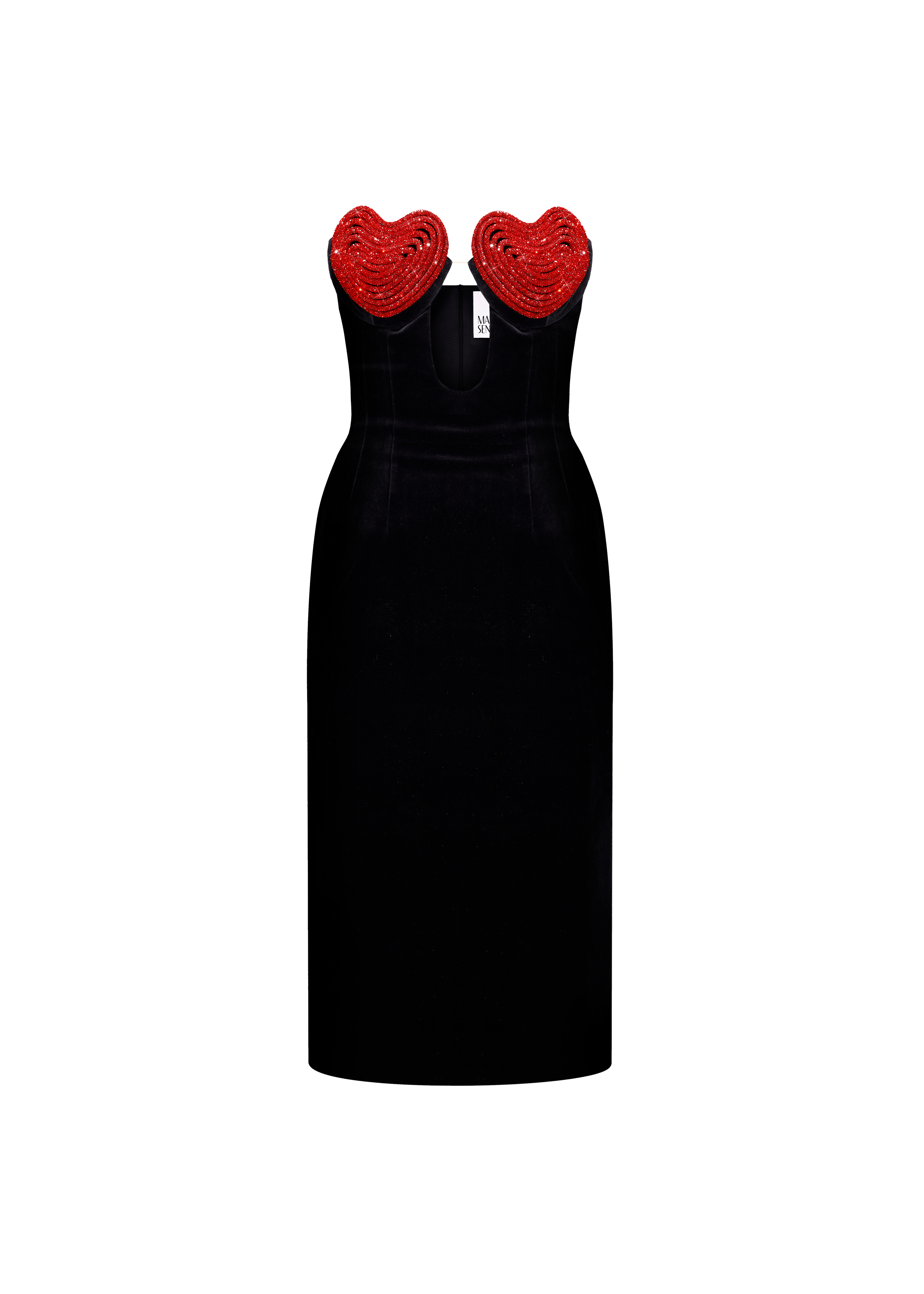 Міні-сукня без бретелей має облягаючий бюстьє та внутрішній корсет, що підкреслює силует і витончено підкреслює жіночні вигини. Корсет має виріз у формі замкової щілини. Чашечки бюстьє ручної роботи у формі серця займають центральне місце, прикрашені кристалами та з'єднані прозорою ниткою для створення витонченого та елегантного ефекту. Застібається на приховану блискавку ззаду та гачок. Повністю на підкладці.