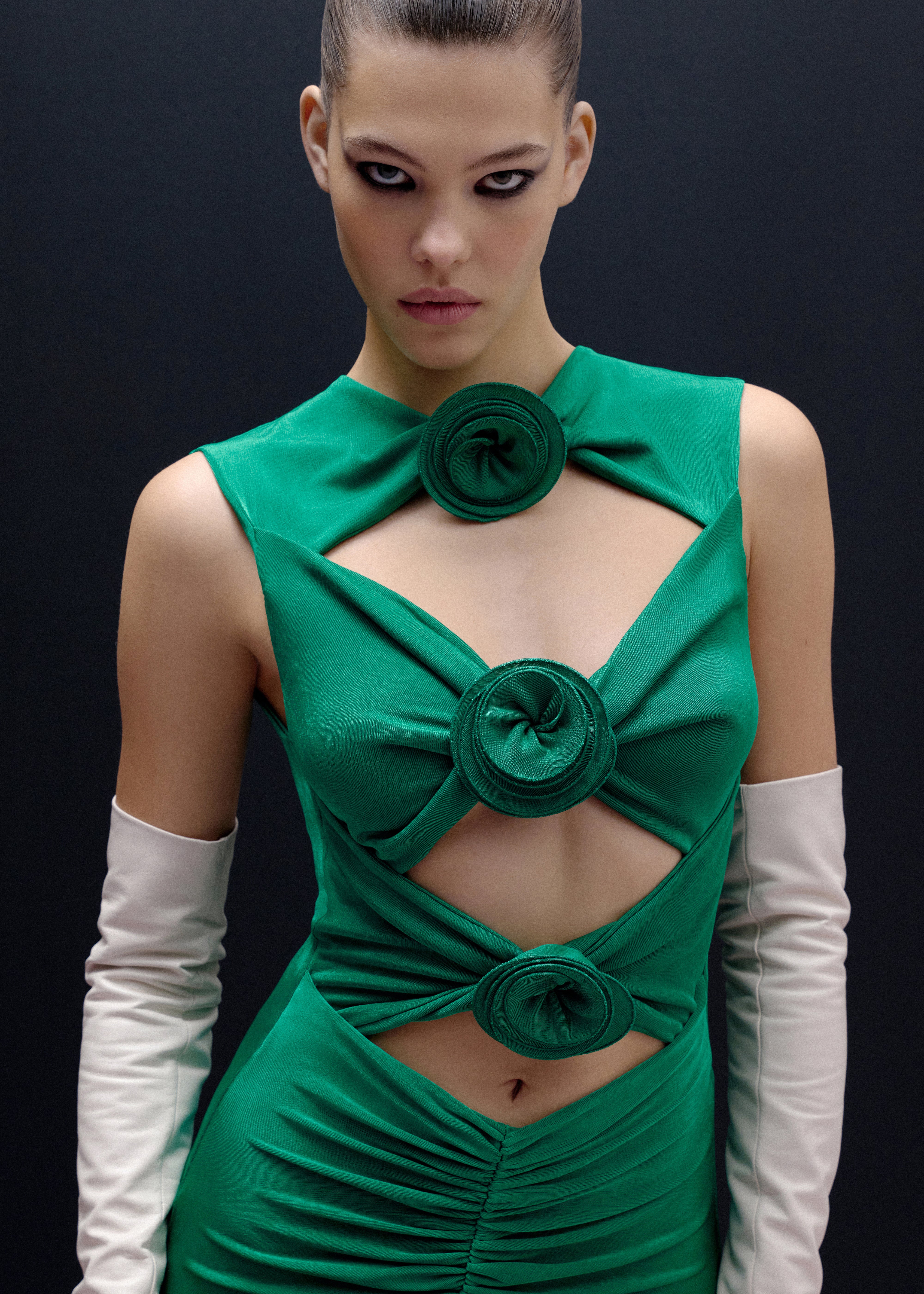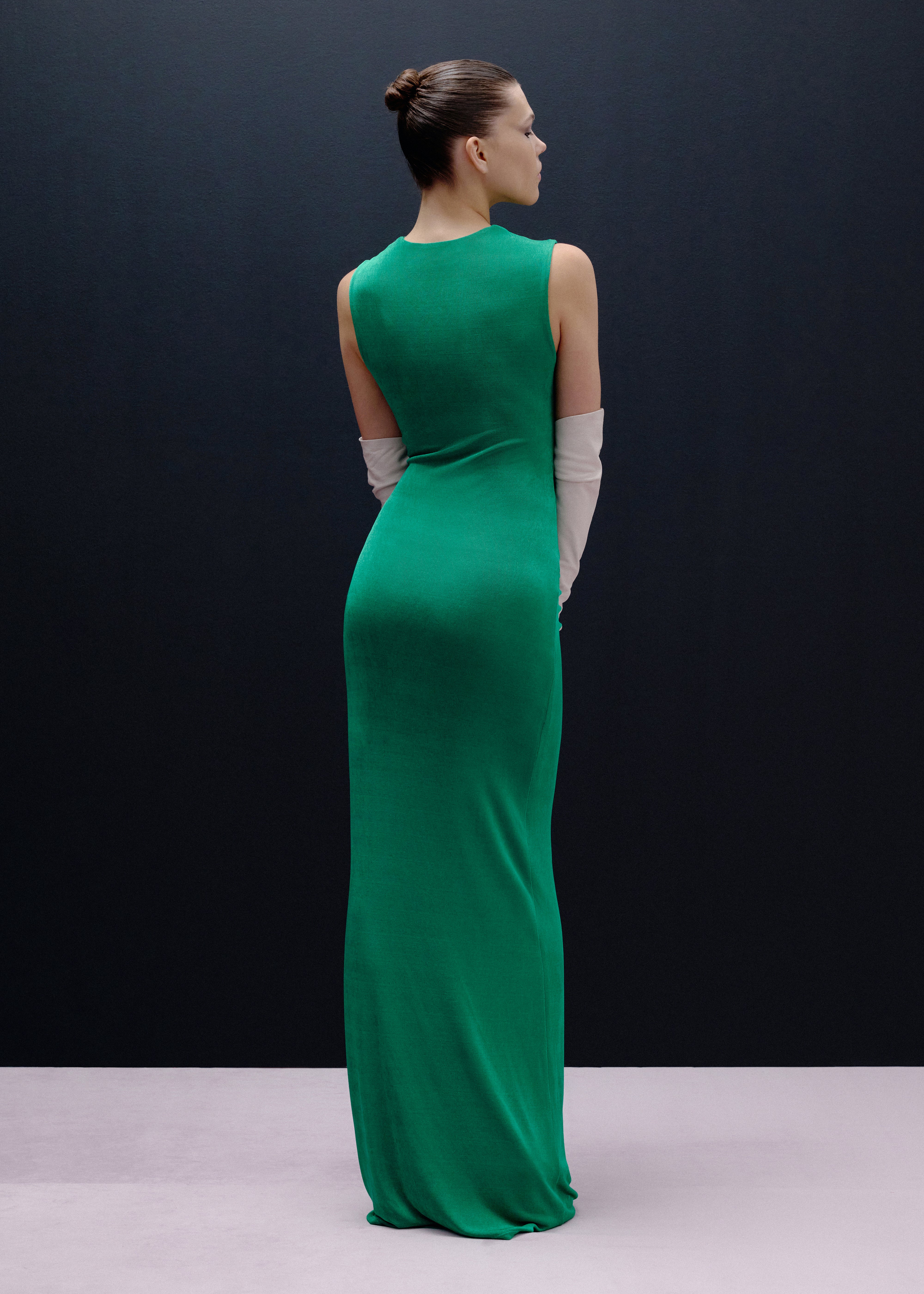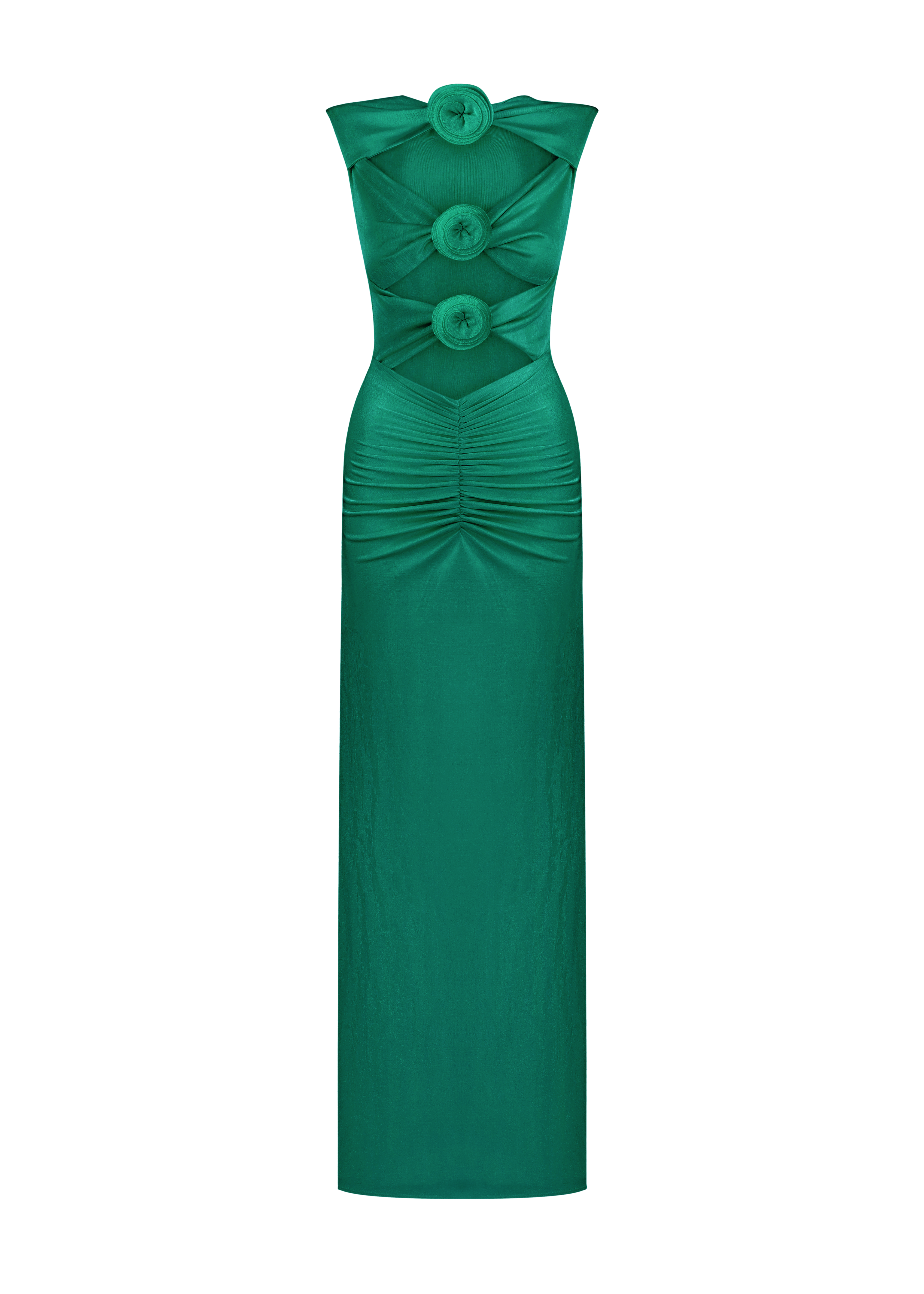 Сукня максі без рукавів має вирізи, прикрашені квітами ручної роботи, які додають вишуканості мінімалістичному дизайну. Ідеально підходить для тих, хто цінує невимушений стиль з унікальними акцентами.