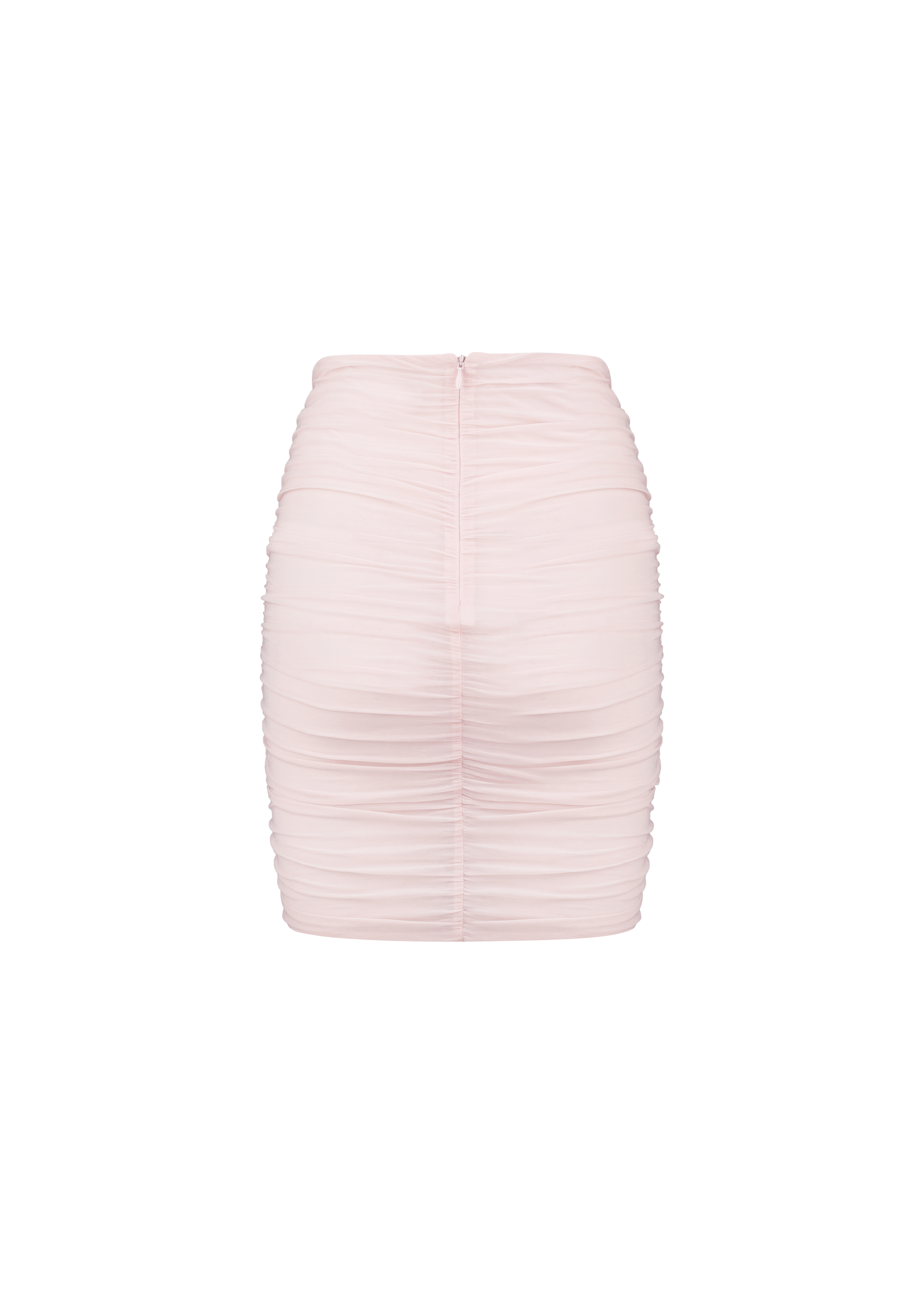 Міні-спідниця облягаючого крою. Виготовлена з напівпрозорої тканини, яка ідеально підходить для теплої погоди. Деталь з рюшами по центру спереду додає текстури та цікавості.